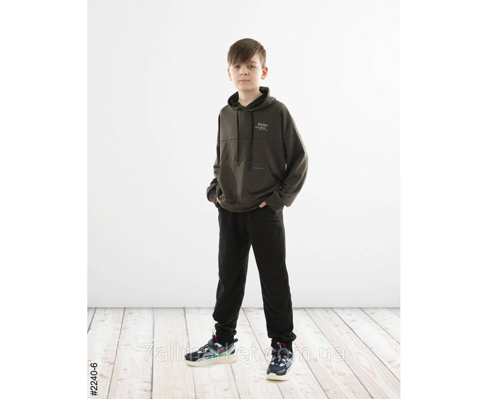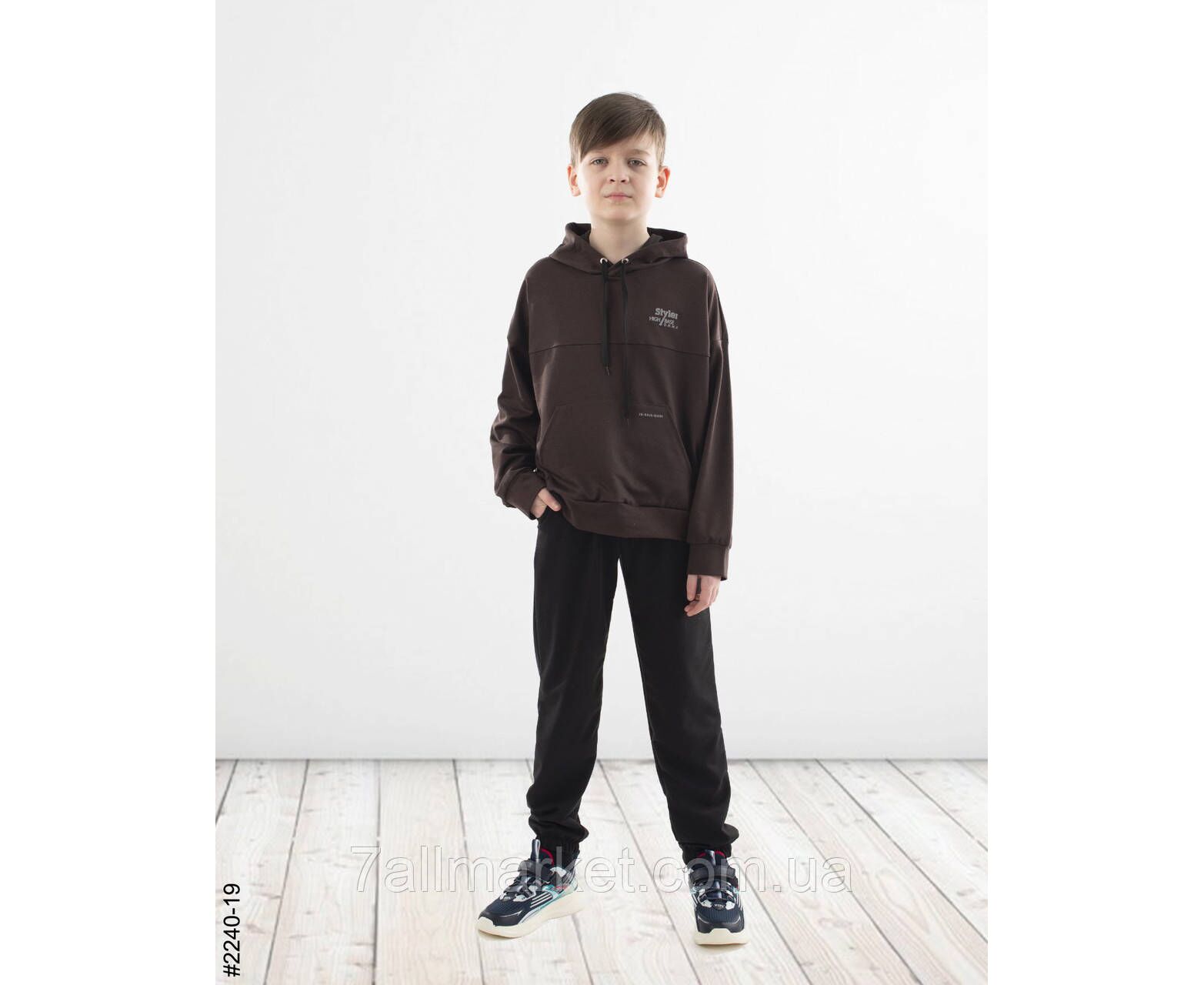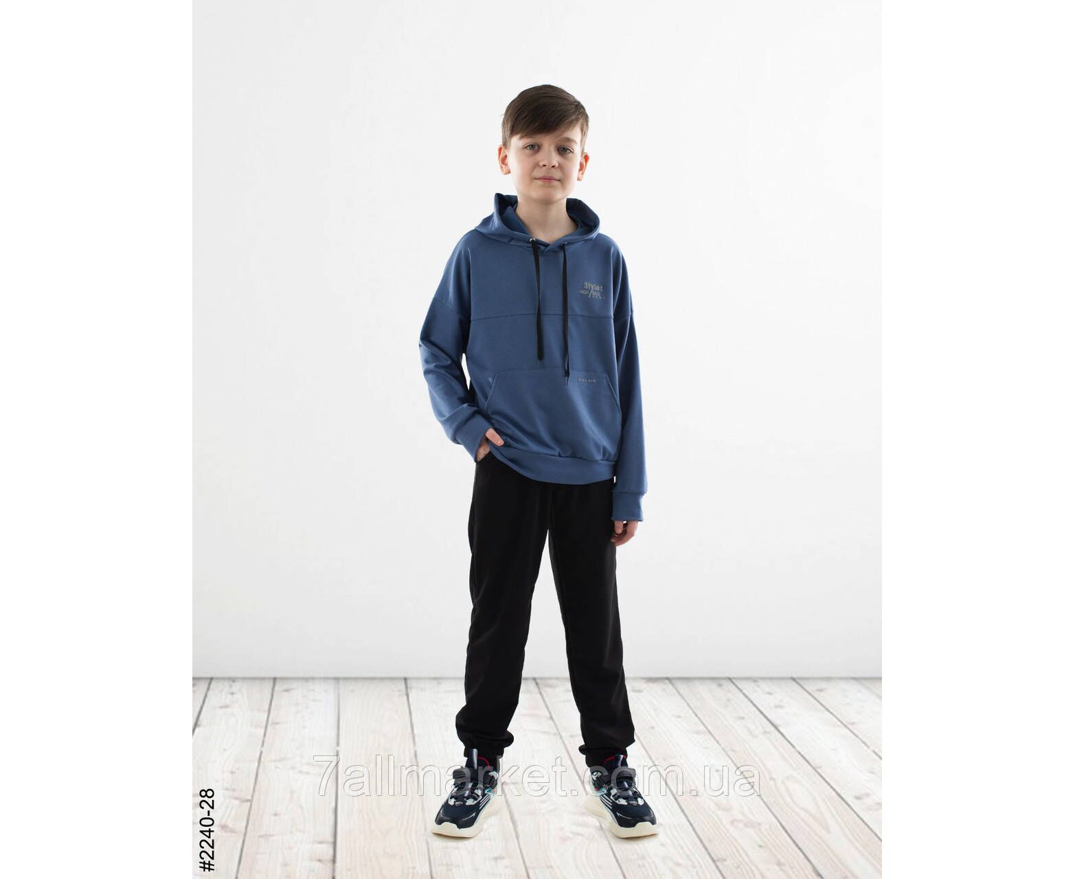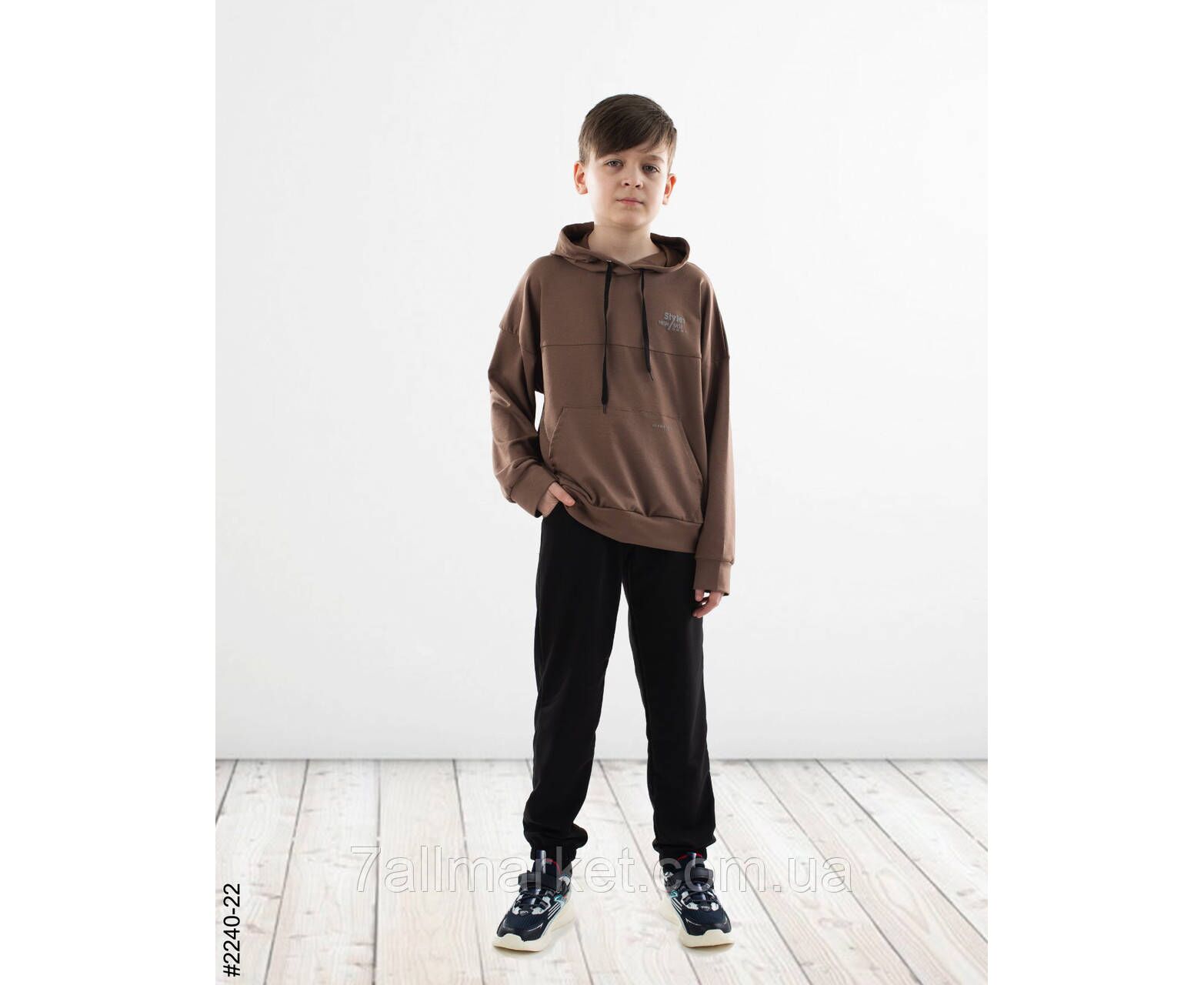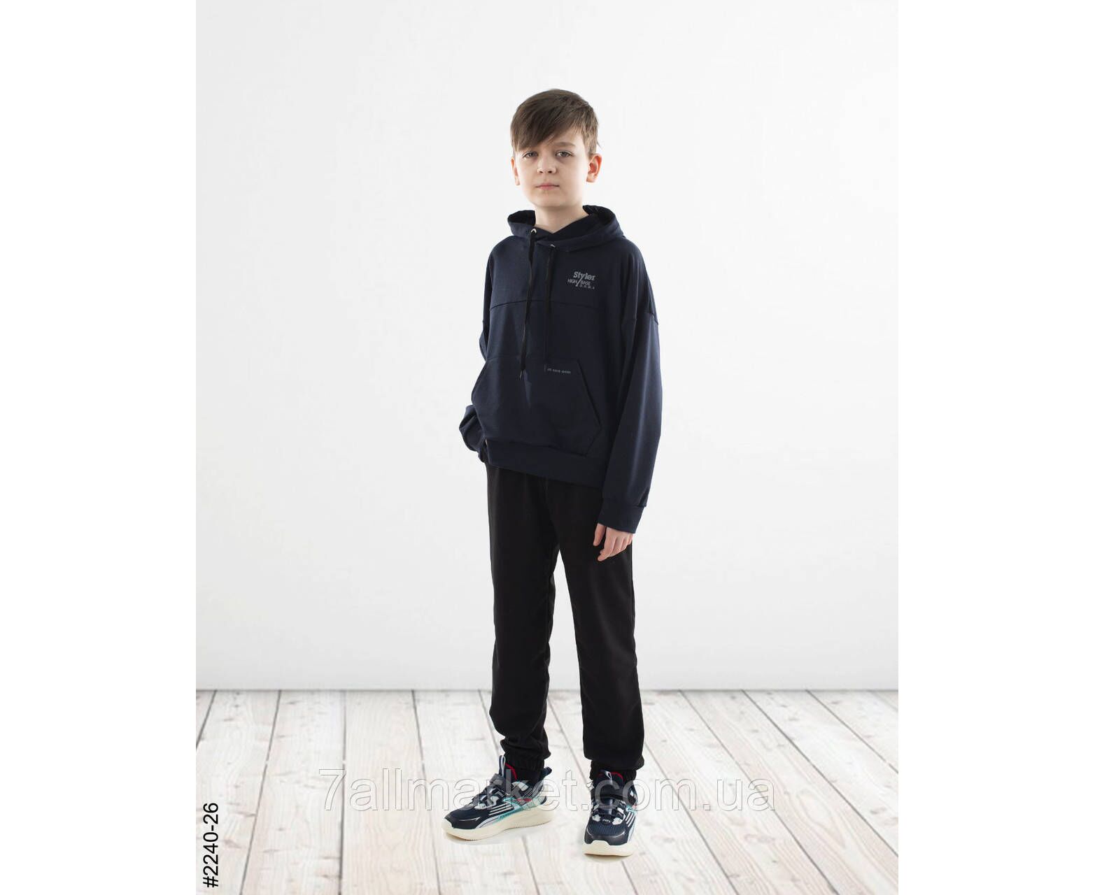 Спортивний костюм для хлопчиків. Верх — худі з капюшоном. Низ — чорні джоггери з комфортною широкою резинкою в поясі. Гарне лекало, стильна повномірна модель.