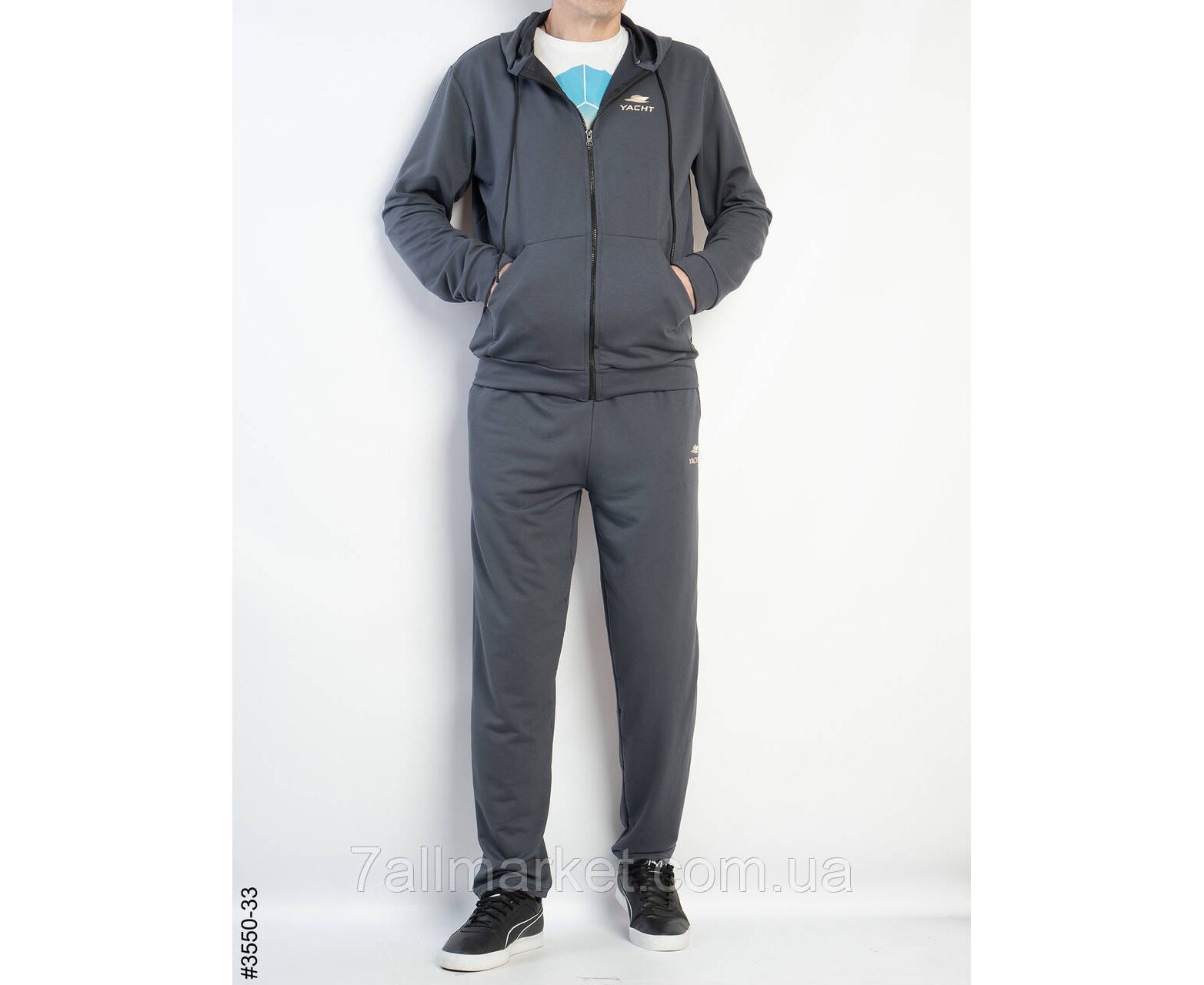 Мужской спортивный костюм. Верх - кофта на молнии с капюшоном. Низ – прямые брюки, с широким поясом на резинке и боковыми карманами.