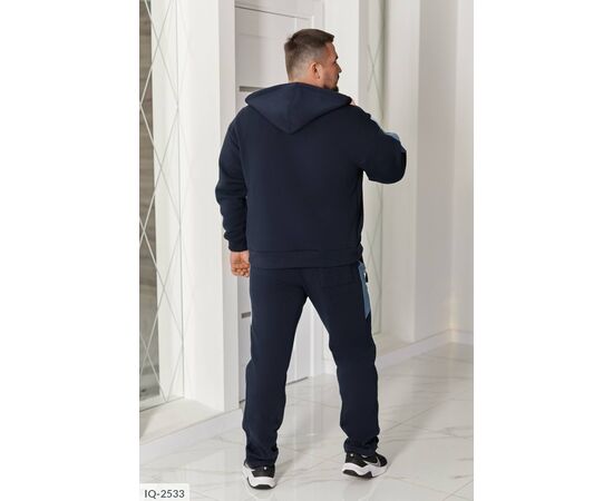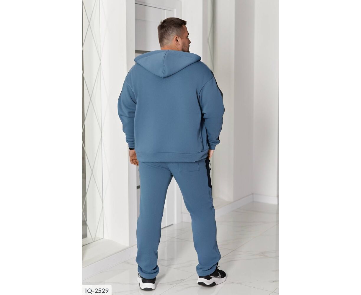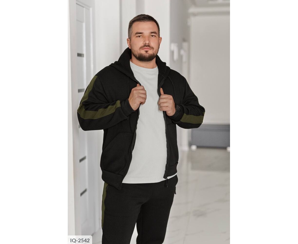 Худые прямого силуэта, имеет удобный капюшон со шнурками и центральную молнию. Два кармана кенгуру придают практичности. Низ изделия и рукавные манжеты на широком трикотажном манжете. Контрастные лампасы на рукавах и брюках делают образ выразительным и современным.