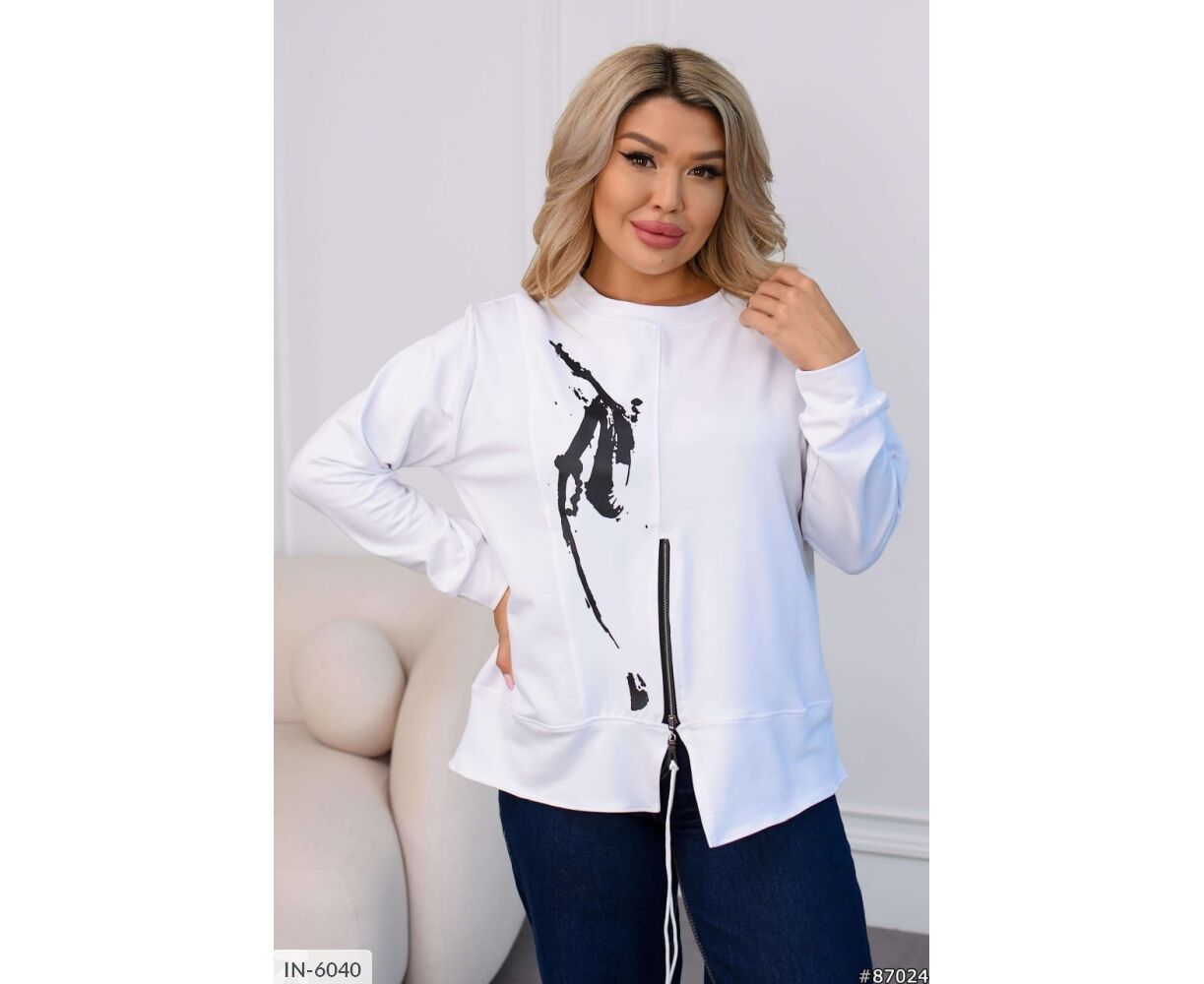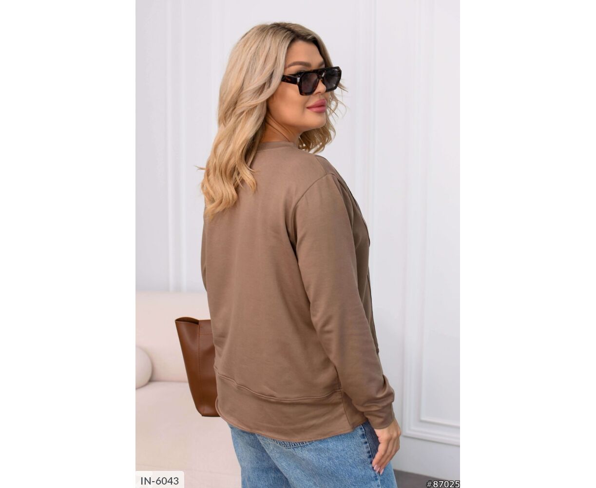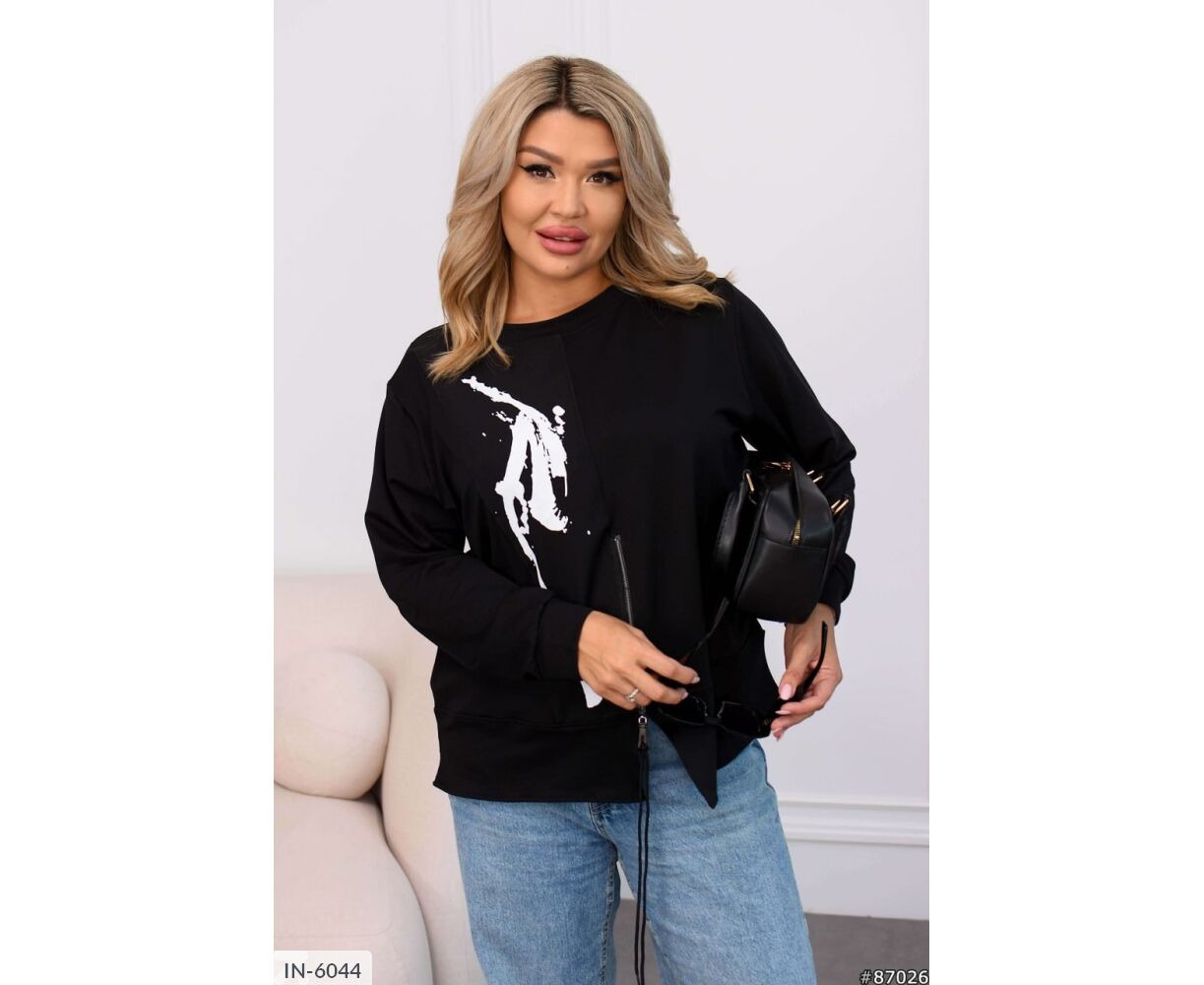 Кофта интересного кроя: посередине рабочая молния с канатом в цвет основания, на груди вставка с накатом, рукава на манжете.