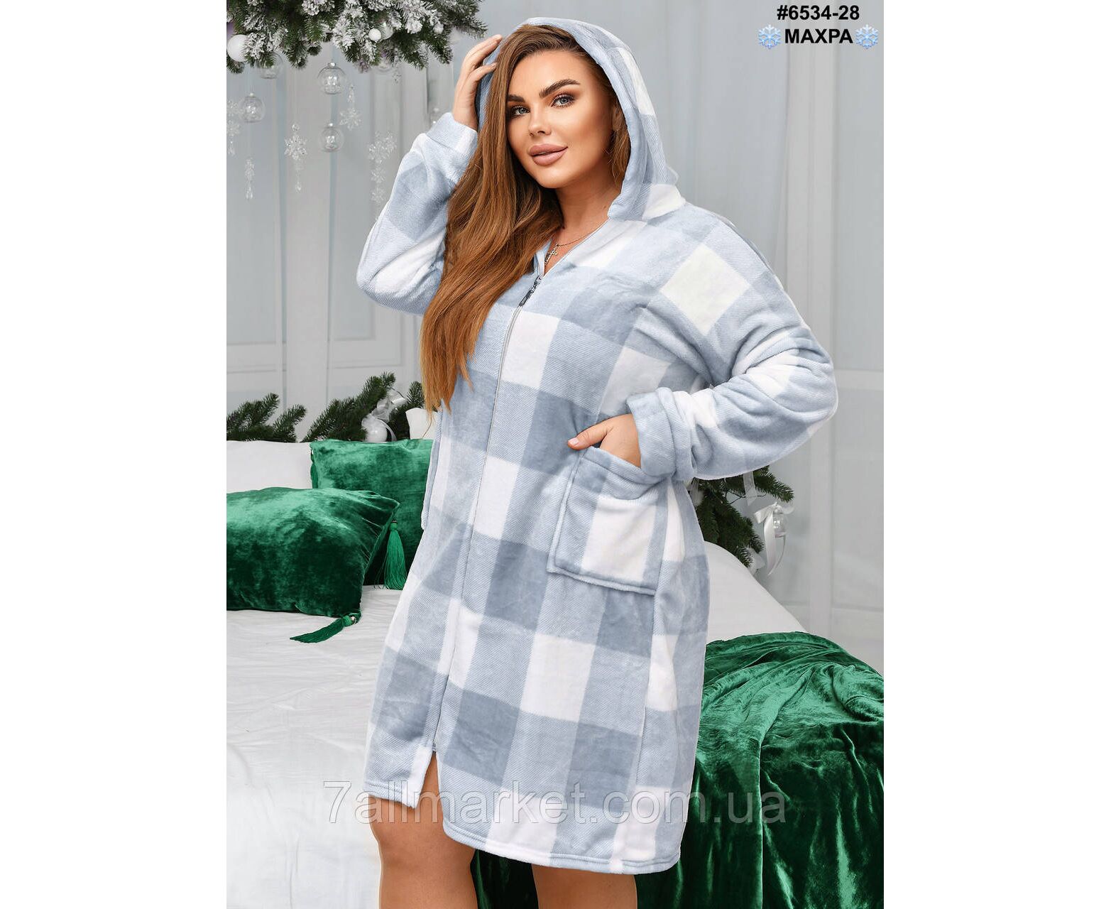 Махровий жіночий халат на блискавці; оснащений поясом для додаткової фіксації, капюшоном та двома кишенями. Тепла зручна модель для дому.