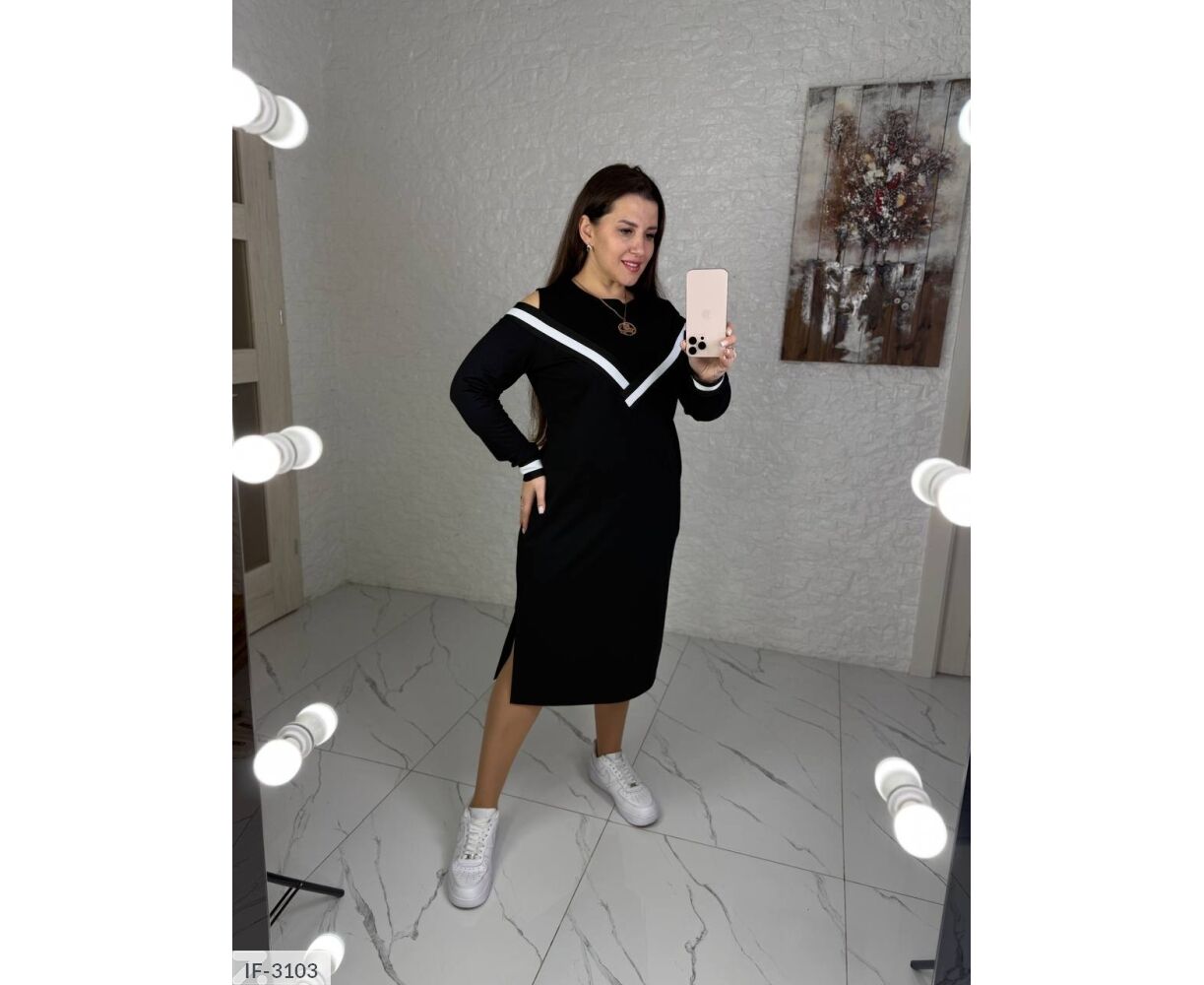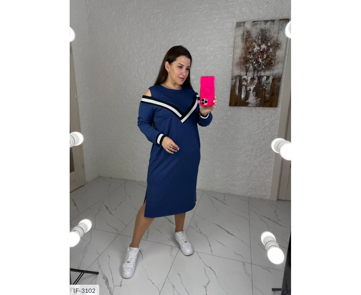 Платье немного свободного кроя в талии, интересная имитация майки и накидки, украшена широким лампасом спереди и по спинке v-образным вырезом. Длинные рукава по низу лампас. Удлиненное платье ниже колена, по бокам разрезы