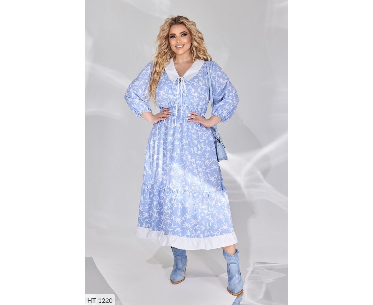 Платье с воротничком, на груди завязывается на бант, талия на резинке, по бокам имеет карманы.