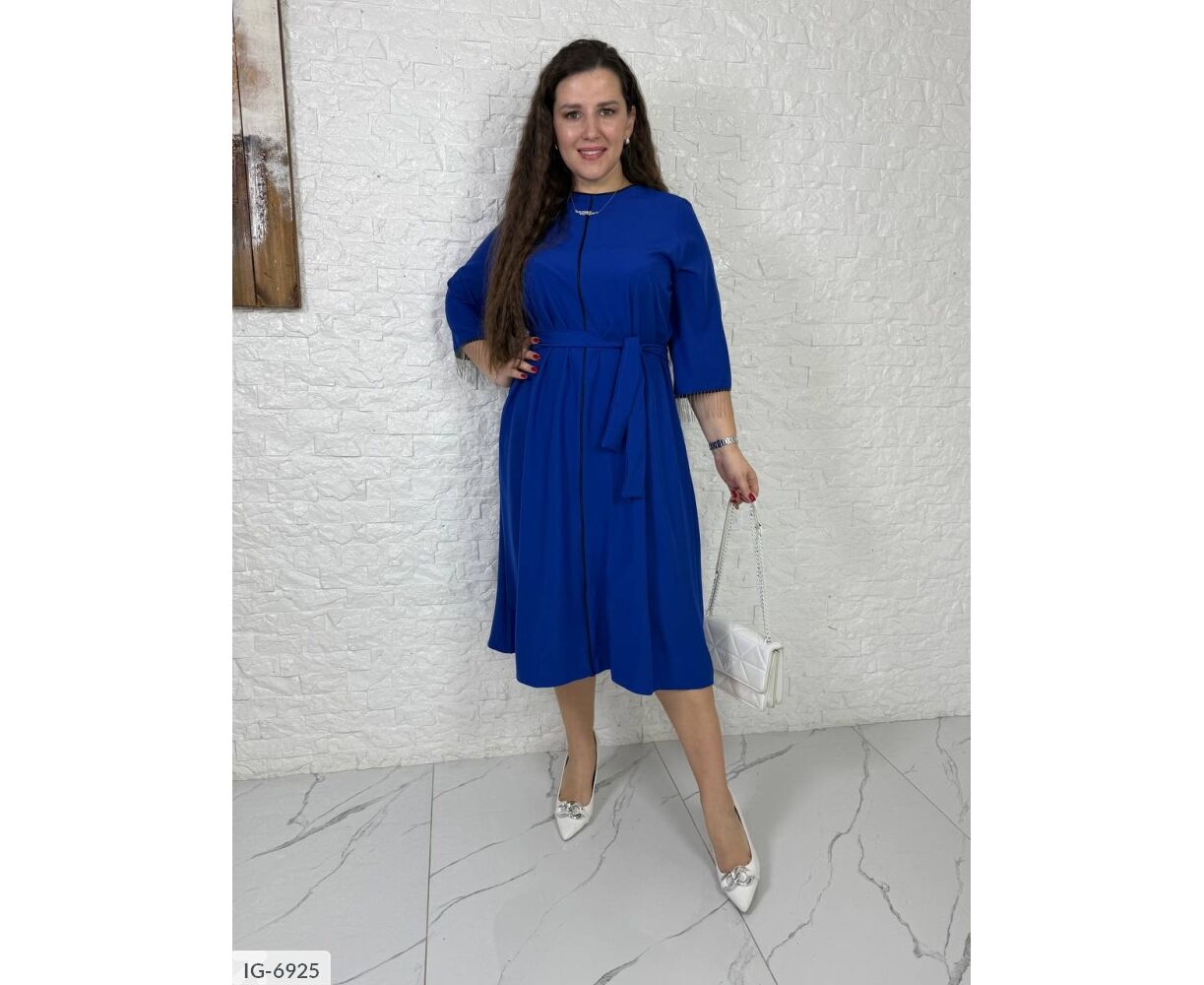 Платье свободного кроя, украшенное металлической бахромой на рукавах и черным кантом, который делает силуэт более утонченным. Рукав прикрывает локоть, длина платья ниже колен. Пояс в комплекте, можно корректировать талию.