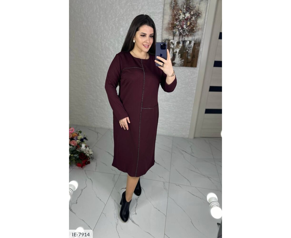 Классическое, базовое, удлиненное платье, украшенное кантом, который подчеркивает фигуру, длинный рукав, по бокам карманы.