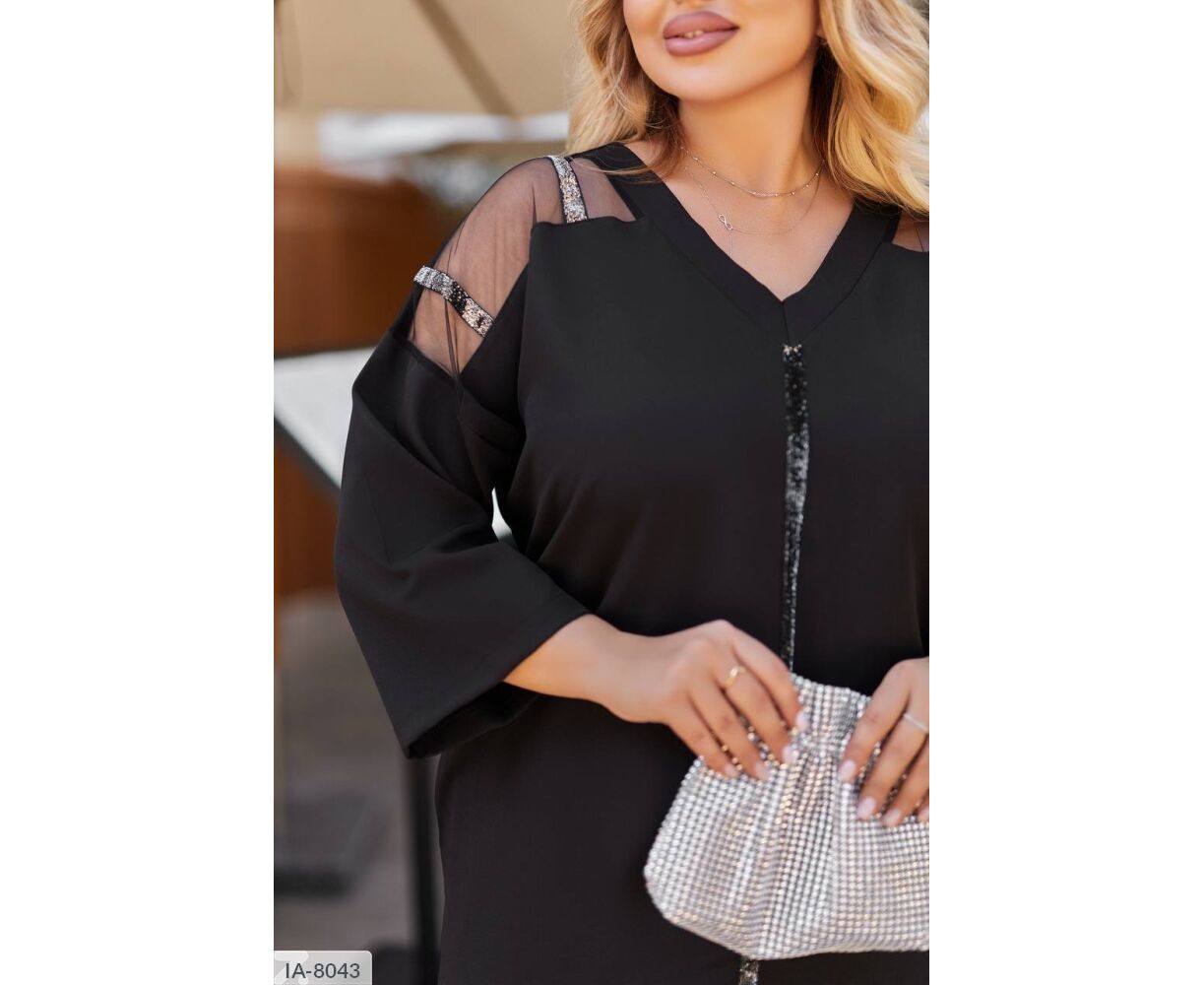 Платье свободного кроя, рукав три четвертых, по бокам карманы, на плечах декоративная сетка, платье украшено бархатной лентой на плечах и спереди.