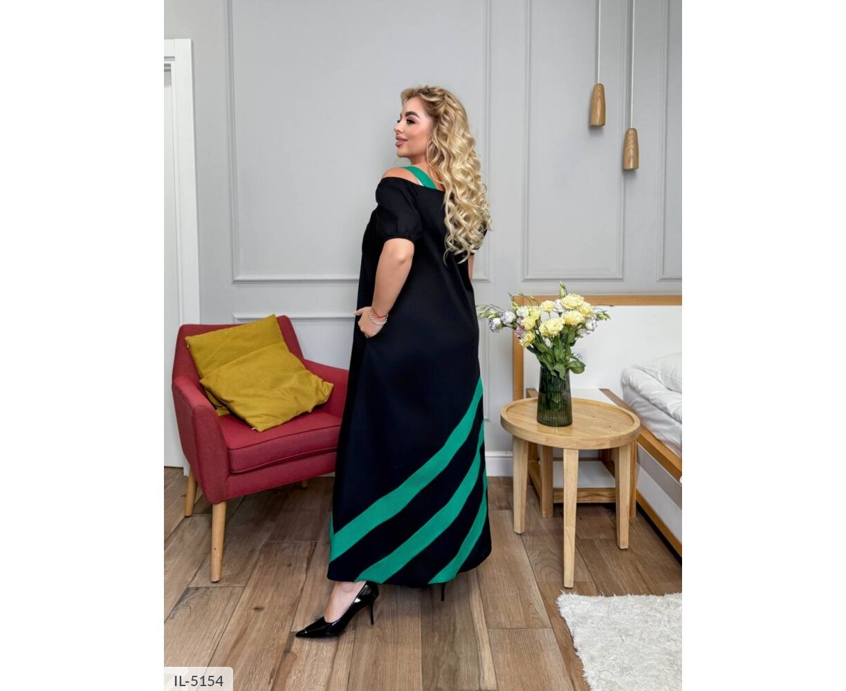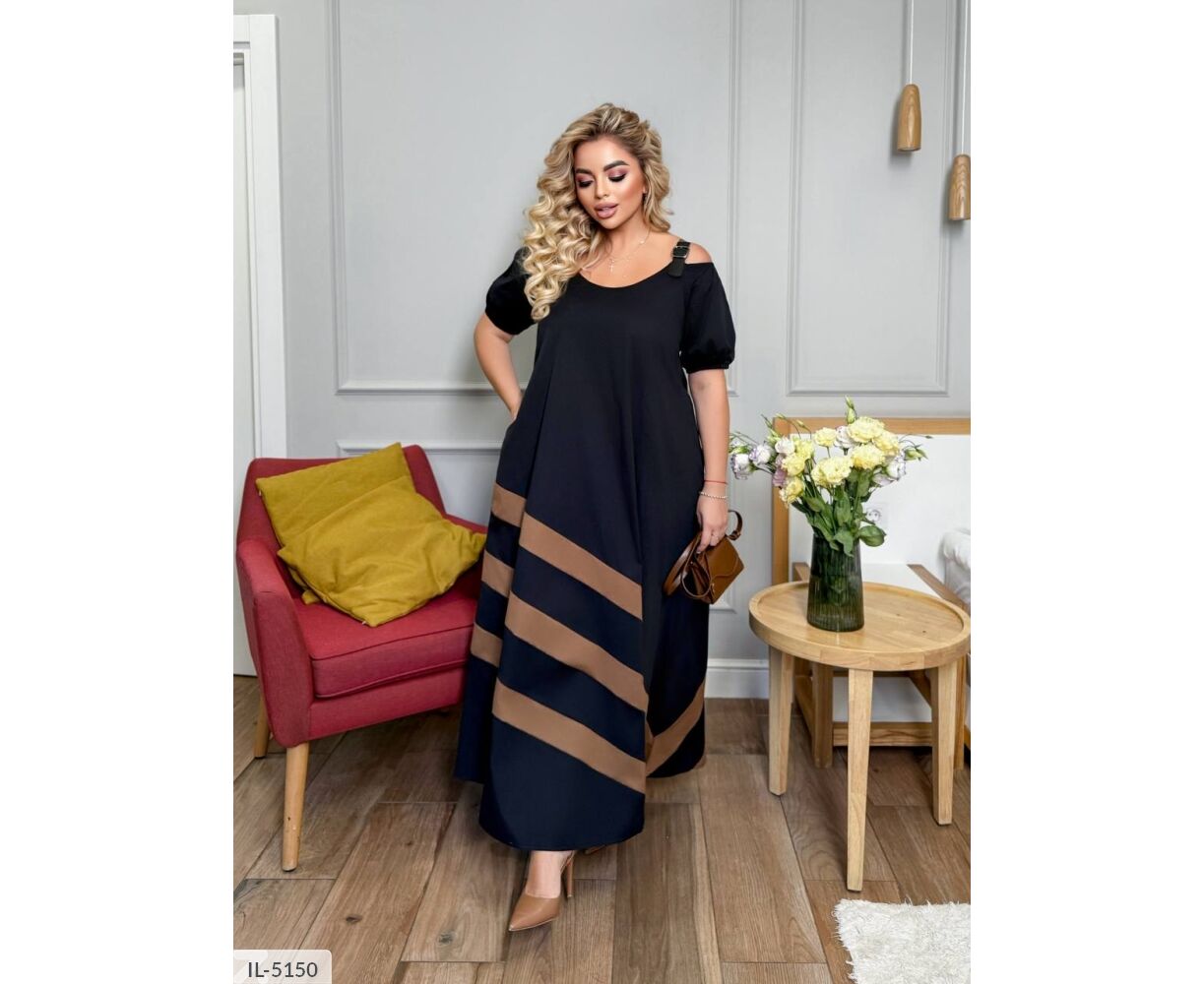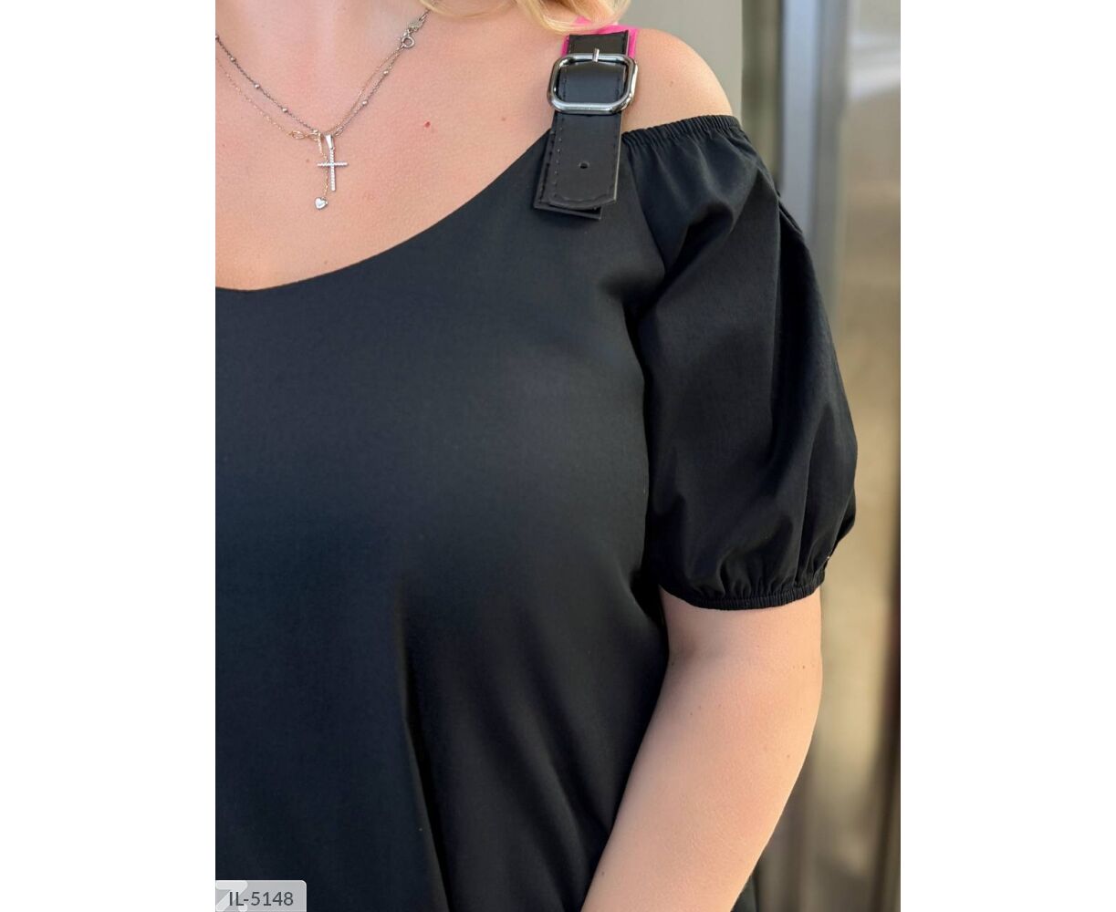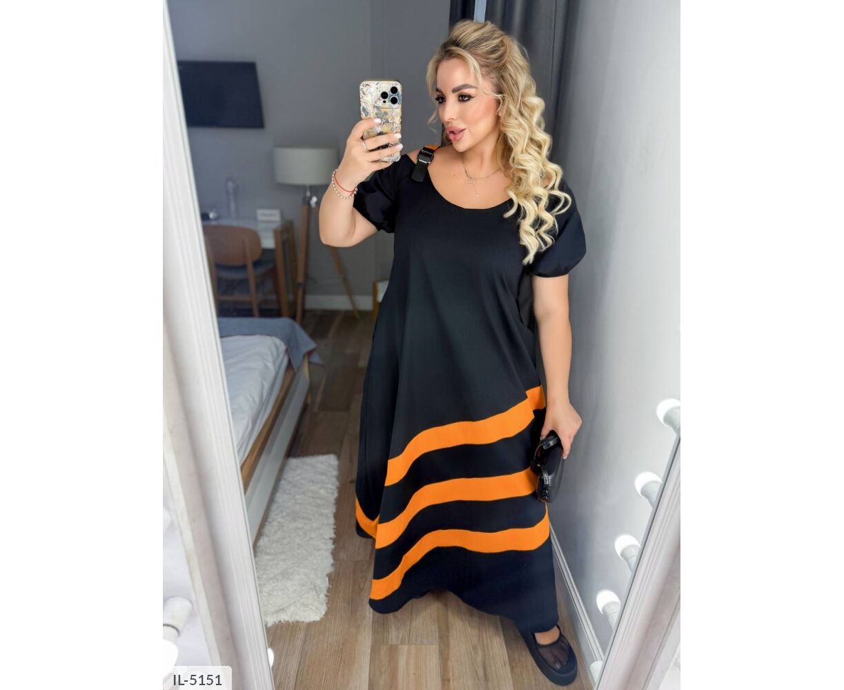 Платье свободного кроя с интересными элементами: на плечах застежки из кожи (регулируется длина лямок). По низу платья спереди и сзади, на плечах цветные вставки. Рукава ниже локтя на резинке.