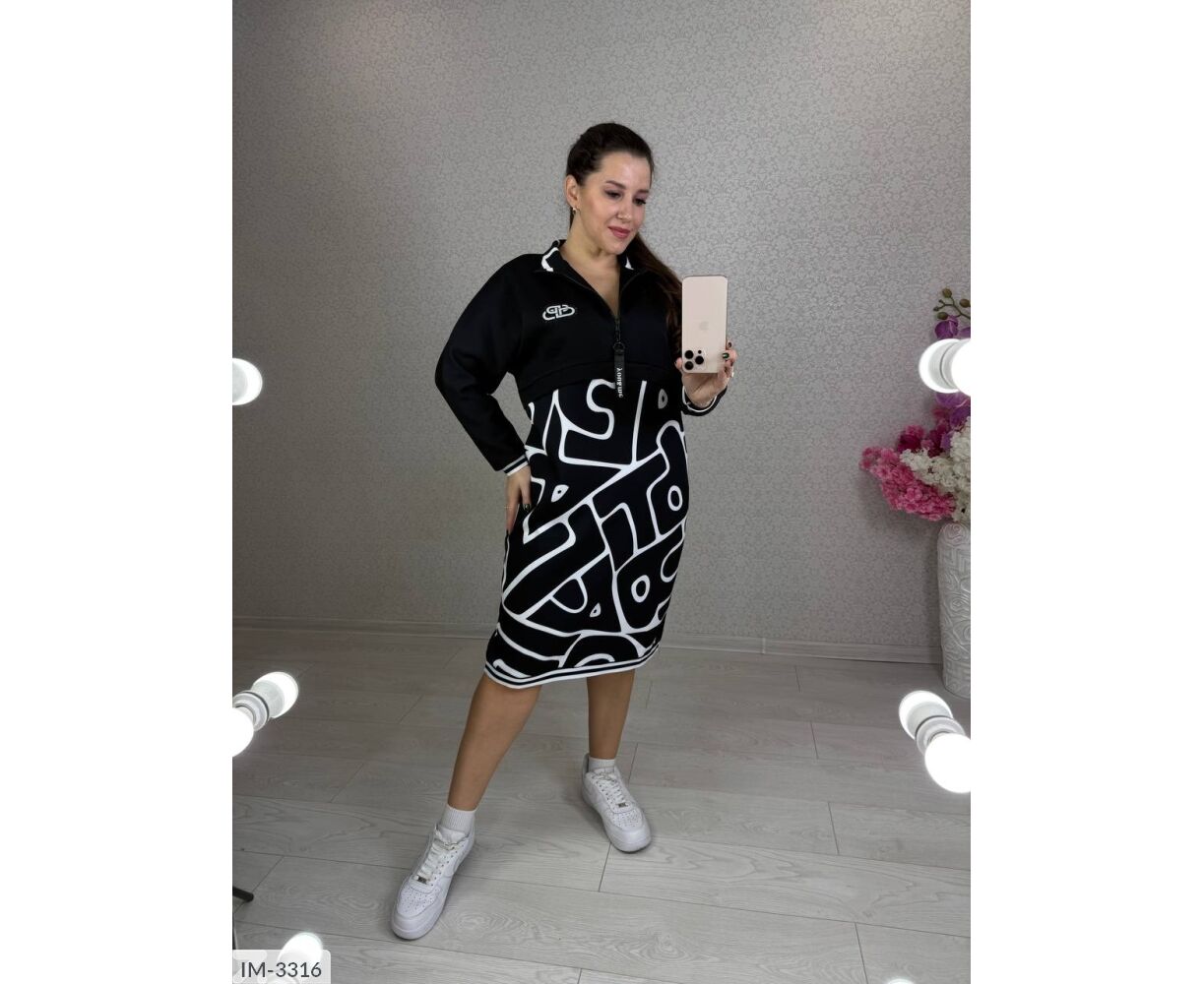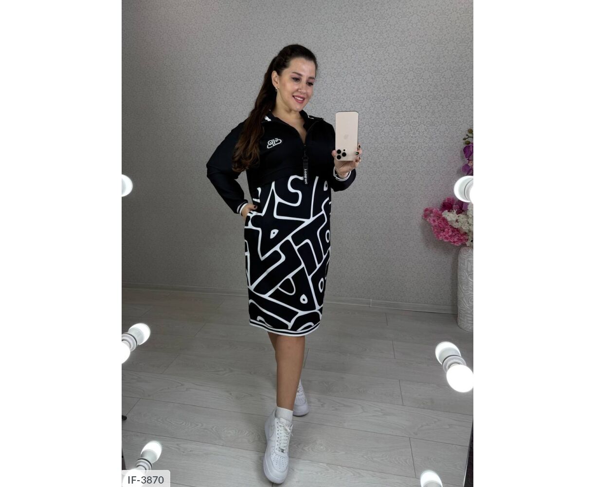 Платье спорт шик, удачная комбинация однотона с принтом, делает изделие изящным и оригинальным, привлекает взгляды. Рукава и низ украшены черно-белыми лампасами, горловина стойка на молнии с карабином (внутренняя часть горловины украшена принтом с буквами), на груди накат с камешками, по бокам два кармана. Рукав-реглан свободного кроя. Платье интересного кроя: планочка спереди и сзади, подчеркивает ваши прелести и скрывает лишние объемы на талии.