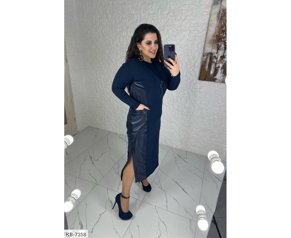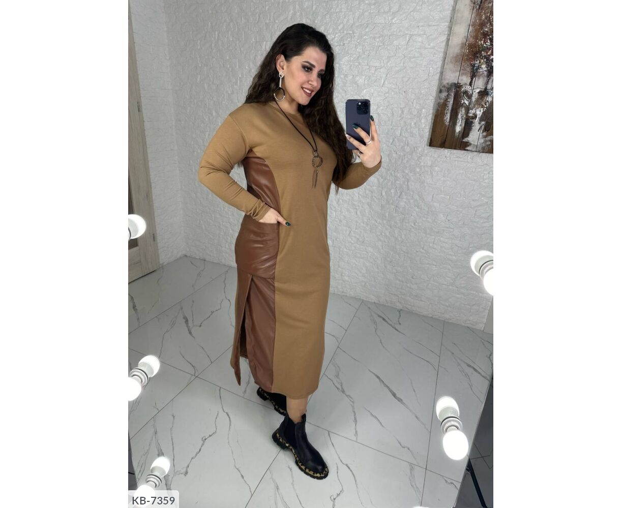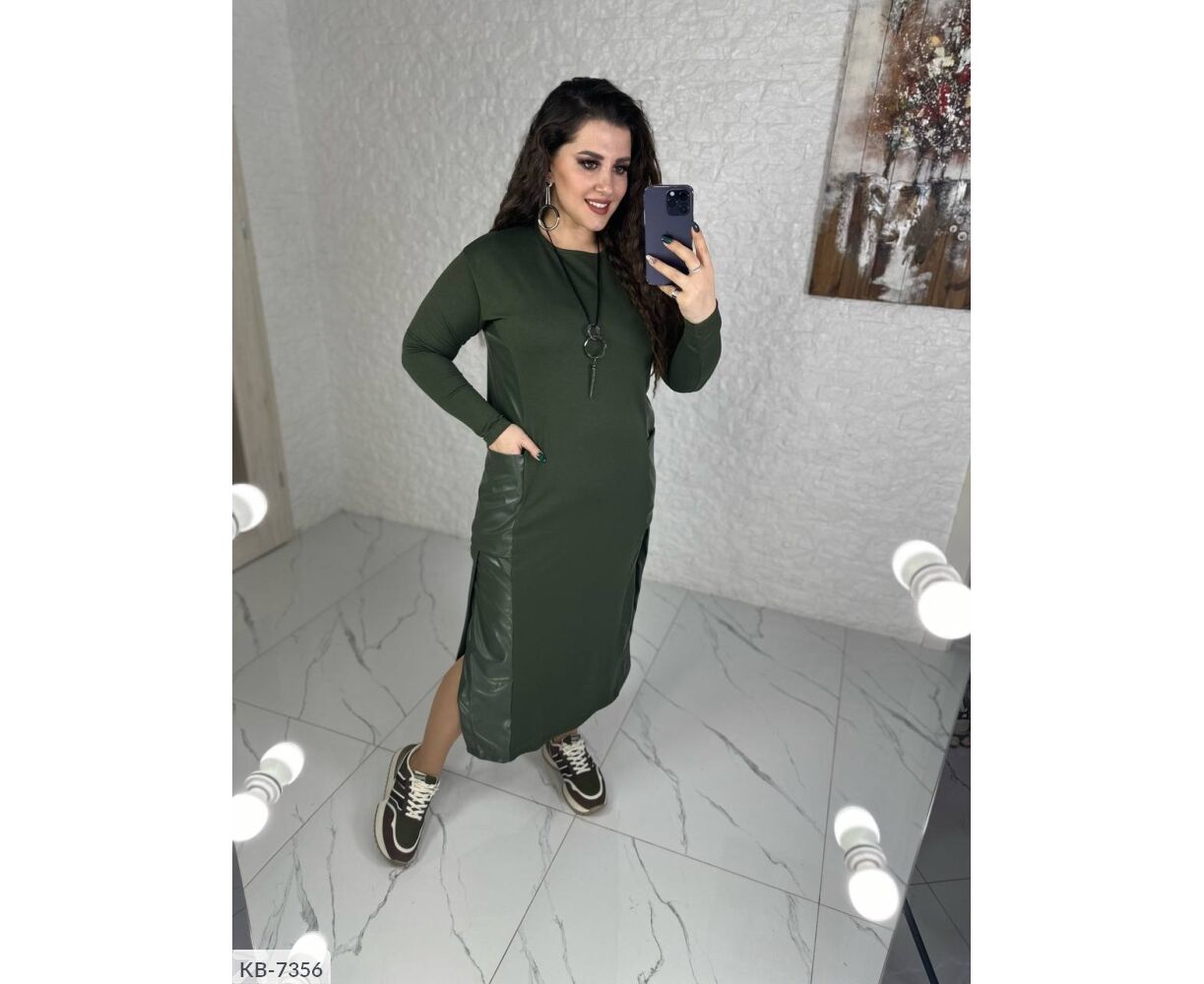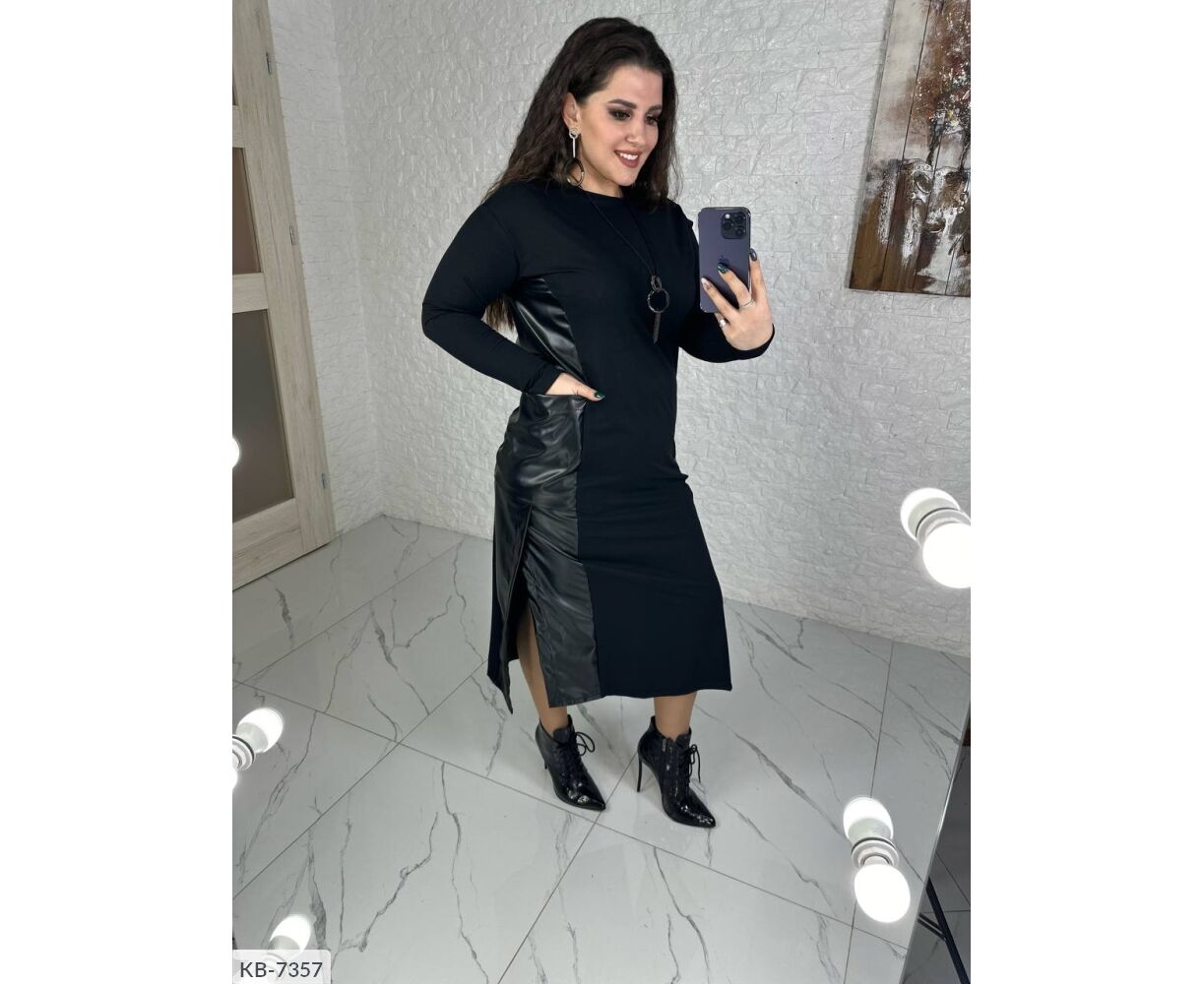 Свободное платье, по бокам кожаные вставки с разрезами + карманы, длинный рукав, украшение в комплекте ( может отличаться от фото и видео)