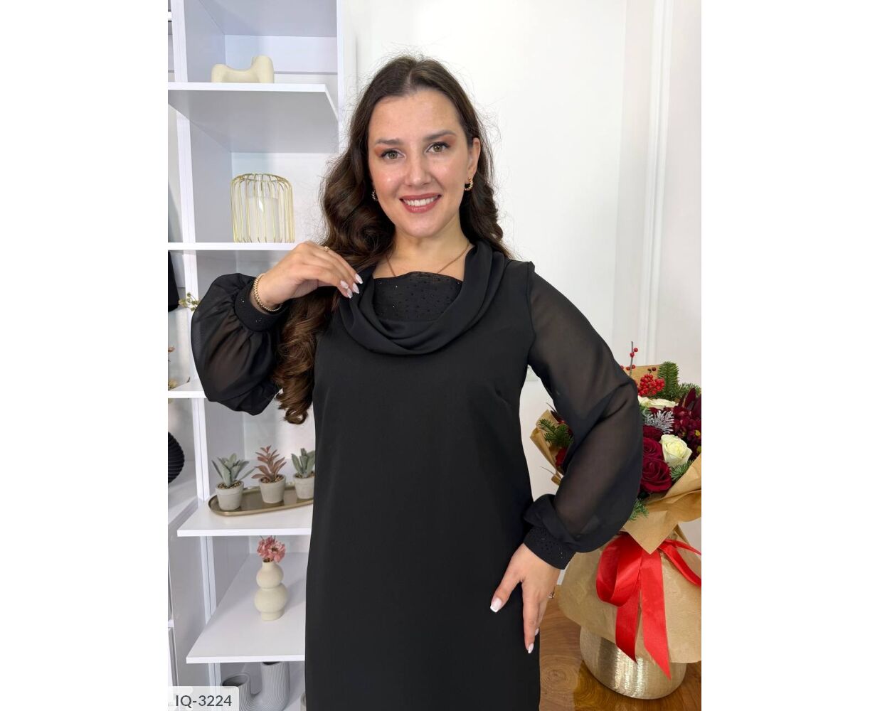 Платье интересного кроя, украшенное камешками на груди и рукавах. По спинке молния, рукава и на горловине шифон