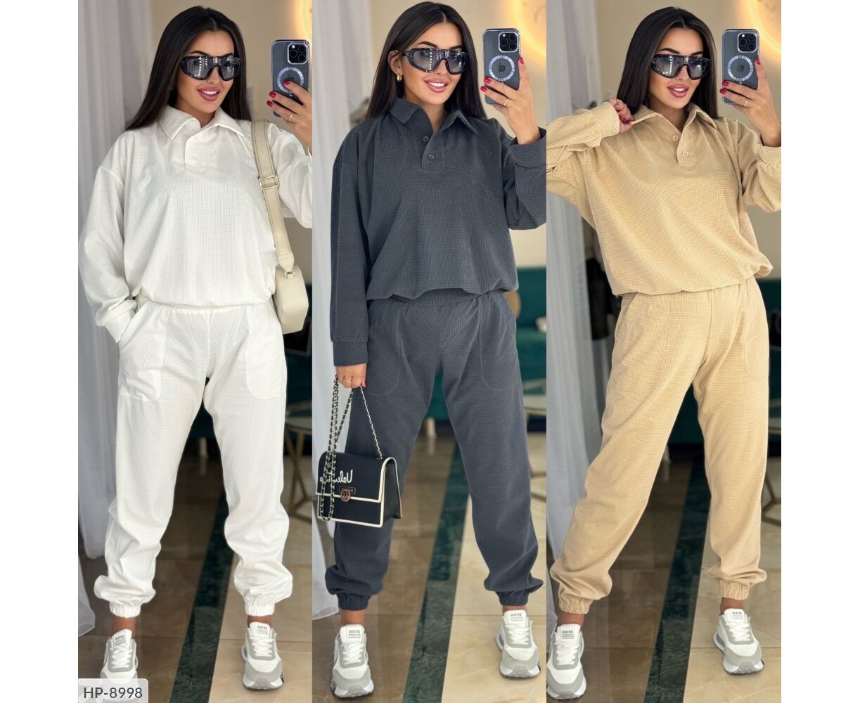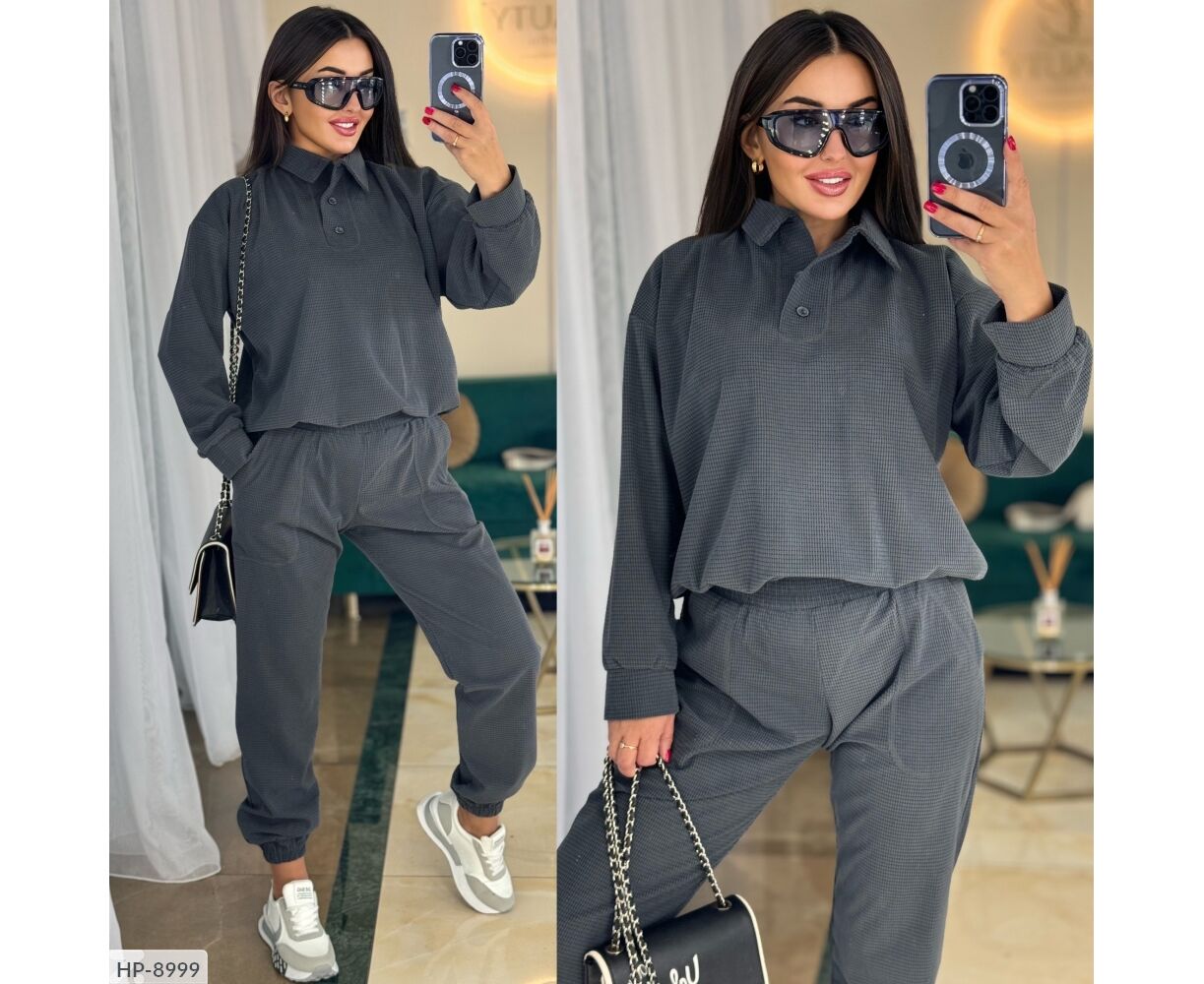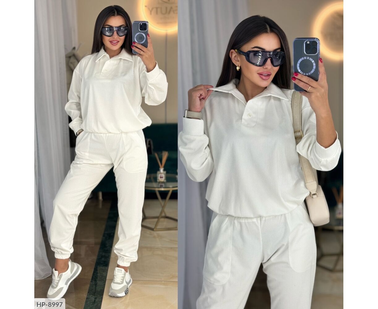 Костюм-двойка свободного кроя, кофта с воротником с декоративным швом, спереди на двух пуговицах, рукав на манжетах, низ кофты на резинке, свободные брюки на широкой резинке, по бокам два широких кармана с декоративным швом, по низу брюки на резинке. Параметры модели-нормы ОГ 95, ОТ 65, ОС 95, рост 170см, на ней 42-44, параметры модели- баталу ОГ 108, ОТ 86, ОС 108, рост 165см, на ней свободно сидит размер 50-52.