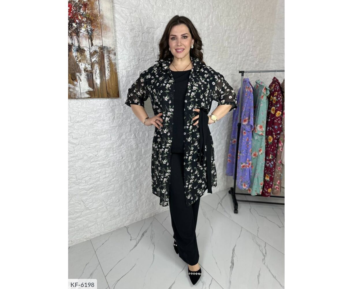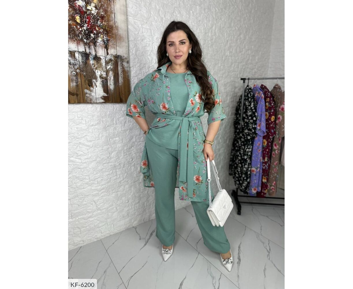 Костюм-тройка, все три детали гардероба возможно носить отдельно: на блузе с обеих сторон разрезы, брюки-клеш на широкой резинке, по бокам карманы, удлиненная рубашка из шифона ( без пуговиц), фиксируется на талии поясом.