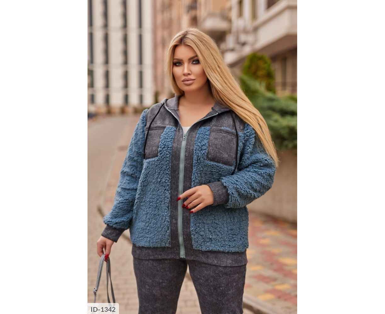 Бомбер-кофта свободного кроя, с капюшоном, спереди застежка молния, с накладными карманами на груди, также есть карманы в боковых швах, брюки высокой посадки в талии на резинке, с карманами, прямые.