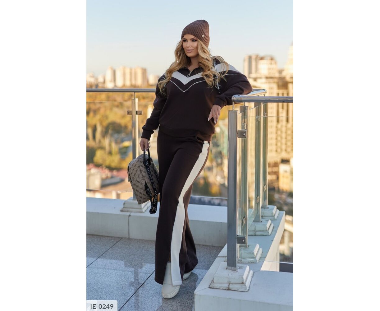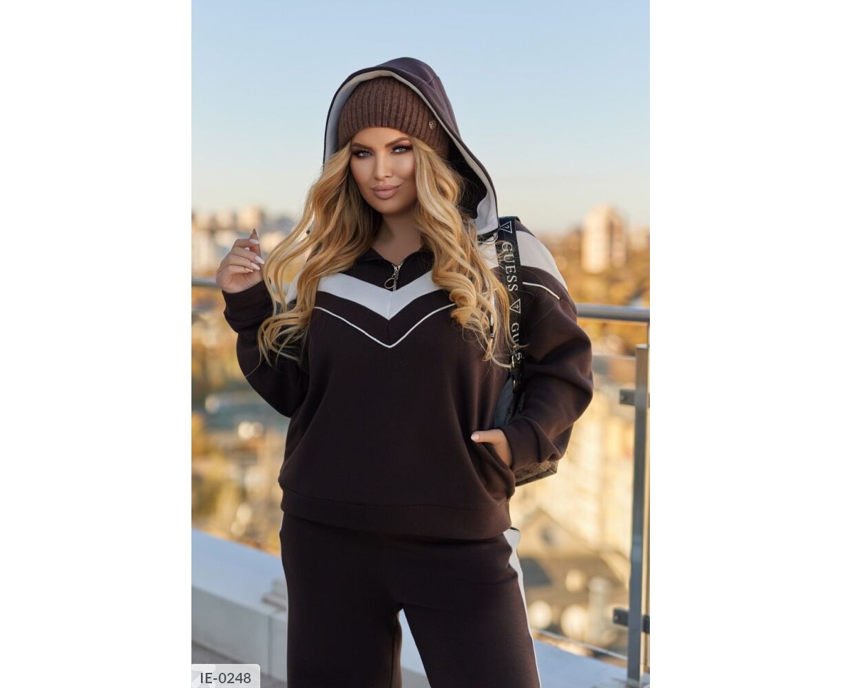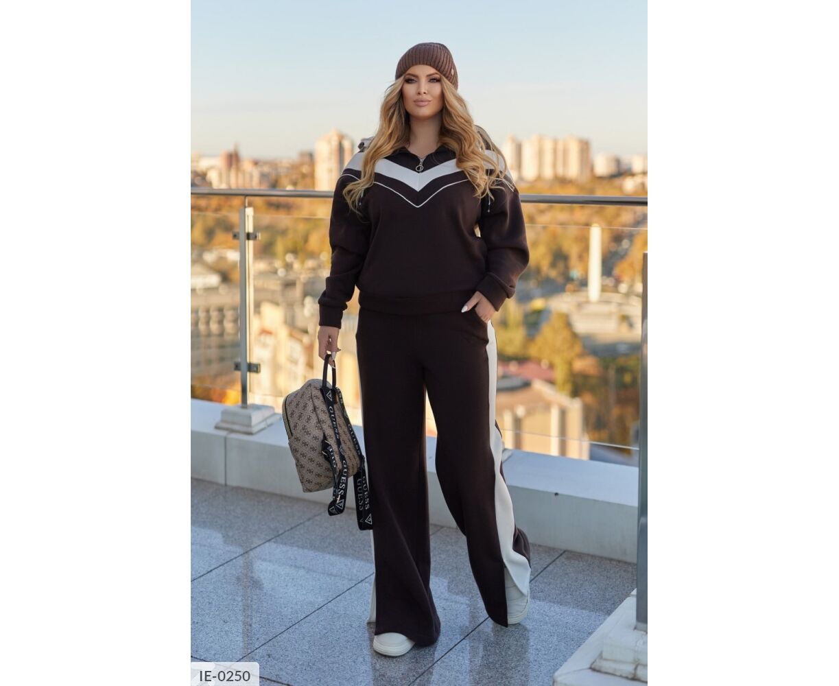 Худи на груди с молнией, с капюшоном. Костюм комбинированный. Брюки свободного кроя высокой посадки, с карманами, по бокам - лампасы, снизу - разрезы.