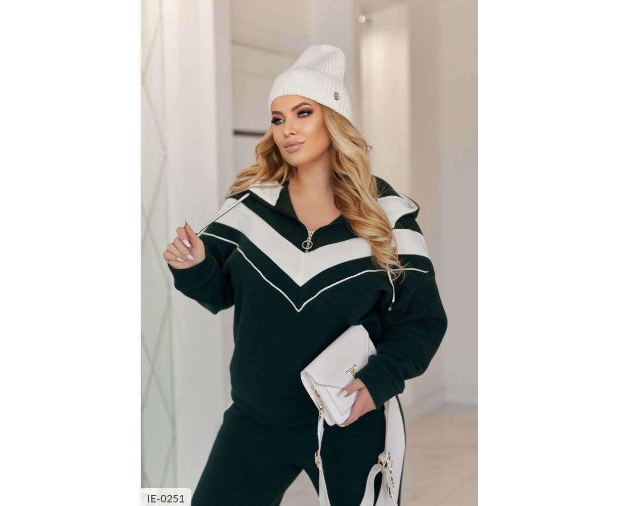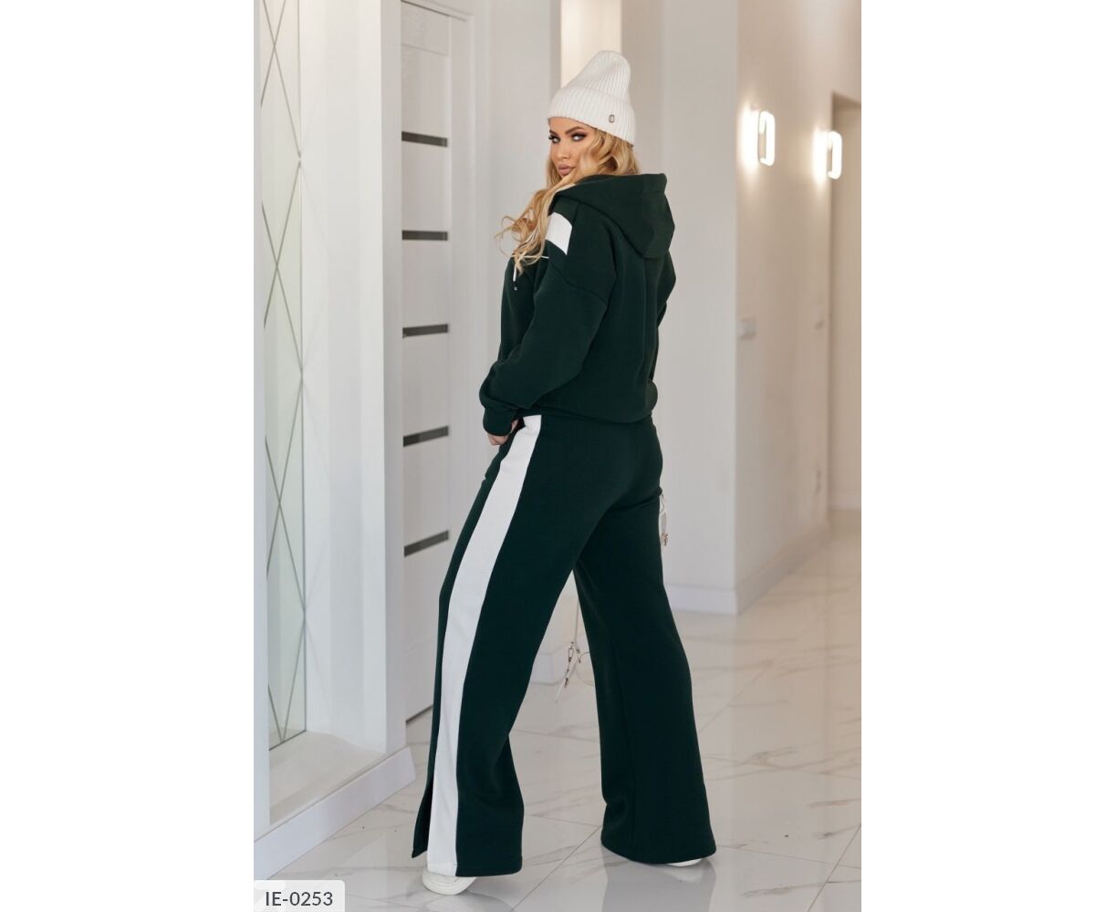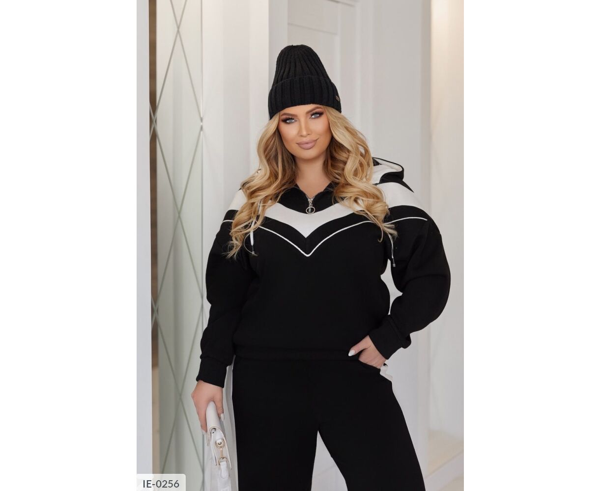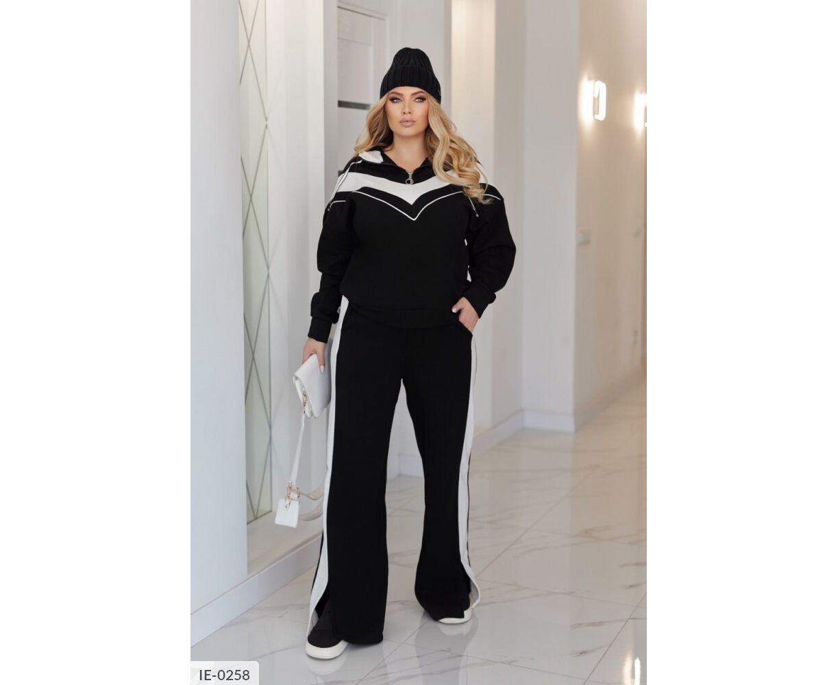 Худи на груди с молнией, с капюшоном. Костюм комбинированный. Брюки свободного кроя высокой посадки, с карманами, по бокам - лампасы, снизу - разрезы.