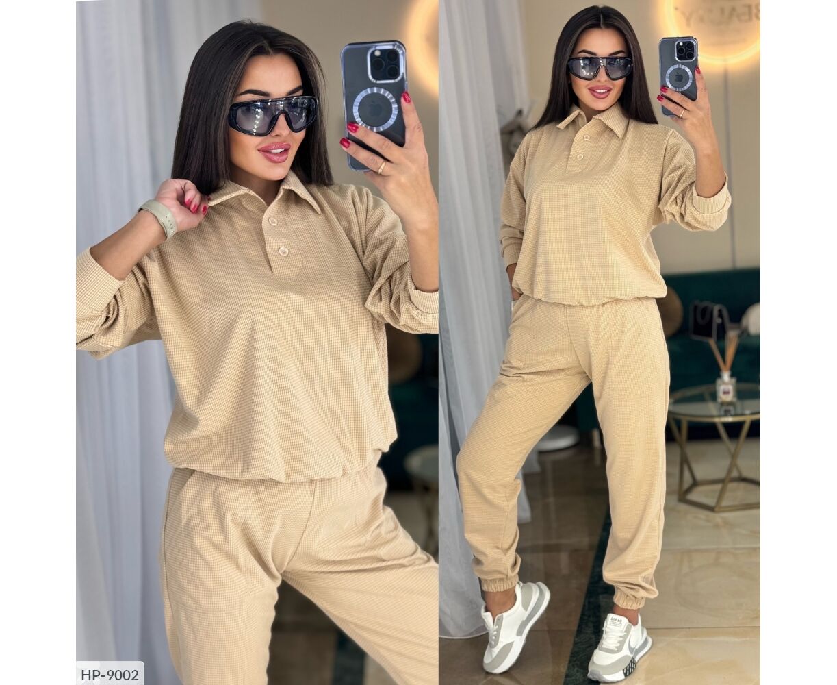 Костюм-двойка свободного кроя, кофта с воротником с декоративным швом, спереди на двух пуговицах, рукав на манжетах, низ кофты на резинке, свободные брюки на широкой резинке, по бокам два широких кармана с декоративным швом, по низу брюки на резинке. Параметры модели-нормы ОГ 95, ОТ 65, ОС 95, рост 170см, на ней 42-44, параметры модели- баталу ОГ 108, ОТ 86, ОС 108, рост 165см, на ней свободно сидит размер 50-52.