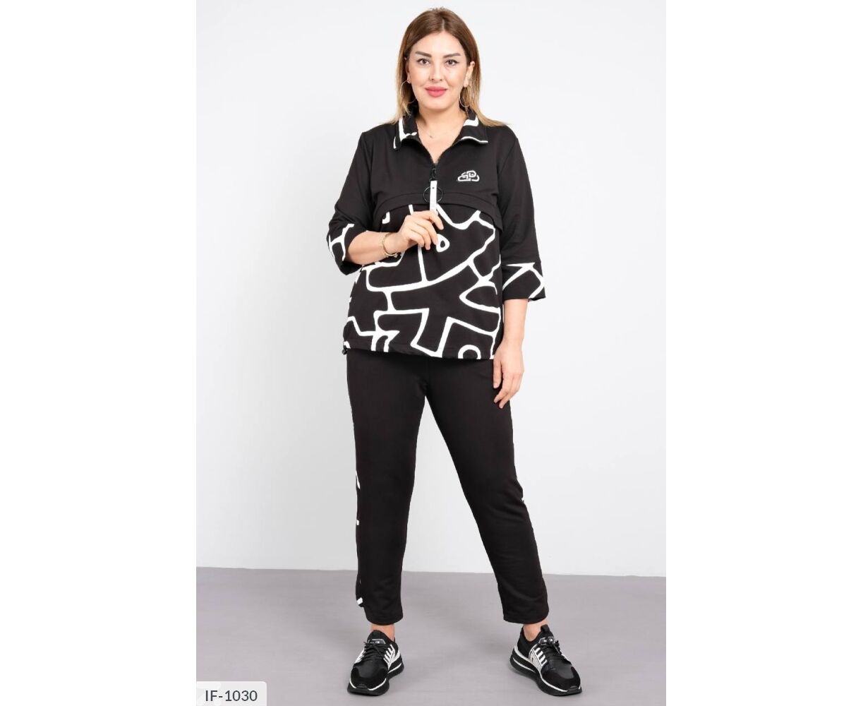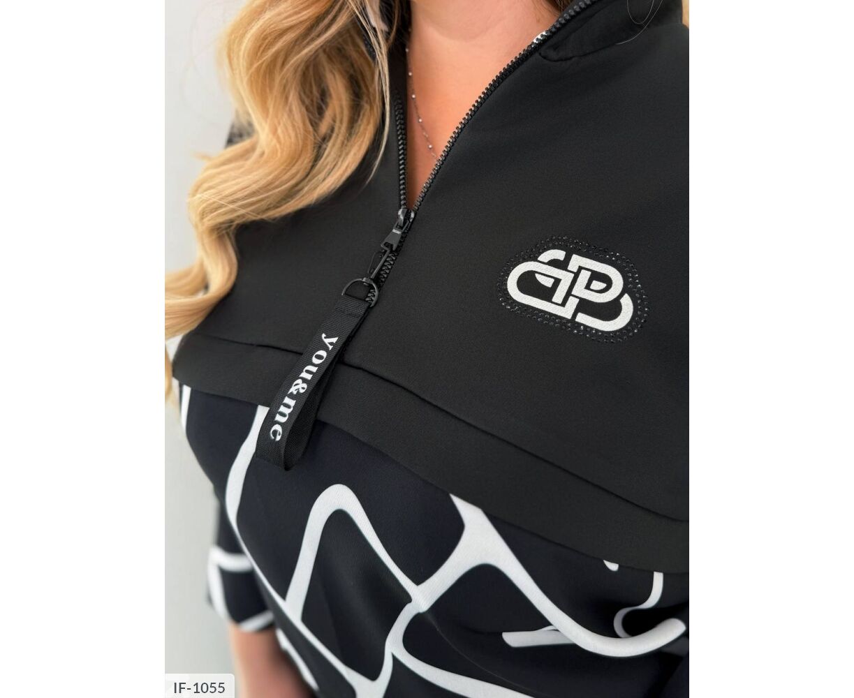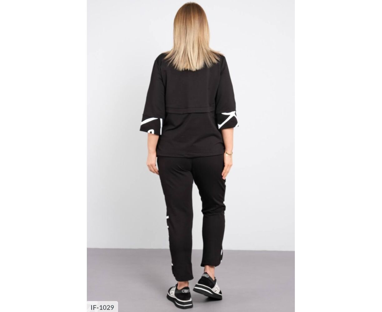 Костюм спорт шик, удачная комбинация однотона с принтом, делает изделие изящным и оригинальным, привлекает взгляды. Лампас на брюках, низ рукавов и низ кофты украшены принтом, горловина стойка на молнии с карабином ( украшен буквами), на груди накат с камушками, по низу кофты шляпная резинка с фиксаторами ( можно регулировать объем). Брюки на широкой резинке, по бокам карманы. Костюм интересного кроя: планочка на груди спереди и сзади, подчеркивает ваши прелести и скрывает лишние объемы на талии.