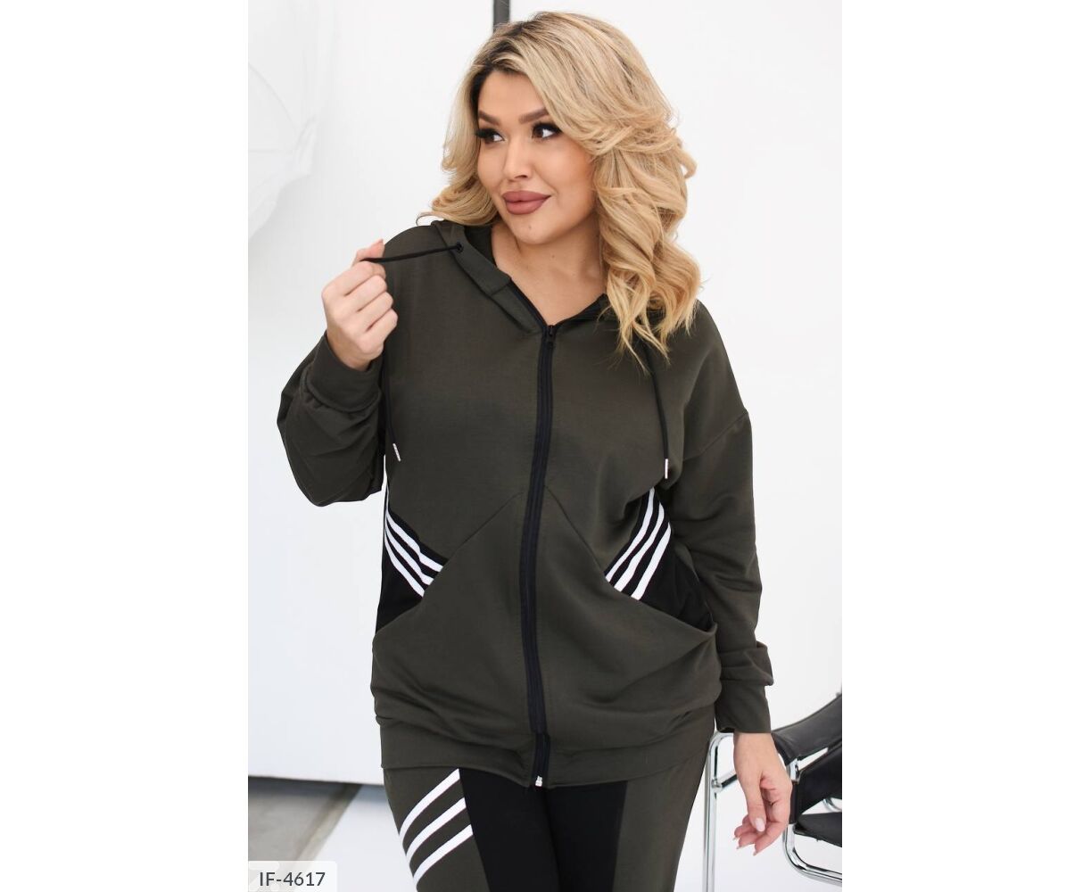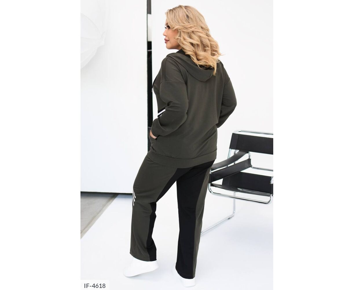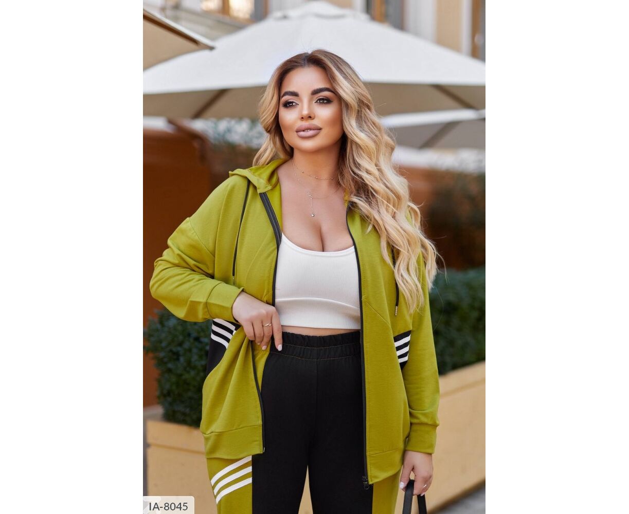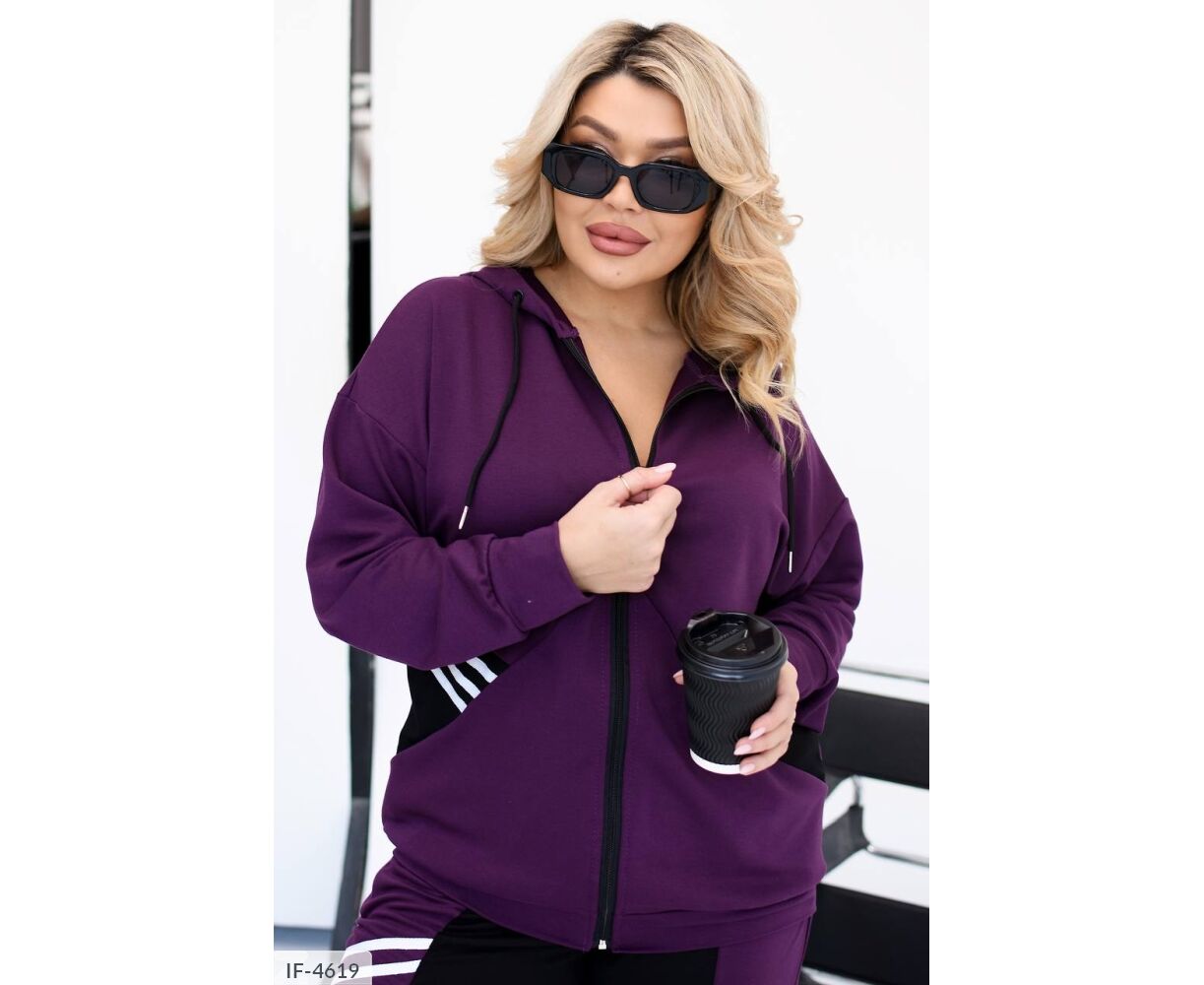 Костюм-двойка интересного кроя: кофта на молнии, по бокам глубокие карманы + черная вставка возле карманов, капюшон на канате, манжеты на рукавах и по низу кофты, брюки прямого кроя, талия на резинке, высокая посадка, по бокам карманы, на брюках вставка черного цвета, тем самым уменьшая визуально объемы. На кофте и брюках костюм украшен киперной, белой лентой.