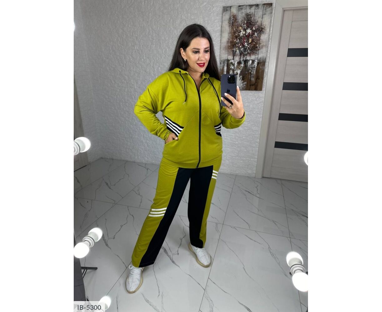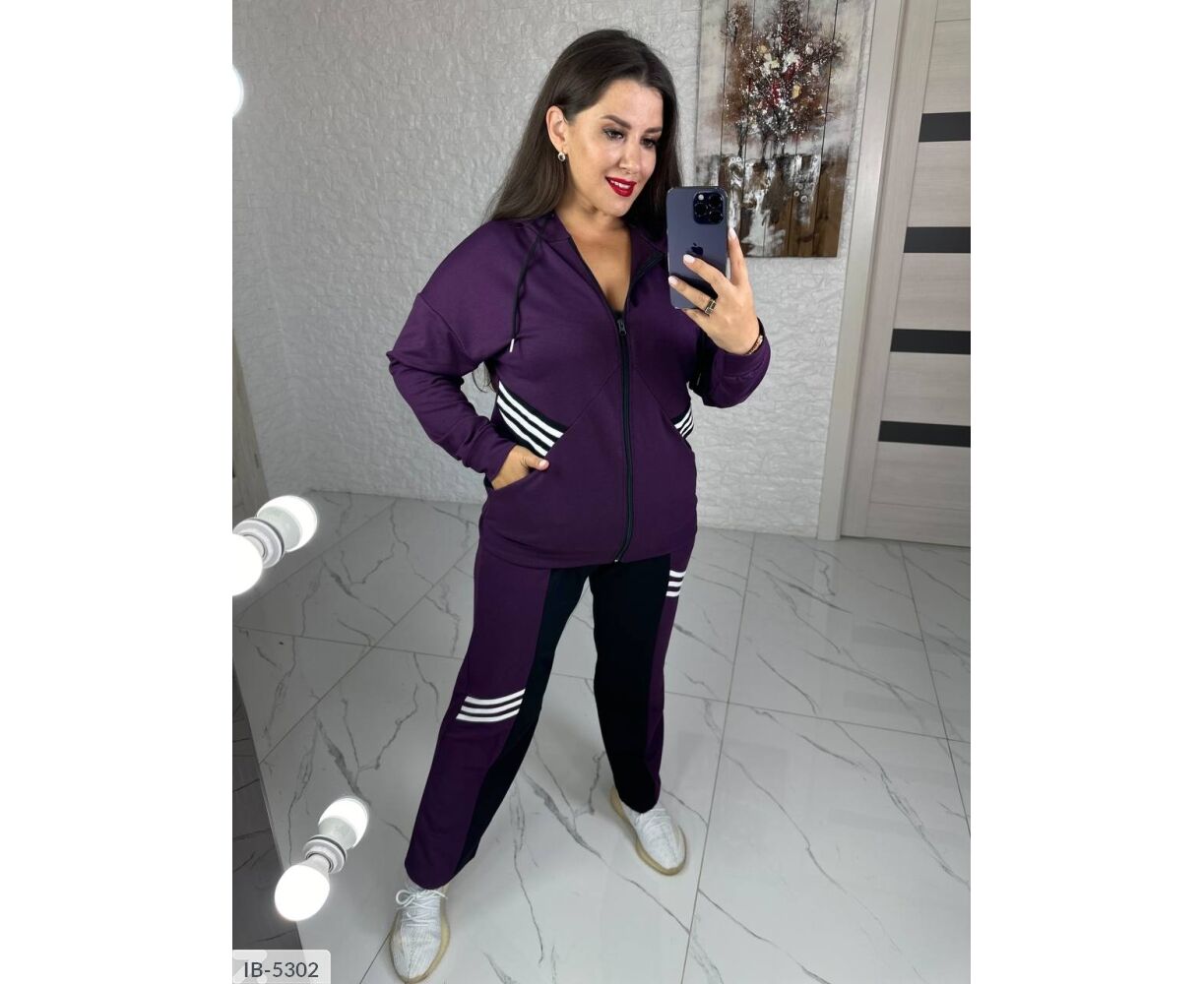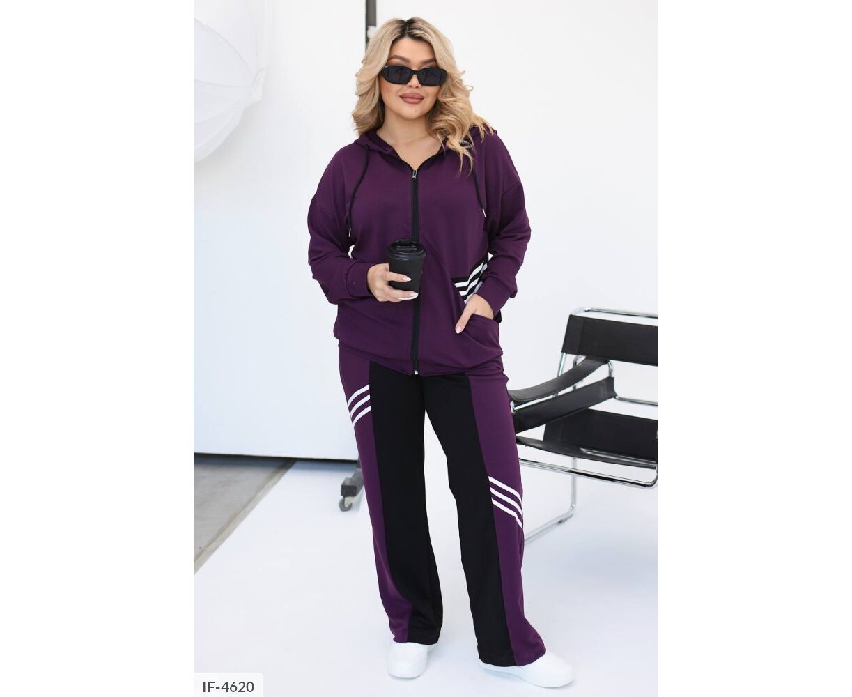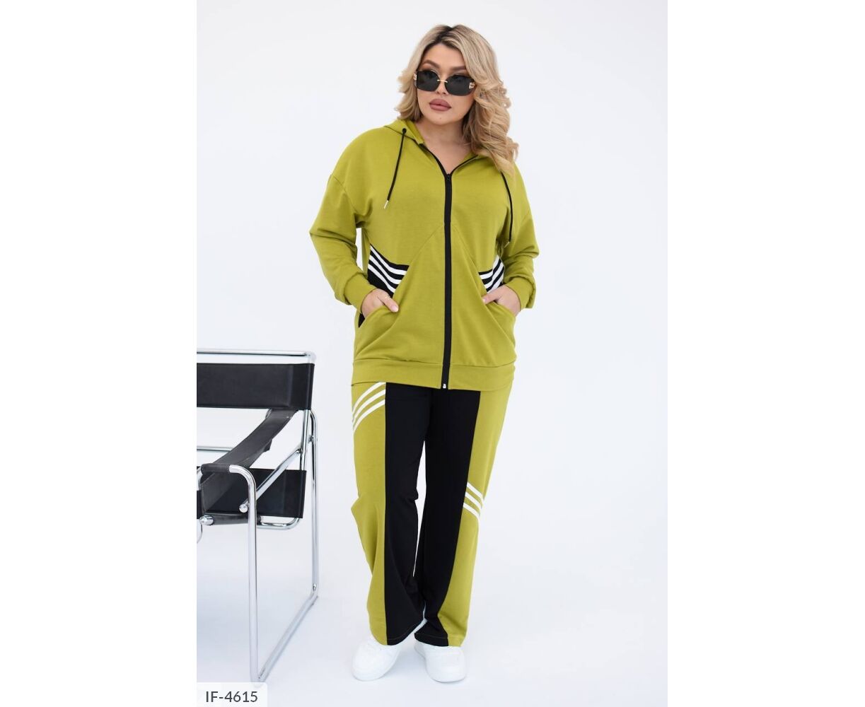 Костюм-двойка интересного кроя: кофта на молнии, по бокам глубокие карманы + черная вставка возле карманов, капюшон на канате, манжеты на рукавах и по низу кофты, брюки прямого кроя, талия на резинке, высокая посадка, по бокам карманы, на брюках вставка черного цвета, тем самым уменьшая визуально объемы. На кофте и брюках костюм украшен киперной, белой лентой.