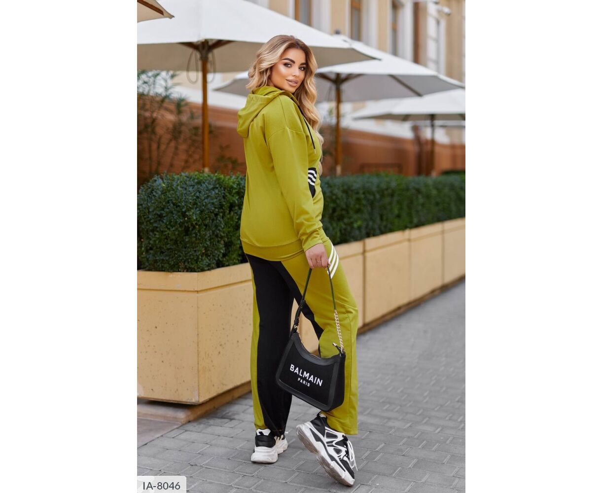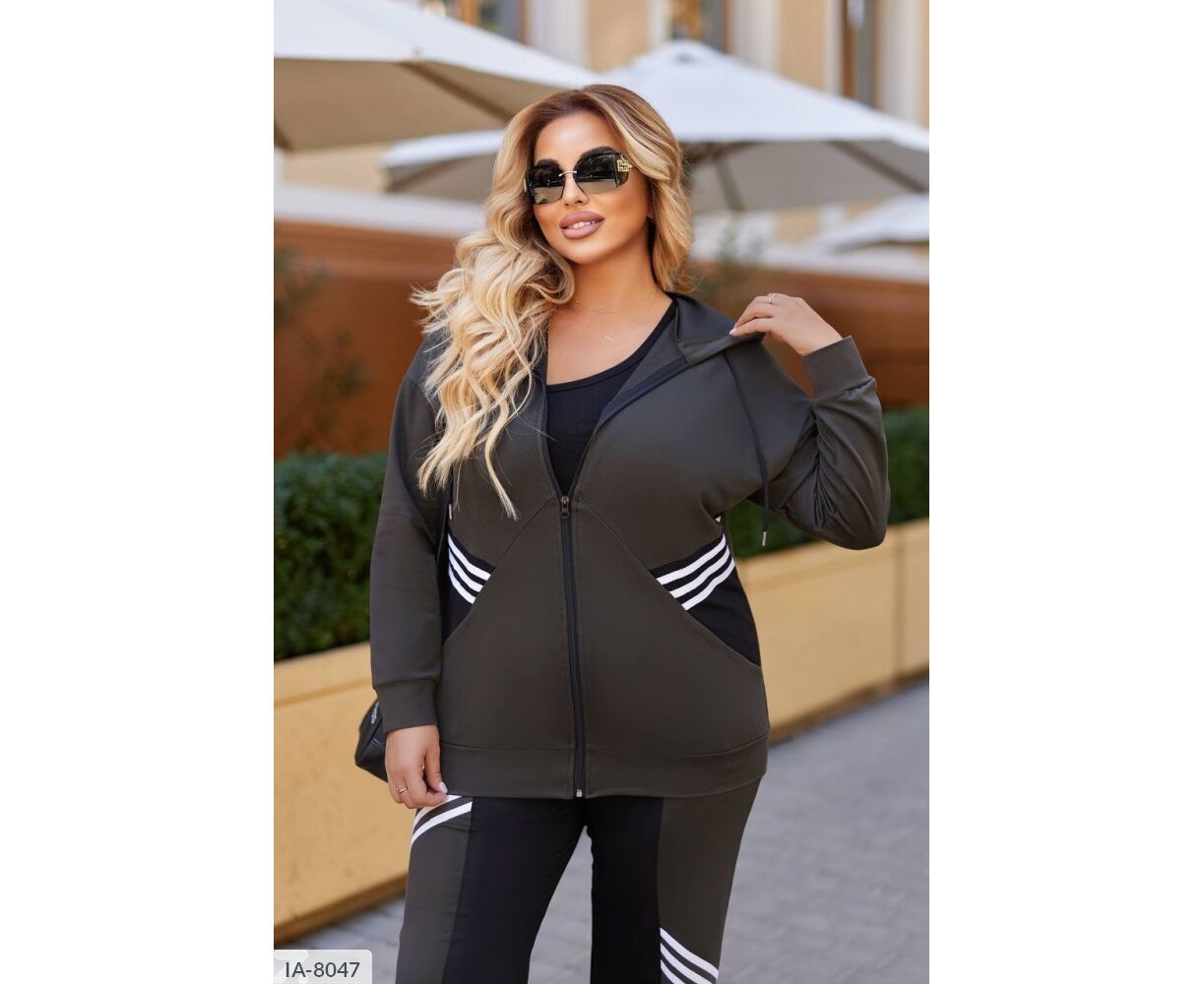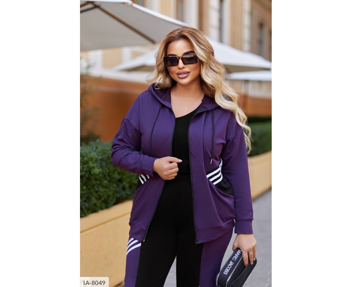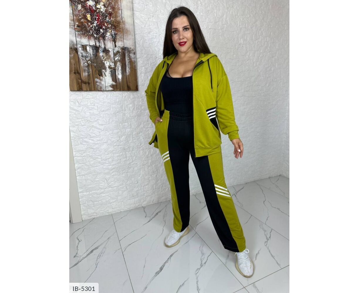 Костюм-двойка интересного кроя: кофта на молнии, по бокам глубокие карманы + черная вставка возле карманов, капюшон на канате, манжеты на рукавах и по низу кофты, брюки прямого кроя, талия на резинке, высокая посадка, по бокам карманы, на брюках вставка черного цвета, тем самым уменьшая визуально объемы. На кофте и брюках костюм украшен киперной, белой лентой.