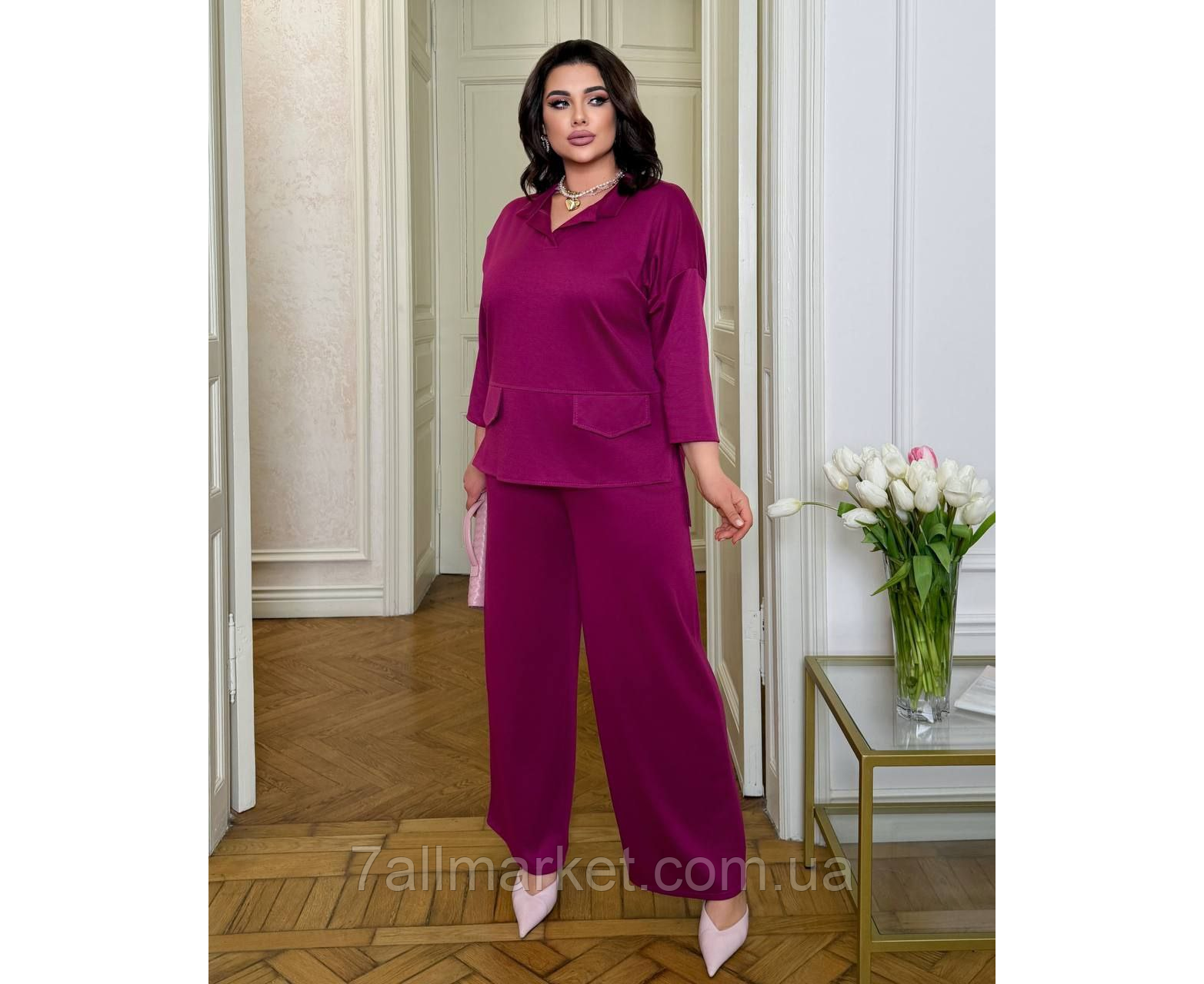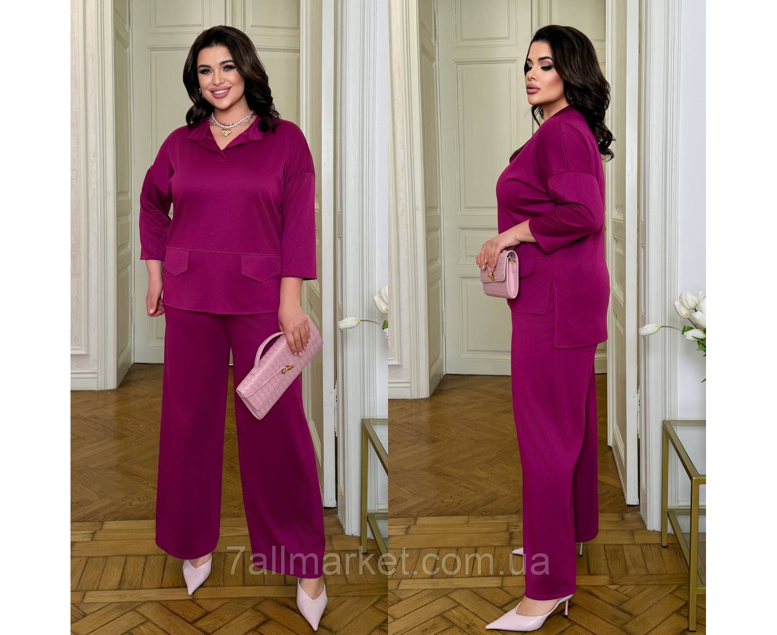 Костюм двойка Модель № 7935-1 КАЧЕСТВО ОТМЕНЕНИЯ Размер : 46-48; 50-52; 54-56; 58-60 Ткань : евро трикотаж ( красиво тянется ) Длина кофта : 70 /75 см.. Длина рукава: 58 см. Длина брюк : 106 см. Широкие брюки с высокой посадкой , пояс на резинке, боковые карманы . Кофта прямого покроя с планкой, боковые разрезы, из зади удлиненная.
