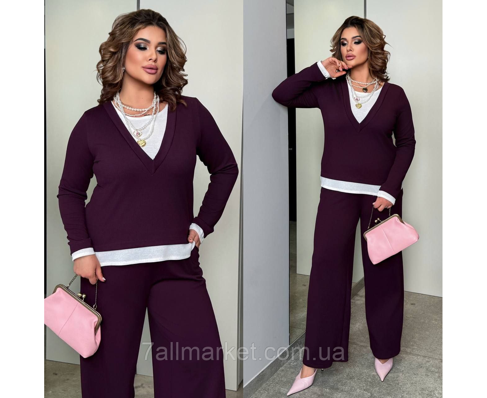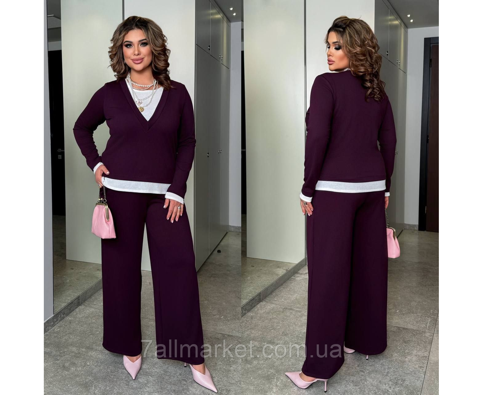 Костюм двойка Модель № 8000-1. КАЧЕСТВО ОТМЕНЕНИЯ Размер : 46-48; 50-52; 54-56; 58-60 Тканина : рубчик ( красиво тянется ) Довжина кофта : 66 см.. Длина рукава: 66 см. Длина брюк : 110 см Брюки с высокой посадкой, пояс на резинке. Кофта прямого покроя , имитация двойки