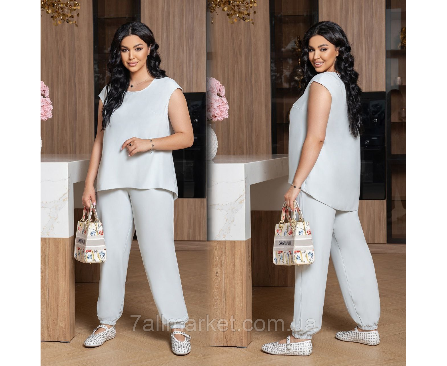 Костюм двойка Модель № 7559-1 КАЧЕСТВО ОТМЕНЕНИЯ Размер : 46-48; 50-52; 54-56; 58-60 Тканина : шовк Прадо НЕМАЄ РАСТЯЖНОСТИ Длина кофты : 65 /75 см . Длина рукава : 18 см. (от горловины ) Длина джоггеры : 103 см. (пояс на резинке ) Практичный костюм, джоггеры прямого покроя, с боковыми карманами, пояс на резинке , низ на резинке. Кофта прямого покроя, удлиненная из зади