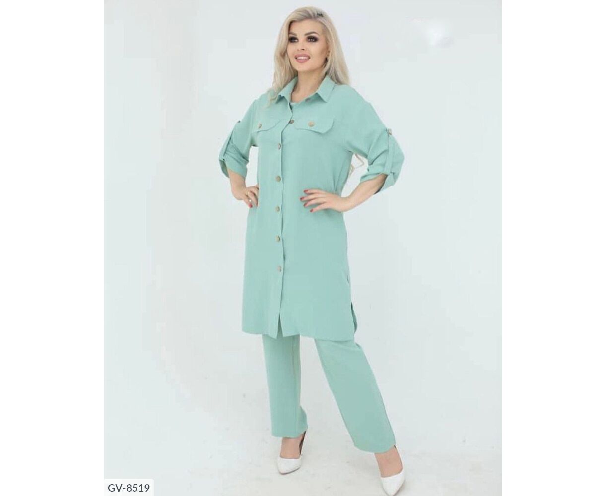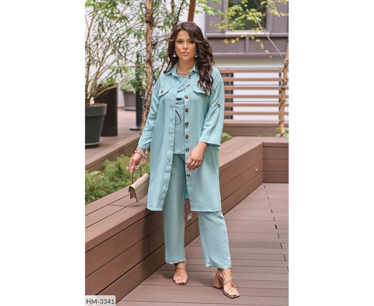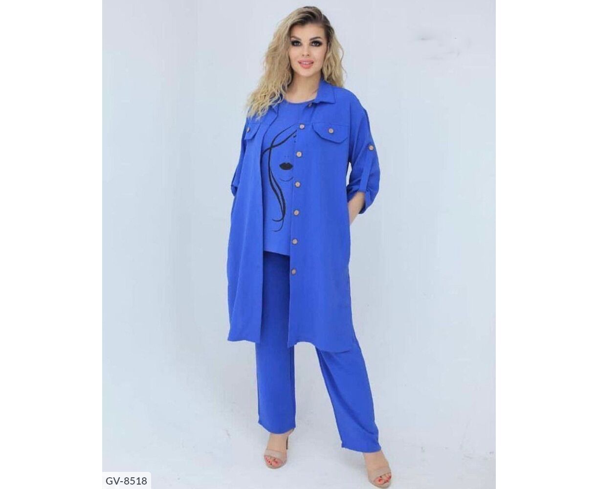 Костюм-тройка с оригинальным накатом, все три детали гардероба возможно носить отдельно: блуза с качественным накатом, как на фото, с обеих сторон разрезы, брюки на широкой резинке, по бокам карманов, удлиненная рубашка, застегивается на пуговицы, рукав на патике с пуговицей (длину возможно регулировать), на груди карманы с пуговицей.