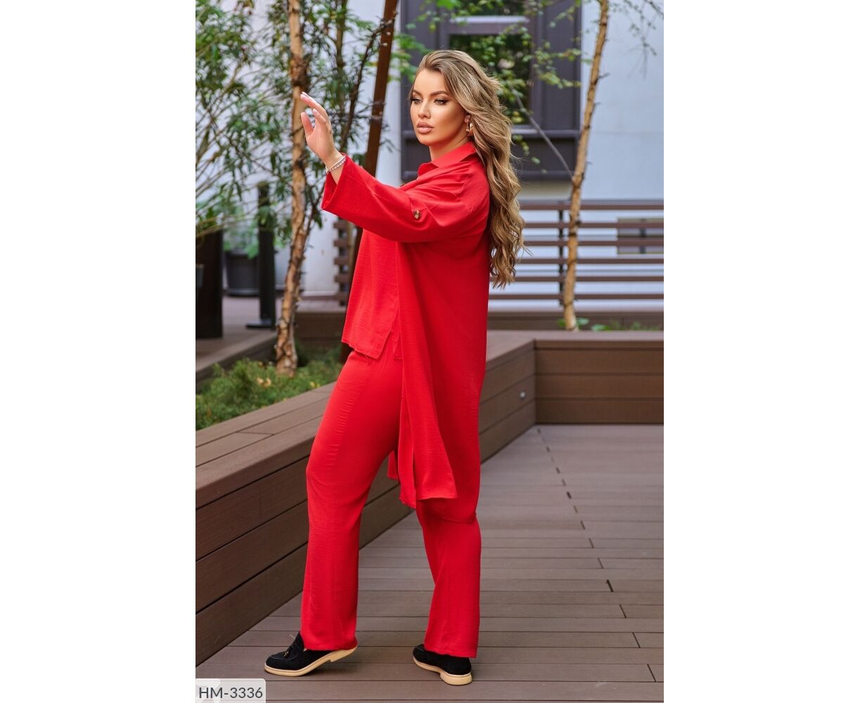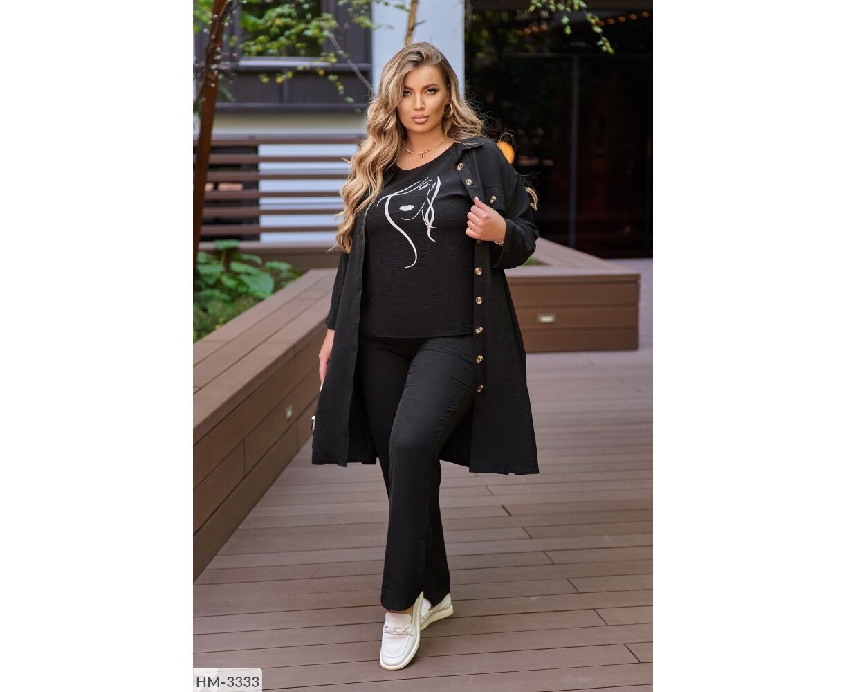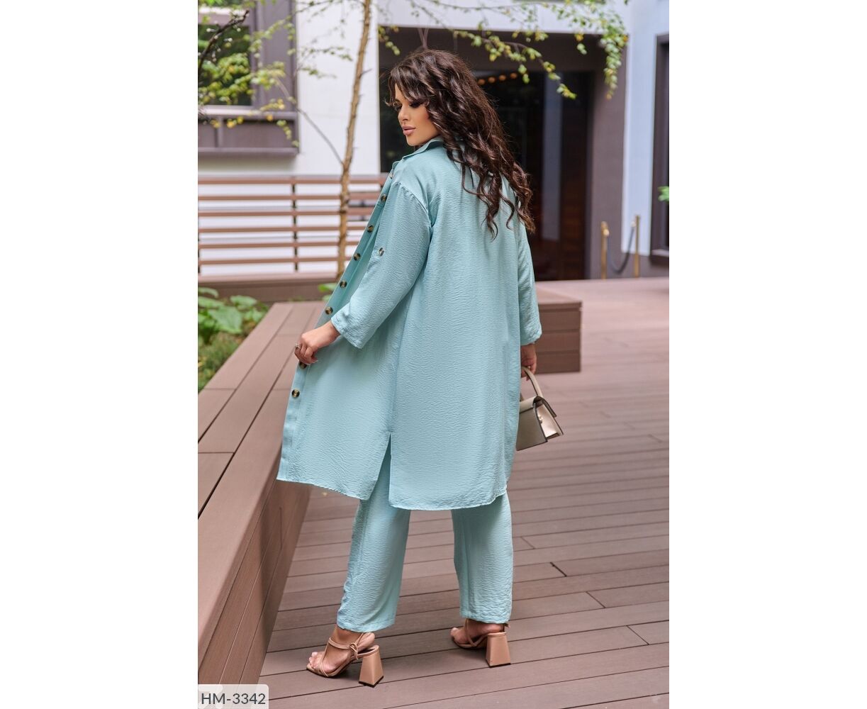 Костюм-тройка с оригинальным накатом, все три детали гардероба возможно носить отдельно: блуза с качественным накатом, как на фото, с обеих сторон разрезы, брюки на широкой резинке, по бокам карманов, удлиненная рубашка, застегивается на пуговицы, рукав на патике с пуговицей (длину возможно регулировать), на груди карманы с пуговицей.