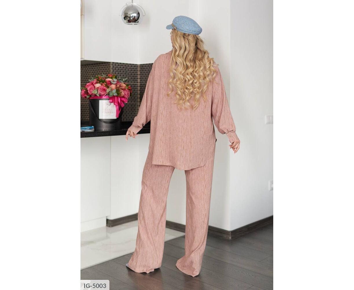 В костюме рубашка свободная, с карманом на груди, имеет спущенный рукав с манжетом, застегивается на пуговицы. Брюки свободного кроя, высокой посадки, в талии на резинке и с карманами.