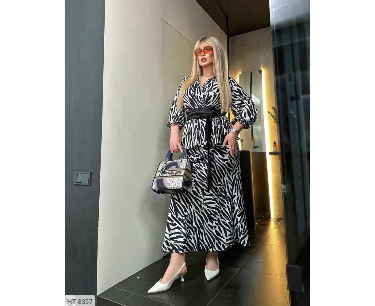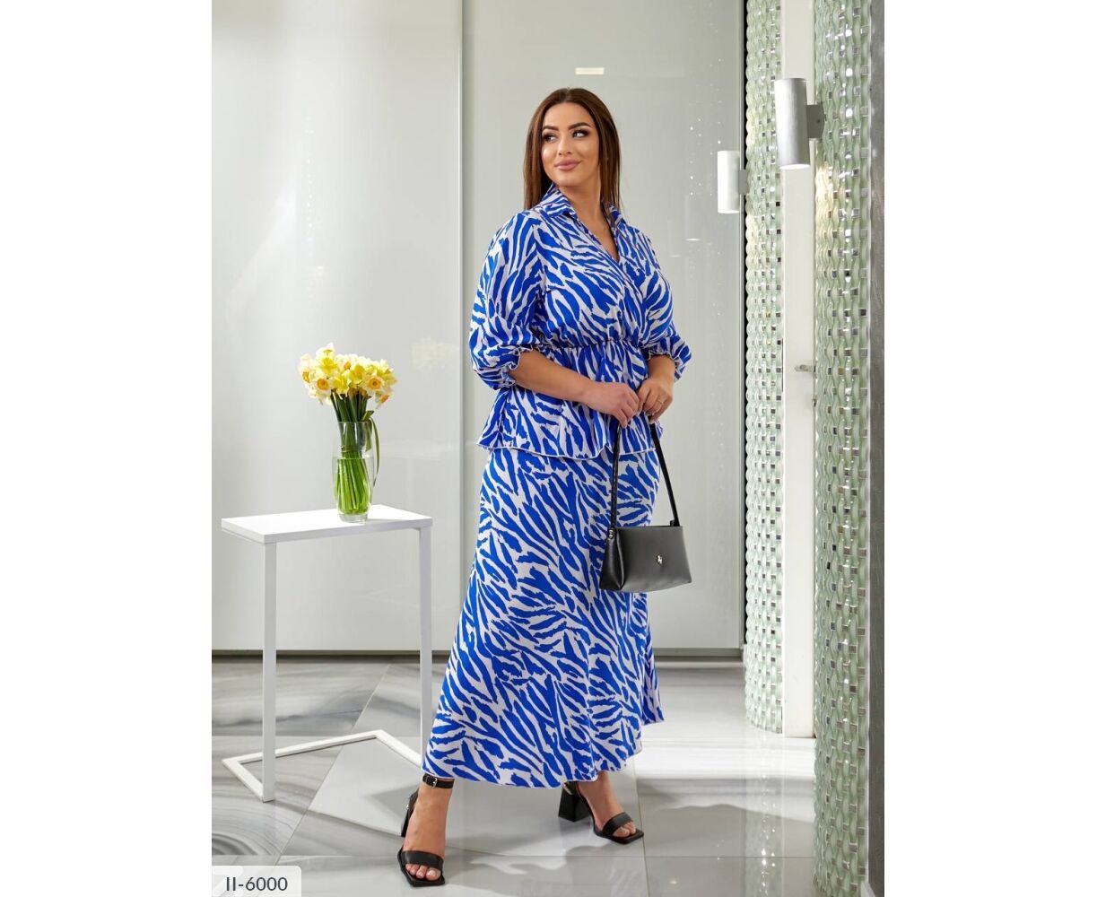 Костюм с блузой баской, на груди на запах, на талии на резинке, и юбкой макси на талии на резинке. В комплект идет пояс кушак.