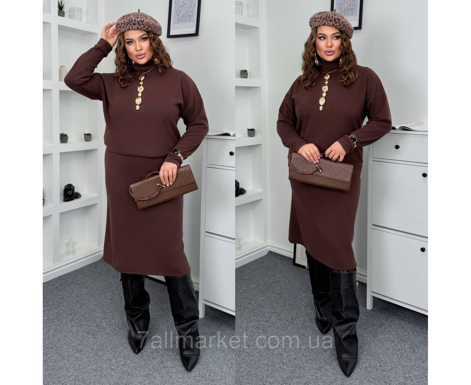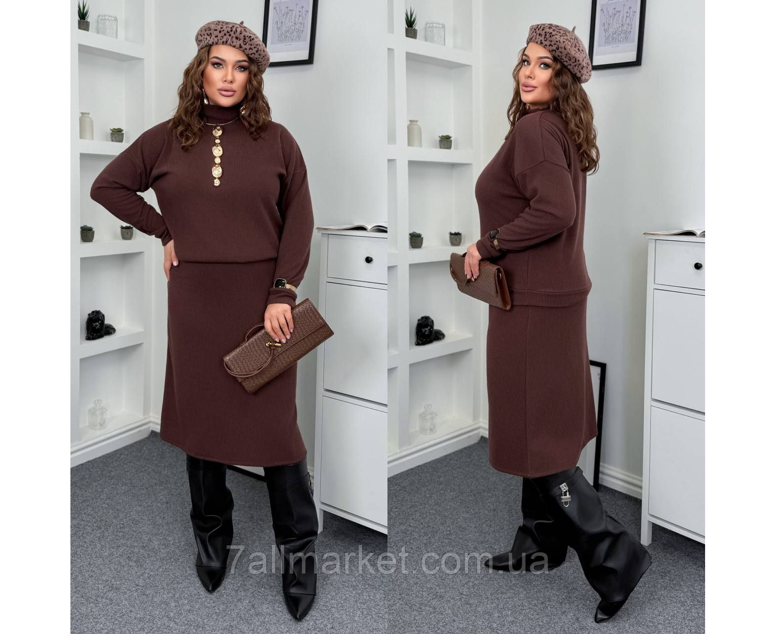 Костюм двойка Модель № 063 КАЧЕСТВО ОТМЕНЕНИЯ Размер : 46-48; 50-52; 54-56; 58-60 Тканина : ангора - рубчик ( красиво тянется ) Длина кофты : 68 см . Длина рукава : 76 см. Длина юбки : 74 см. Теплый костюм - кофта + юбка. Кофта прямого покроя, воротник стойка, на манжете . Юбка покроя трапеция, пояс на резинке