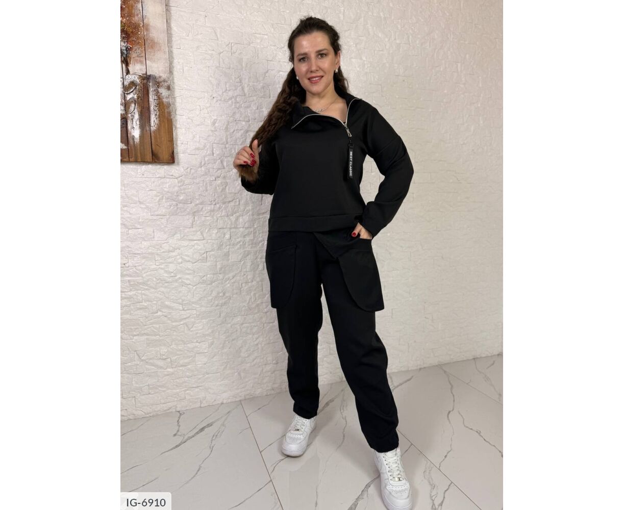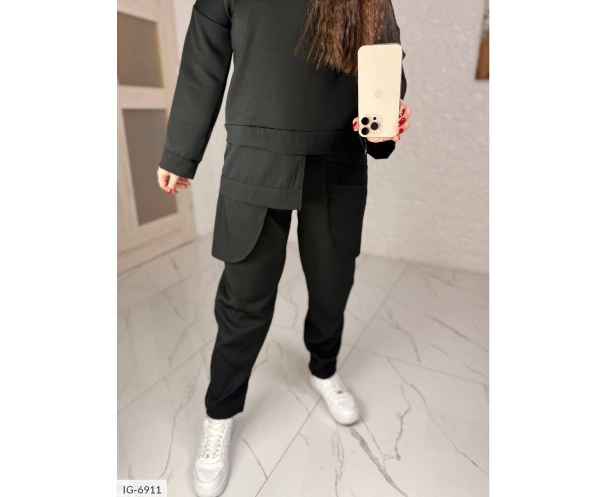 Костюм-двойка из качественной крепкостюмки, интересного кроя. Брюки на резинке, два красивых кармана, выполнены из крепшифона, низ кофты и рукава красиво обработаны крепшифоном, на воротнике молния с карабином.