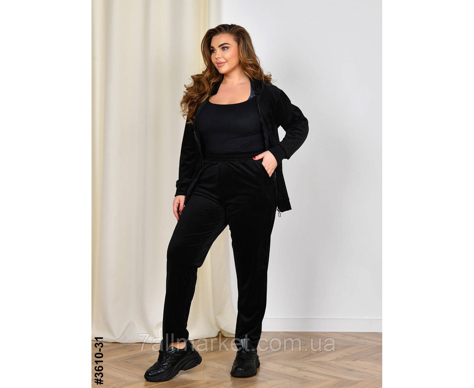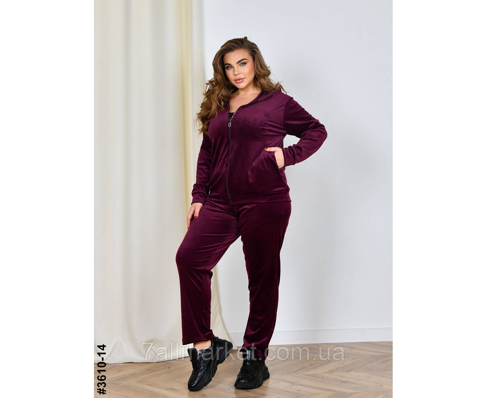 Женский велюровый спортивный костюм в бытальных размерах. Верх – кофта на молнии и с капюшоном; оснащена манжетами на рукавах и поясе. Низ – прямые штаны с широкой комфортной резинкой на поясе.