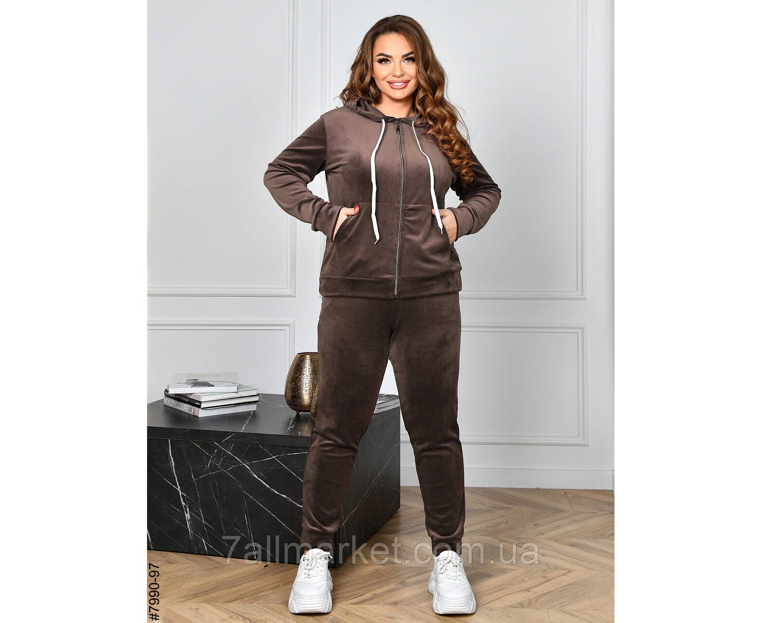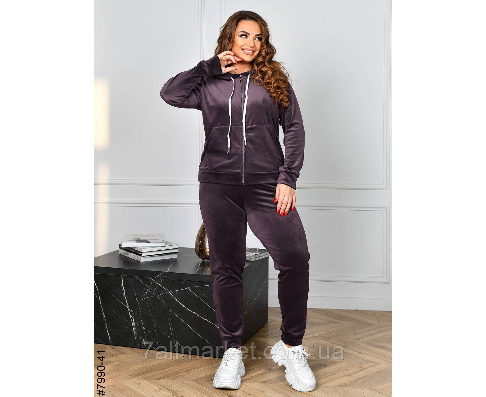 Женский велюровый спортивный костюм в батальных размерах. Верх – худи с капюшоном на молнии; оснащен манжетами на рукавах. Низ – штаны на широкой резинке, с боковыми карманами и манжетами на штанинах.