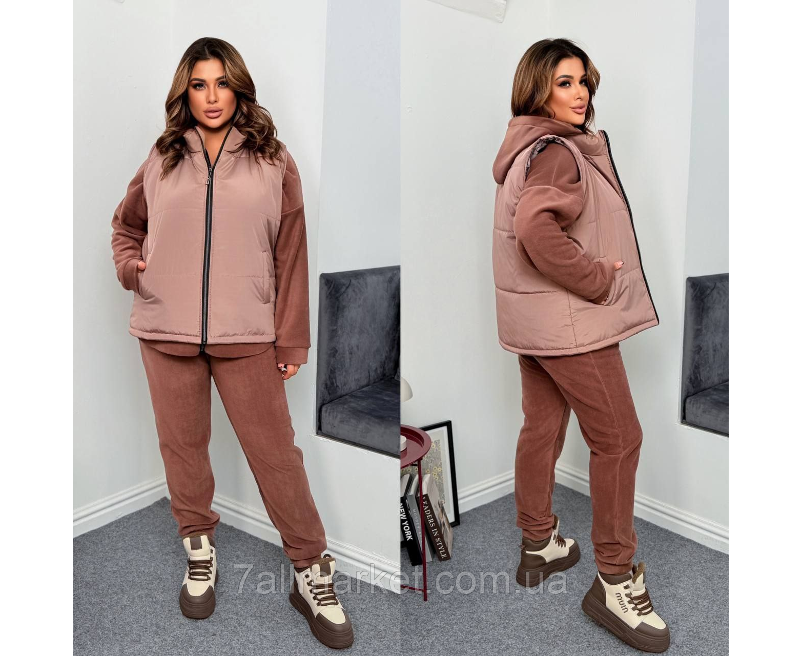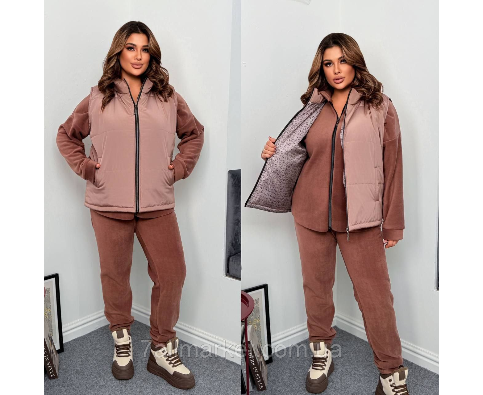 Костюм тройка Размер : 46-48; 50-52; 54-56; 58-60 Ткань жилетки: водостойкая плащевка канада, подкладка, синтепон 150 . Тканина костюма : дабл флис полар ( хорошая растяжимость) Довжина жилетки : 70 см. Довжина кофти : 78 см. Длина рукава : 78 см. (от горловины ) Длина брюк : 106 см Теплий костюм трійка на холодну погоду - жилетка + кофта + штани . Жилетка на молнии со стойкой и с карманами . Кофта на молнии с капюшоном, штаны с высокой посадкой, на манжете, пояс на резинке, с боковыми карманами
