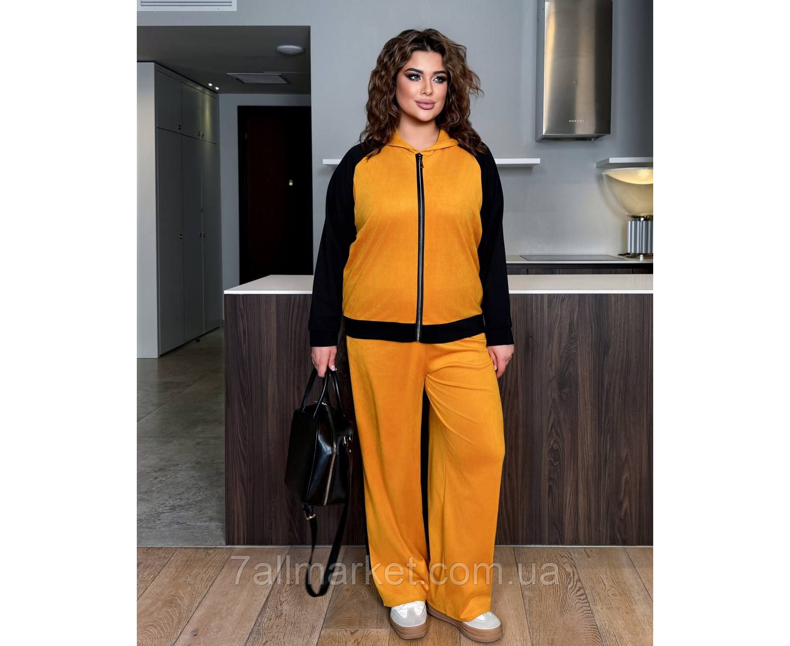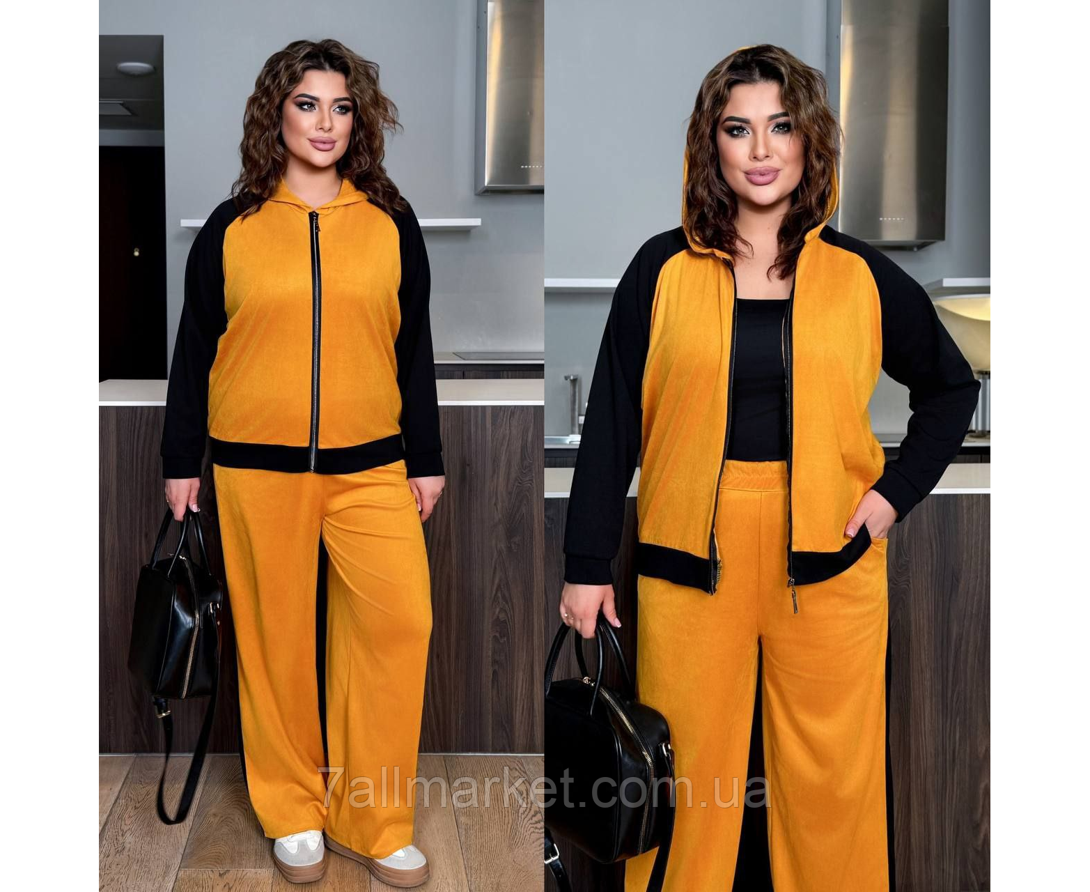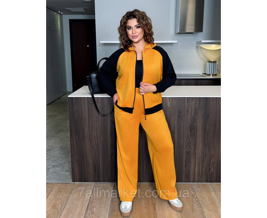 Костюм двойка Модель № 8003-1 КАЧЕСТВО ОТМЕНЕНИЯ Размер : 46-48; 50-52; 54-56; 58-60 Тканина : замша + трикотаж ( красиво тянется ) Довжина кофта : 70 см.. Длина рукава: 74 см. Длина брюк : 107 см. Брюки с высокой посадкой, пояс на резинке, боковой ломпас . Кофта прямого покроя на манжете , на молнии, с капюшоном