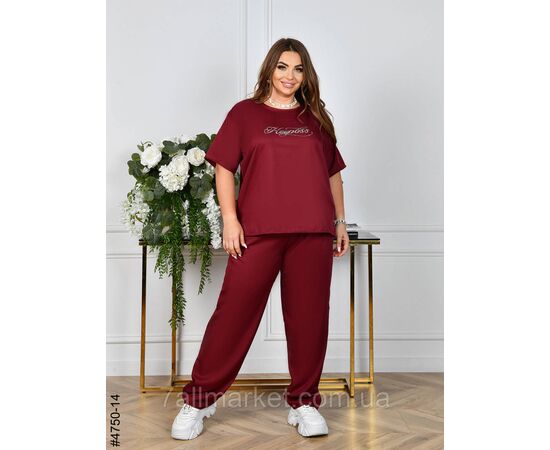 Жіночий батальний костюм з легкої тканини (ківі). Верх – футболка прикрашена написом з каміння; низ – прямі штани з широкою комфортною резинкою на поясі. Чудова повсякденна модель на літо.