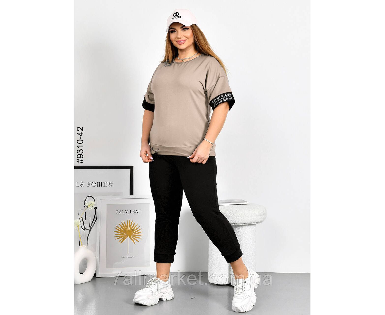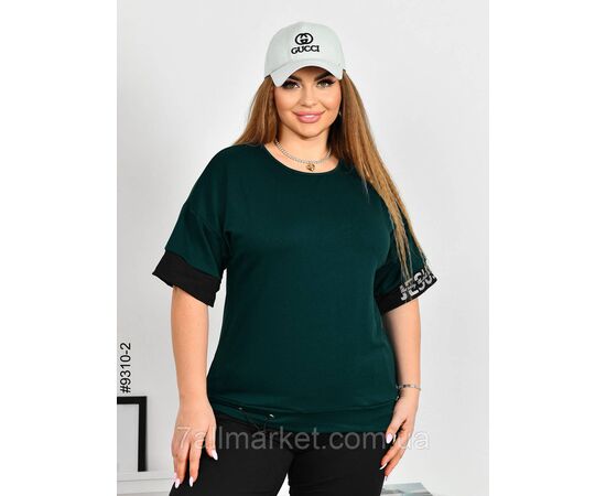 Жіночий спортивний костюм з двунитки. Верх – футболка зі стильними вставками; низ – чорні штани на манжеті, в поясі є шнурок для додаткової фіксації. Зручна модель на літо.