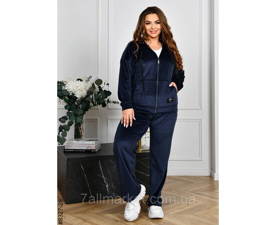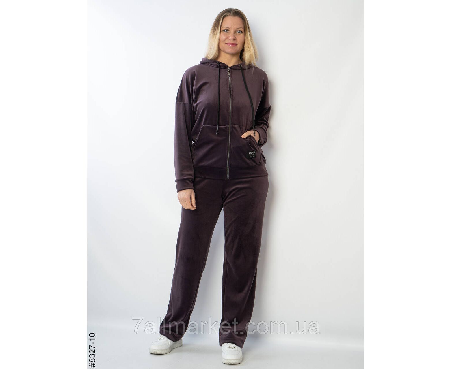 Жіночий велюровий спортивний костюм. Верх — худі з капюшоном на блискавці; низ — прямі штани.