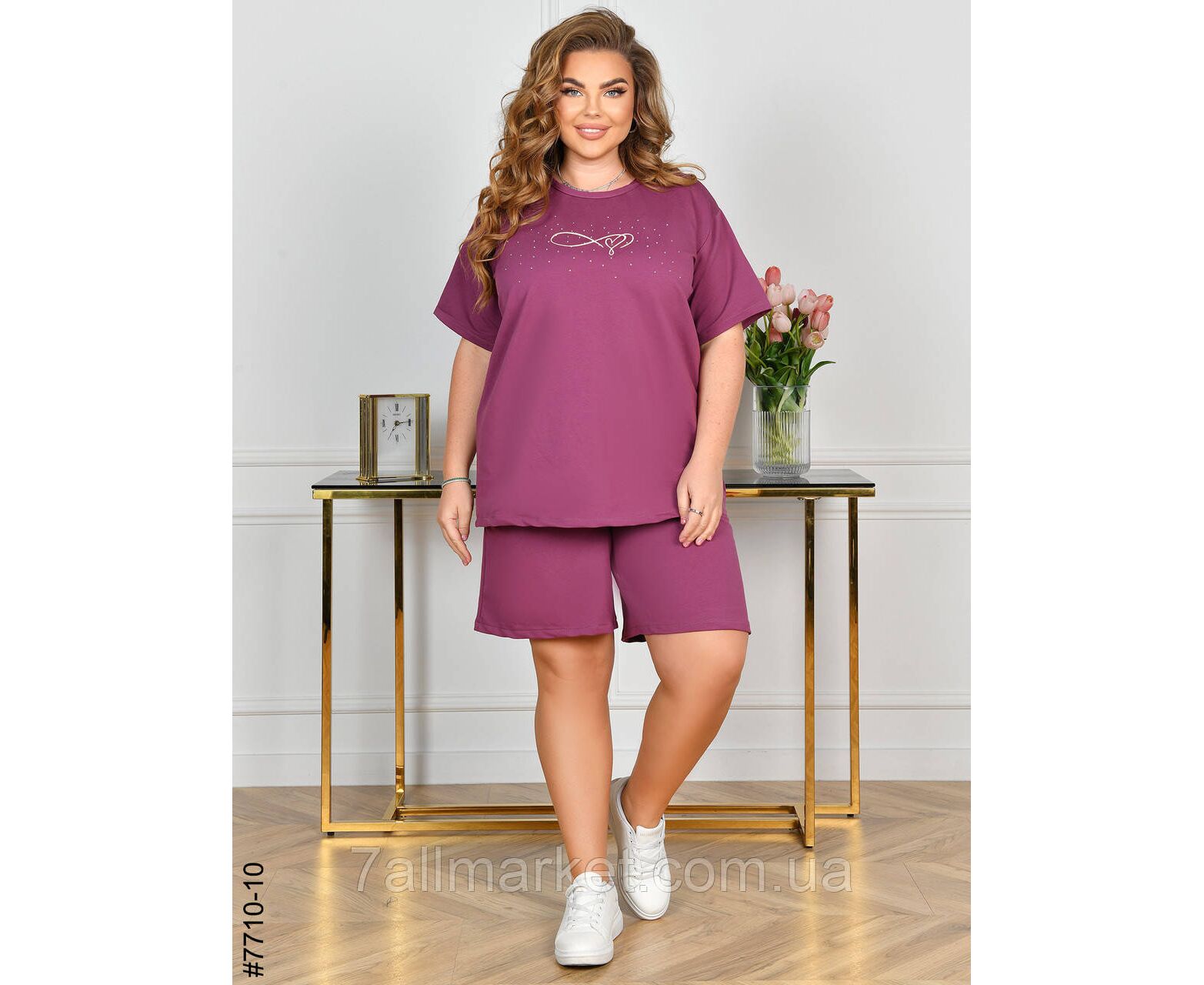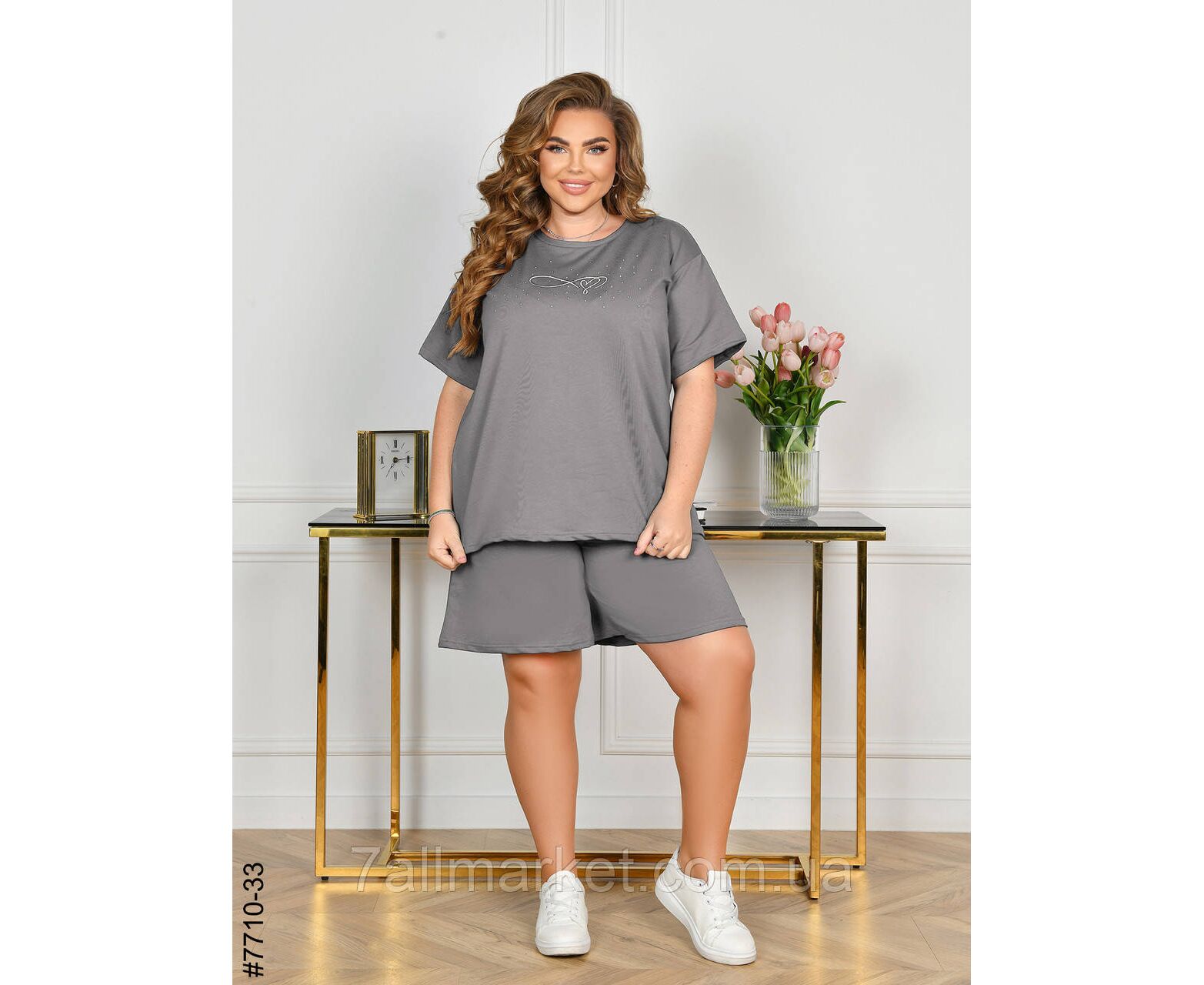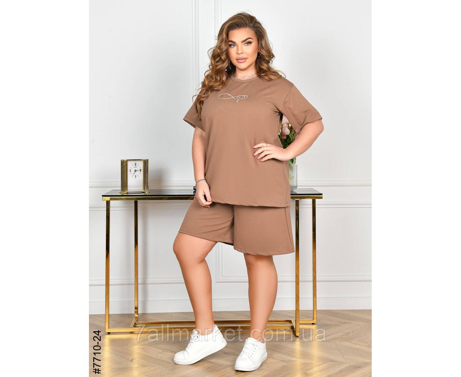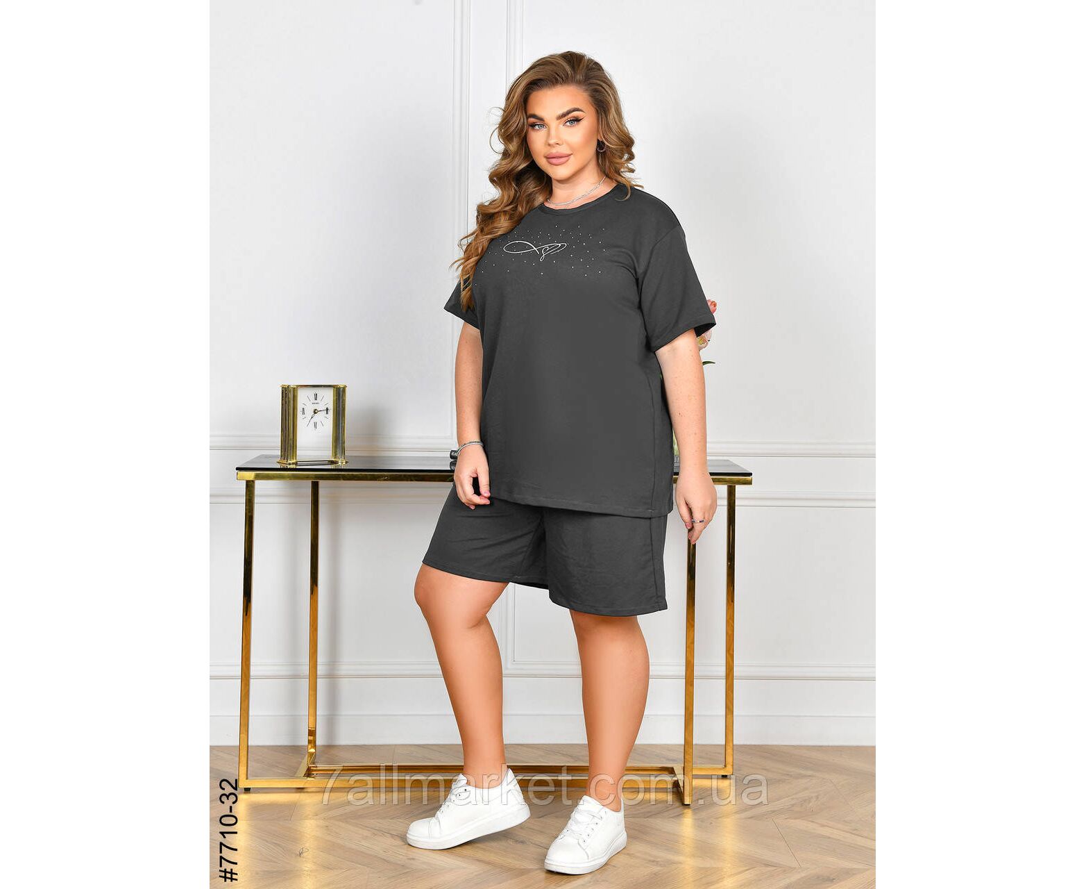 Жіночий спортивний костюм у батальних розмірах. Верх – футболка,прикрашена камінням; низ – шорти з комфортним широким поясом. Зручна модель на літо.