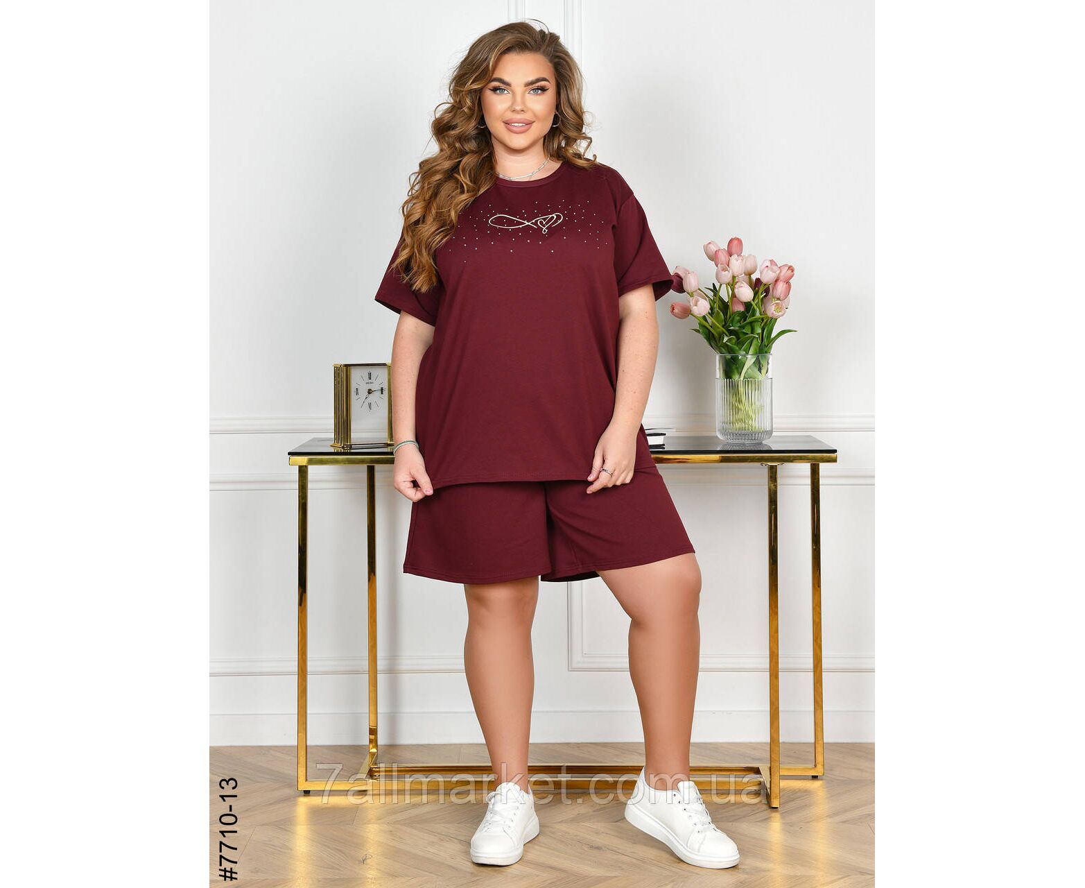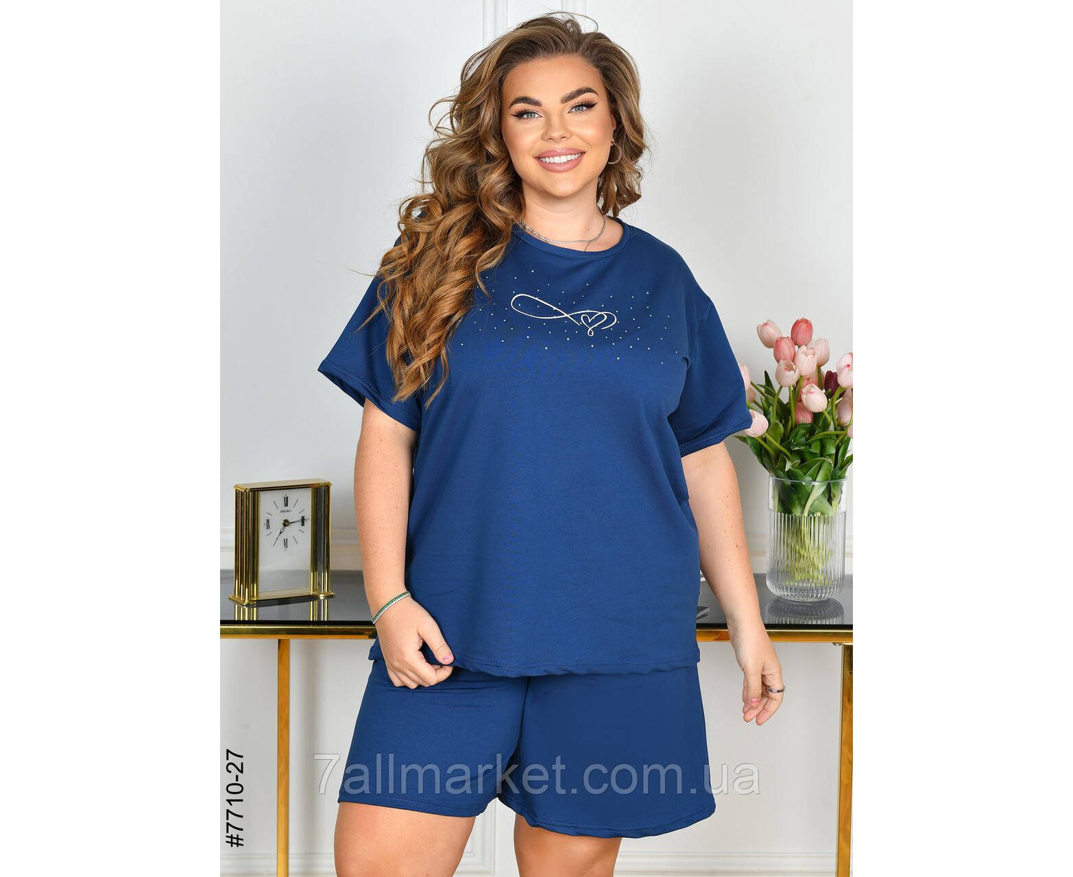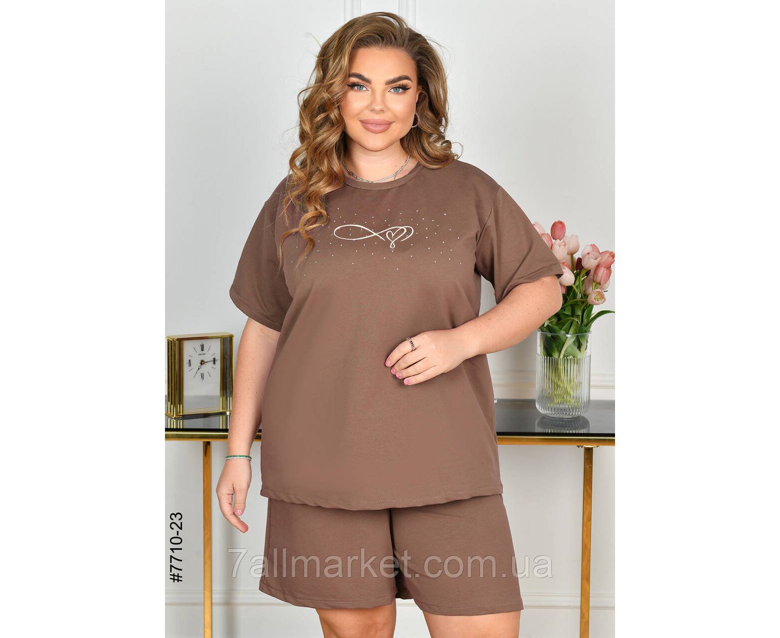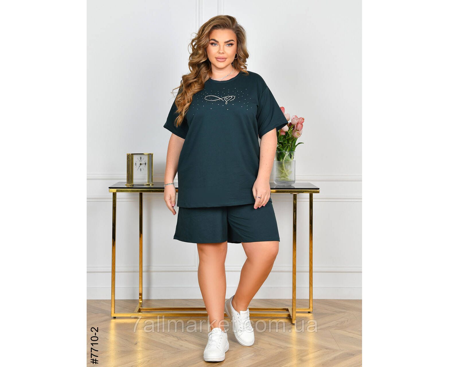 Жіночий спортивний костюм у батальних розмірах. Верх – футболка,прикрашена камінням; низ – шорти з комфортним широким поясом. Зручна модель на літо.