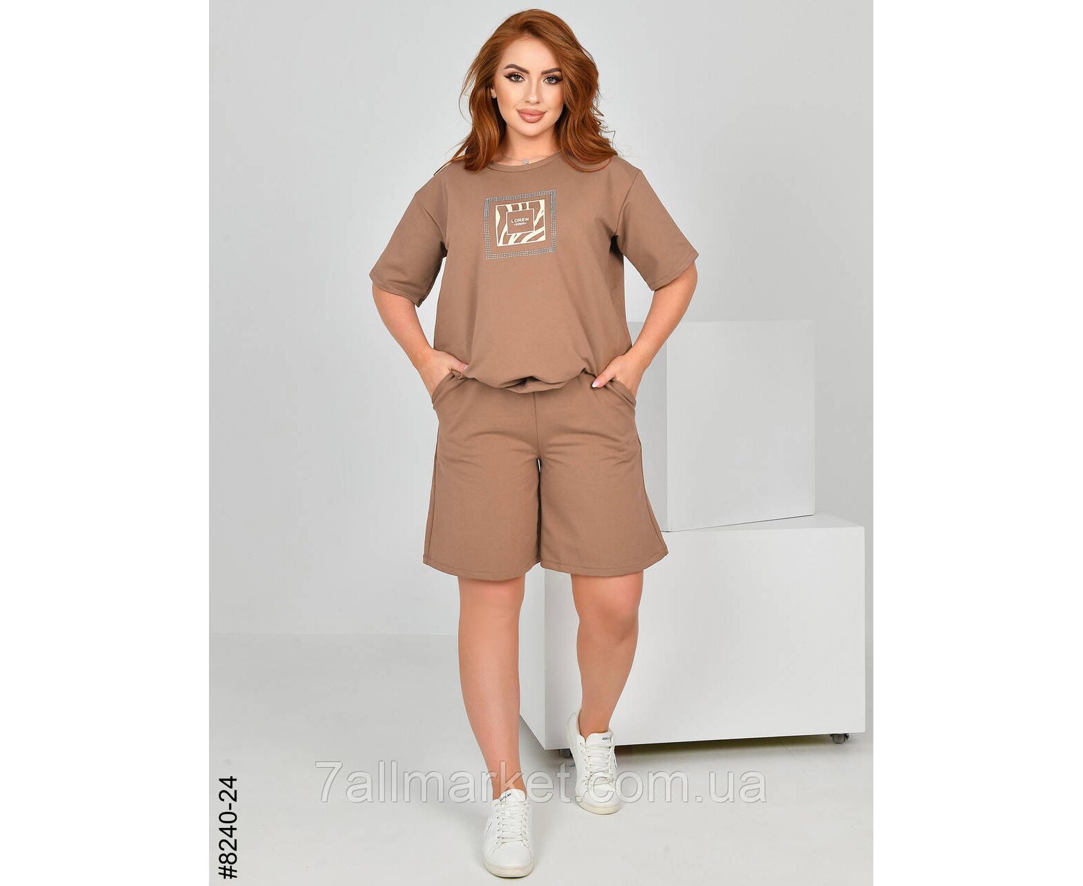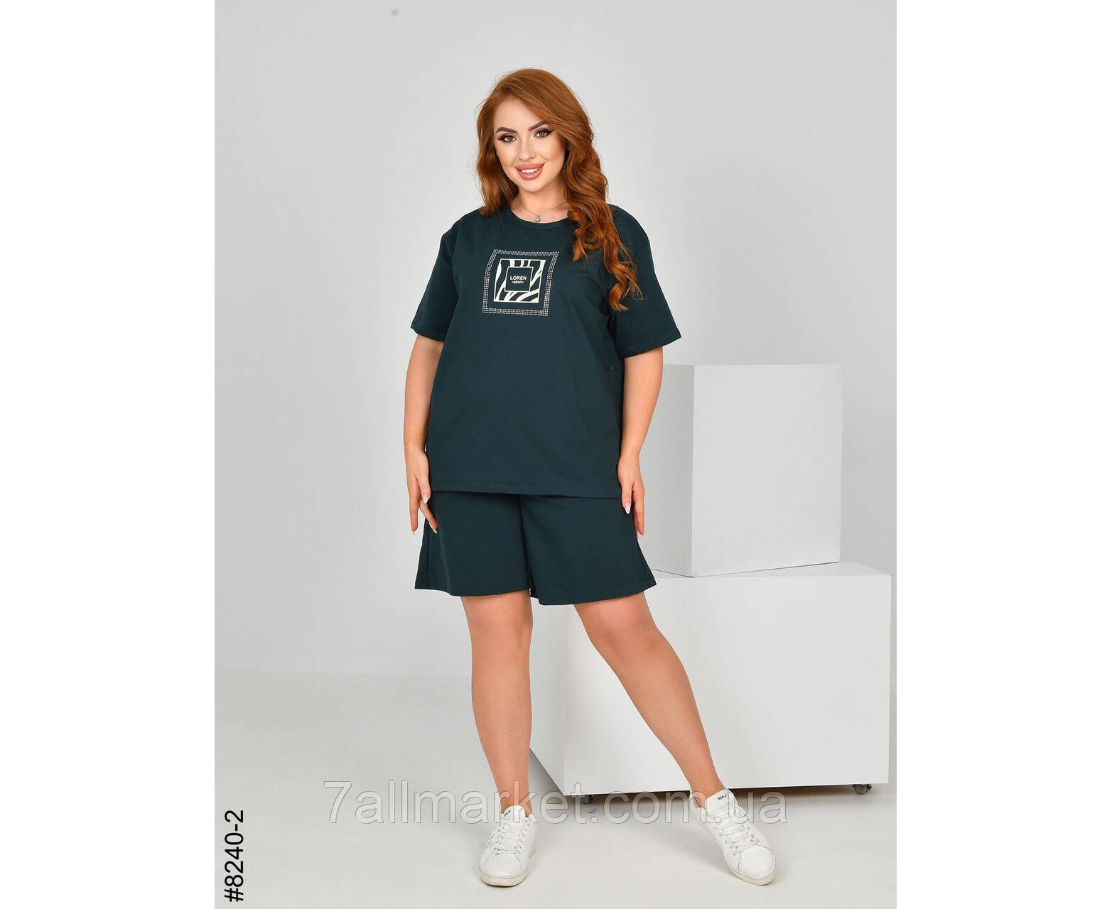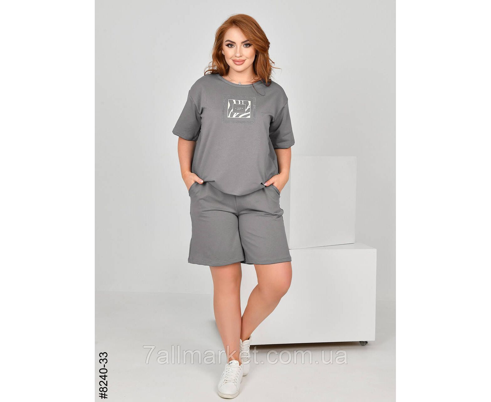 Жіночий спортивний костюм з турецької двонитки. Верх – футболка,прикрашена камінням; низ – шорти з комфортним широким поясом. Зручна модель на літо.