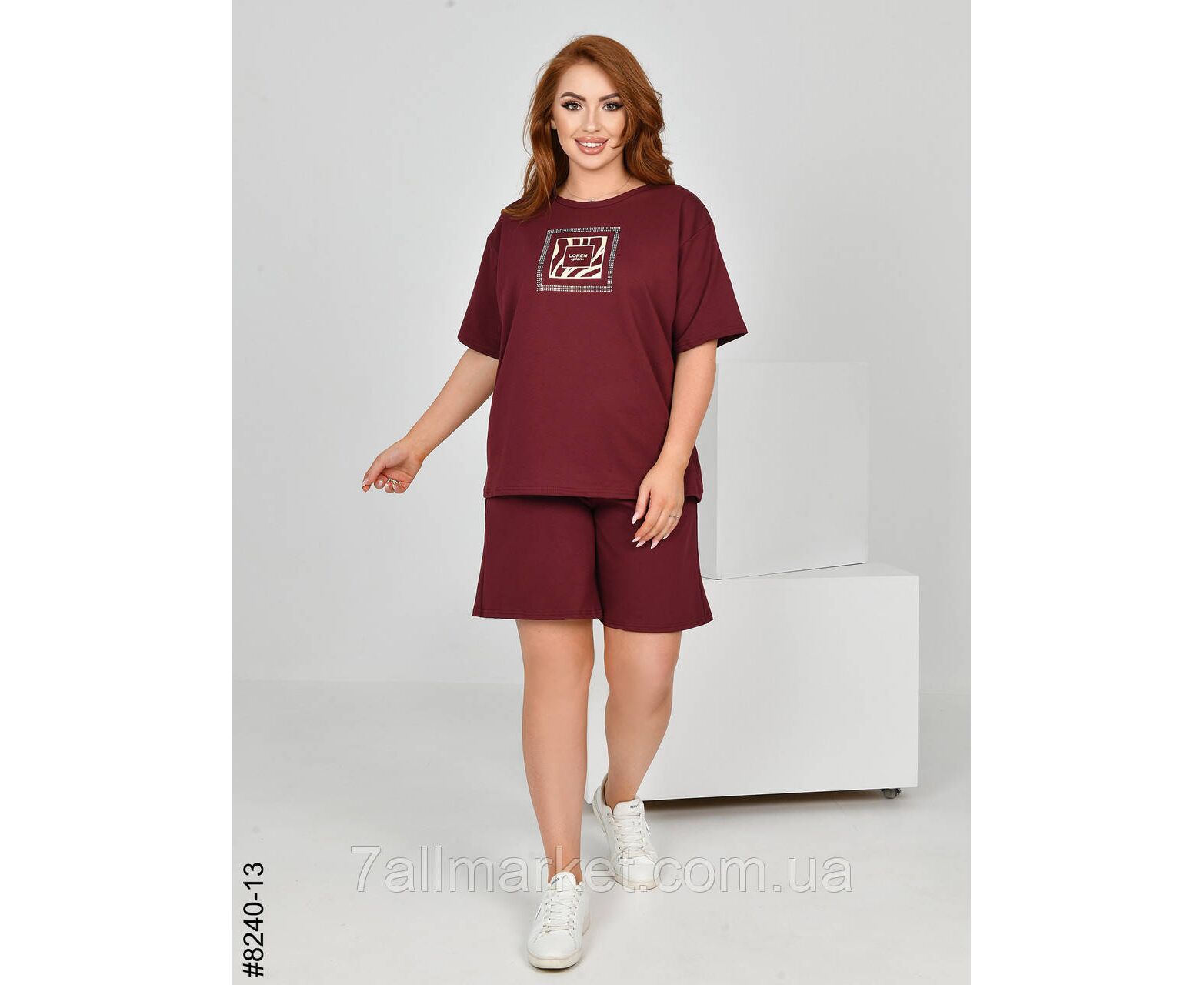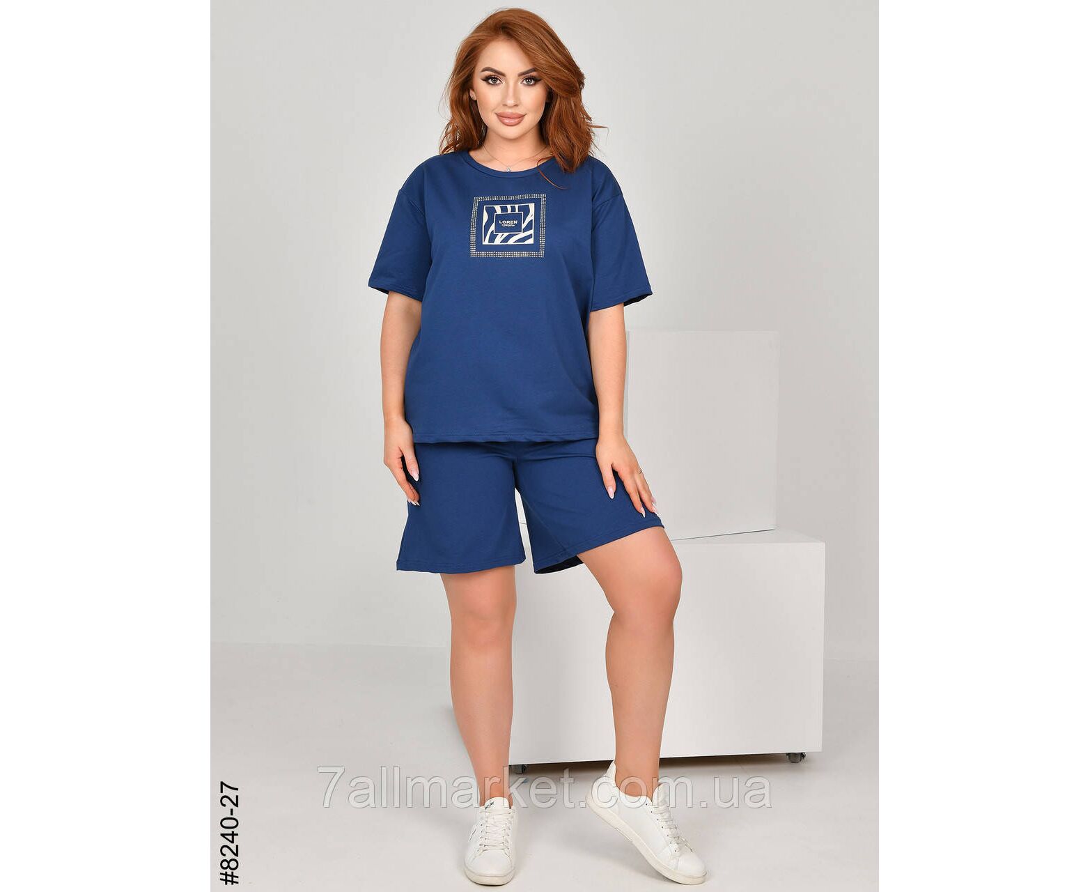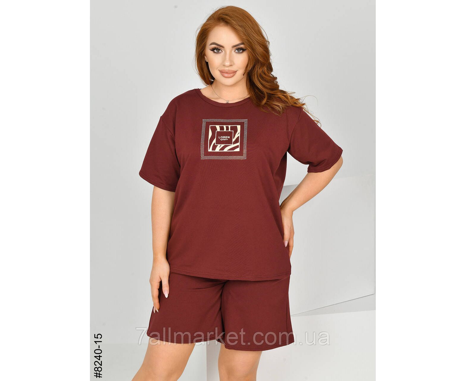 Жіночий спортивний костюм з турецької двонитки. Верх – футболка,прикрашена камінням; низ – шорти з комфортним широким поясом. Зручна модель на літо.
