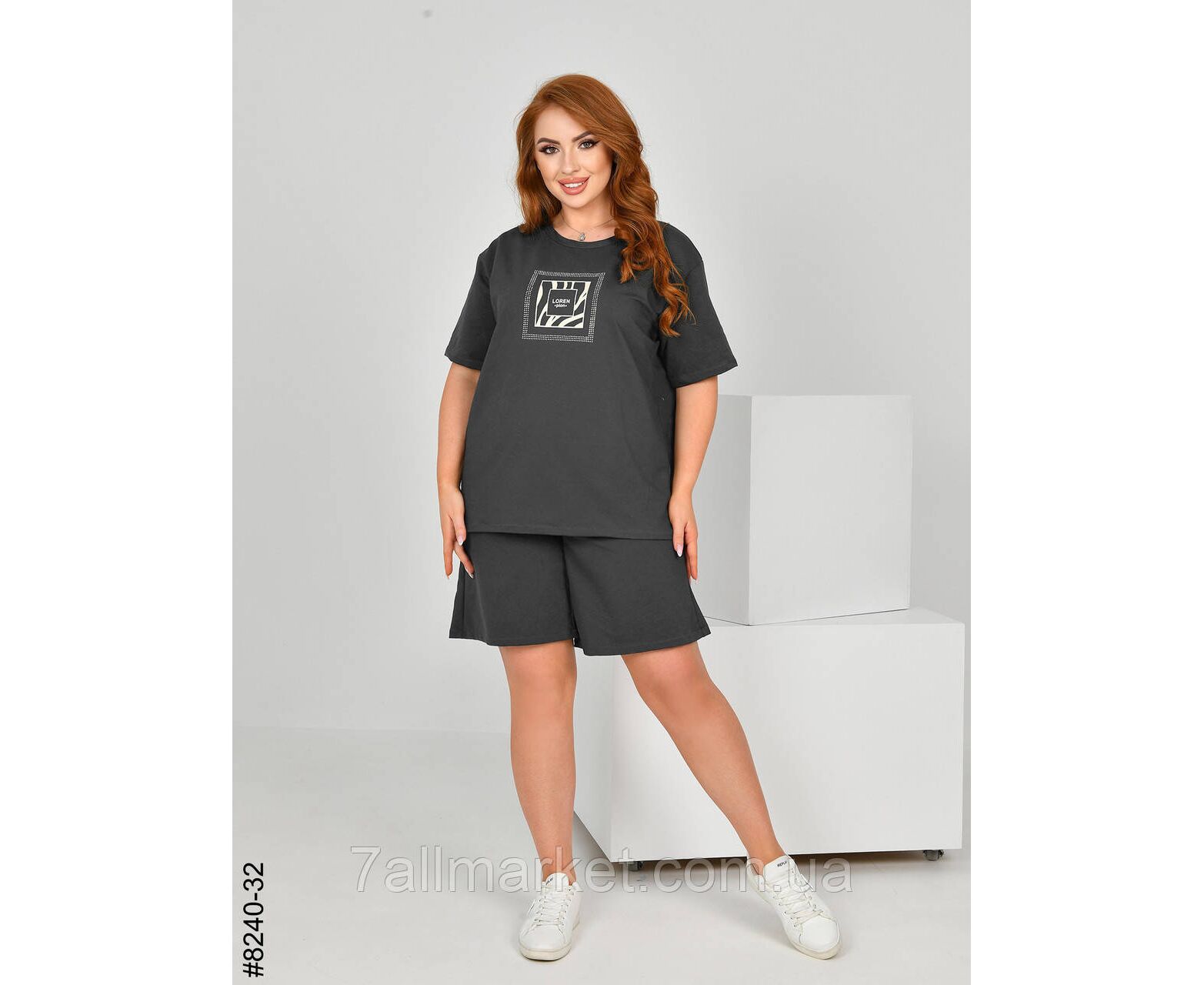 Жіночий спортивний костюм з турецької двонитки. Верх – футболка,прикрашена камінням; низ – шорти з комфортним широким поясом. Зручна модель на літо.