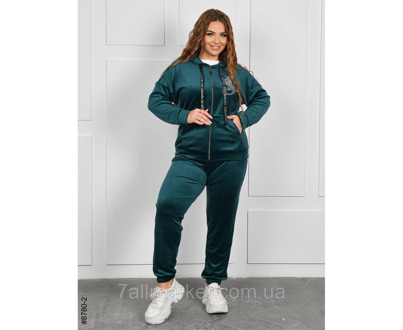 Женский велюровый спортивный костюм в батальных размерах. Верх - кофта на молнии с капюшоном, дополнена стильным рисунком из страз; низ - штаны на манжете-резинке.