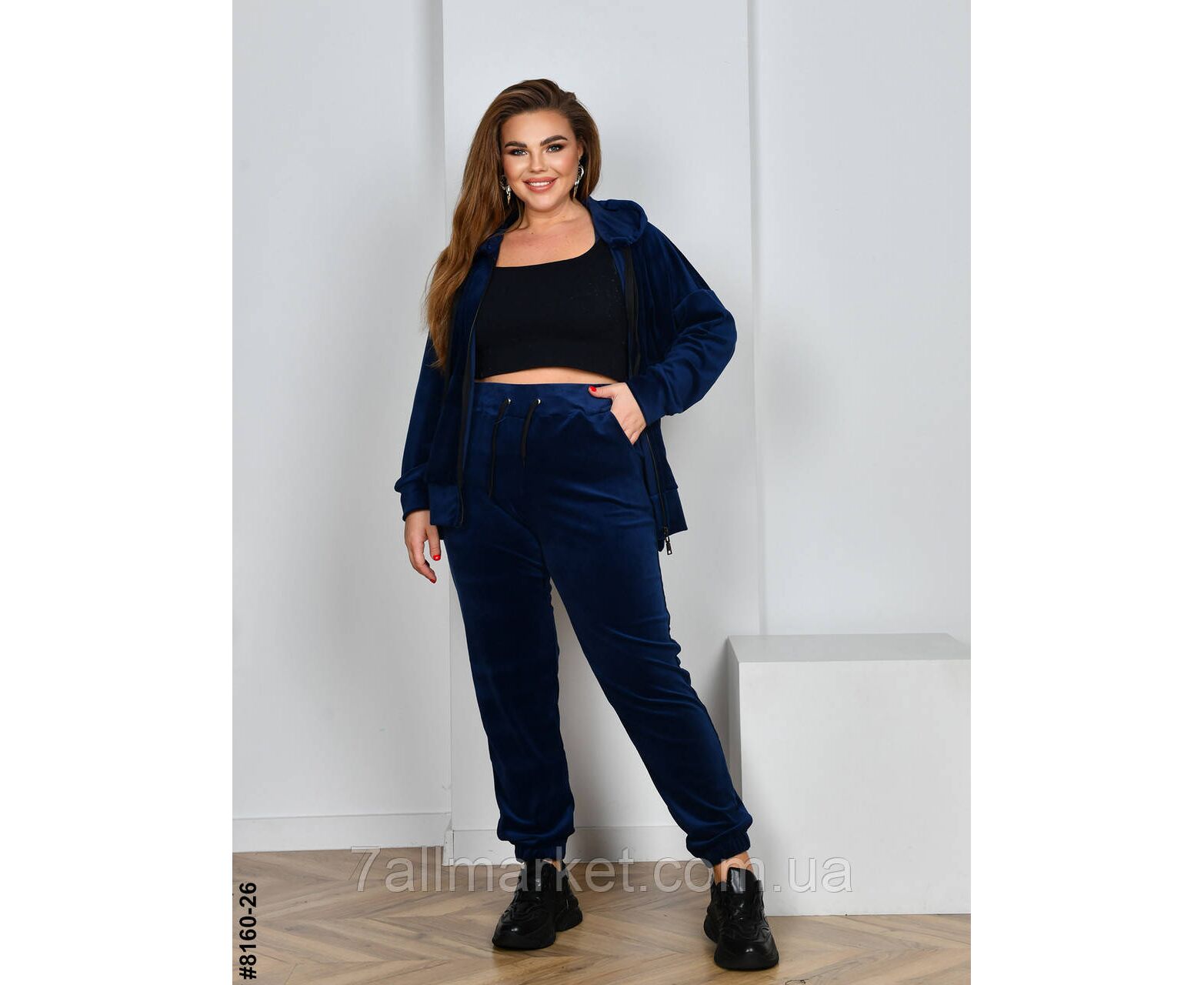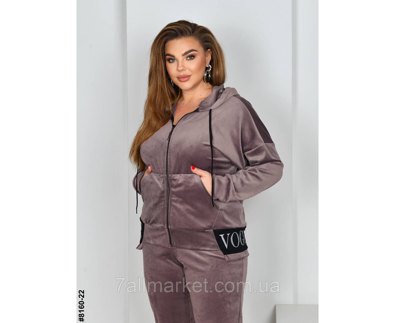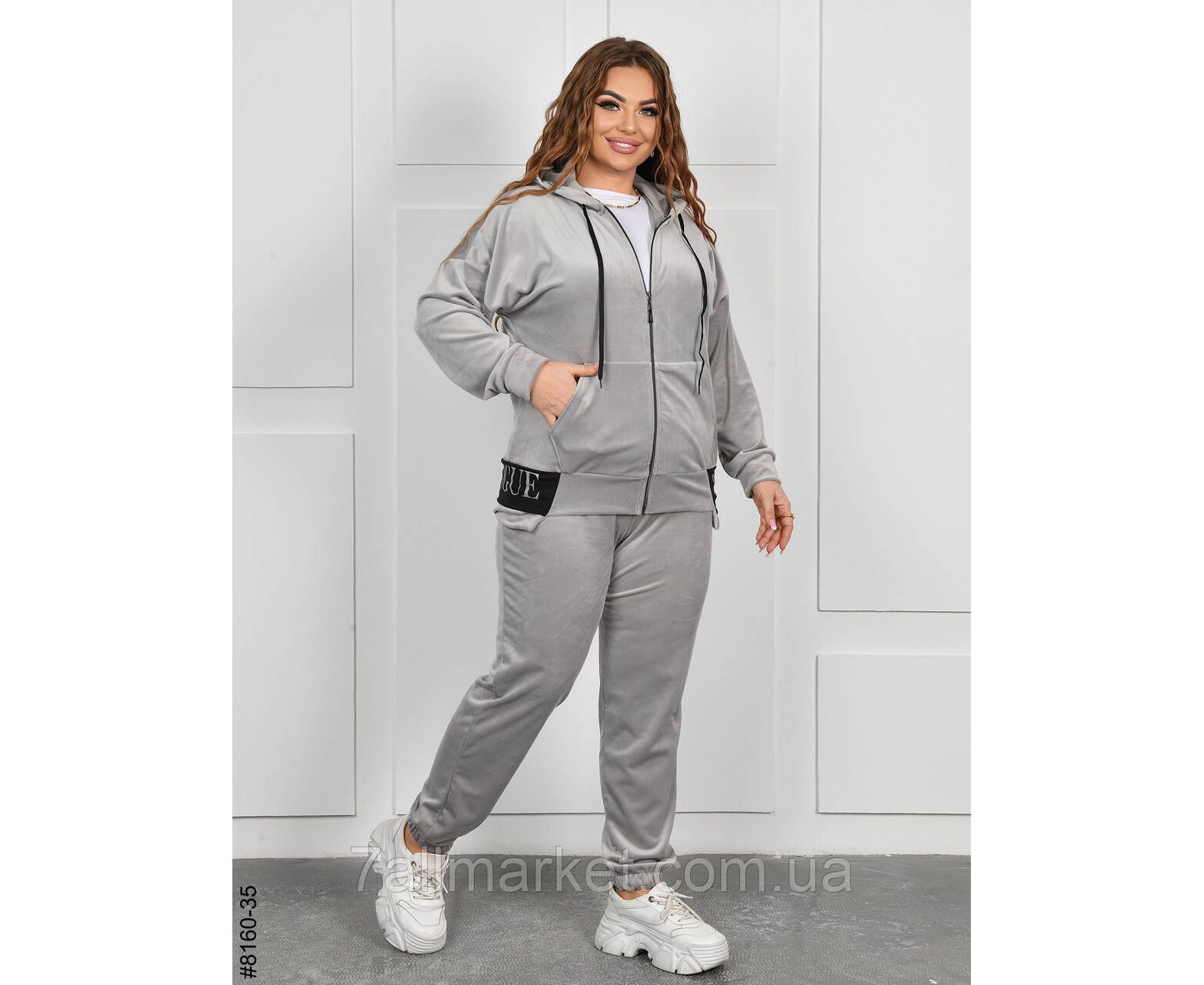 Женский велюровый спортивный костюм в батальных размерах. Верх – худи с капюшоном на молнии; оснащен манжетами на рукавах. Низ – штаны на широкой резинке, с боковыми карманами и резинками на штанинах.
