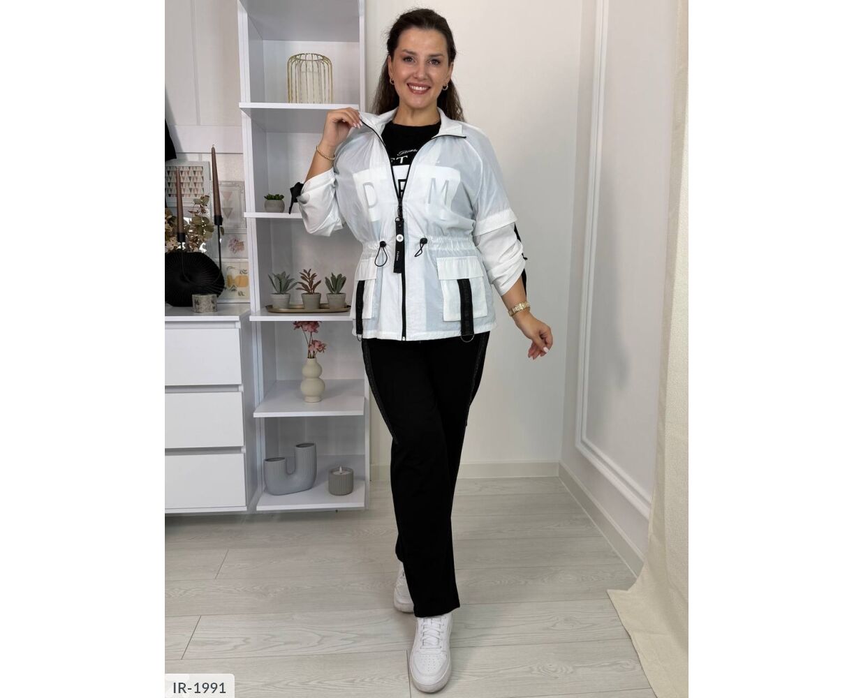 Ветровка на молнии с карабином, по бокам кармана с клапанами и лампасами с полукольцами, талия на резинке с фиксаторами, можно регулировать объем талии. На рукавах лампасы с регуляторами длины. Костюм: кофта с коротким рукавом, на груди качественный накат, брюки по бокам лампасы, на резинке по бокам кармана.
