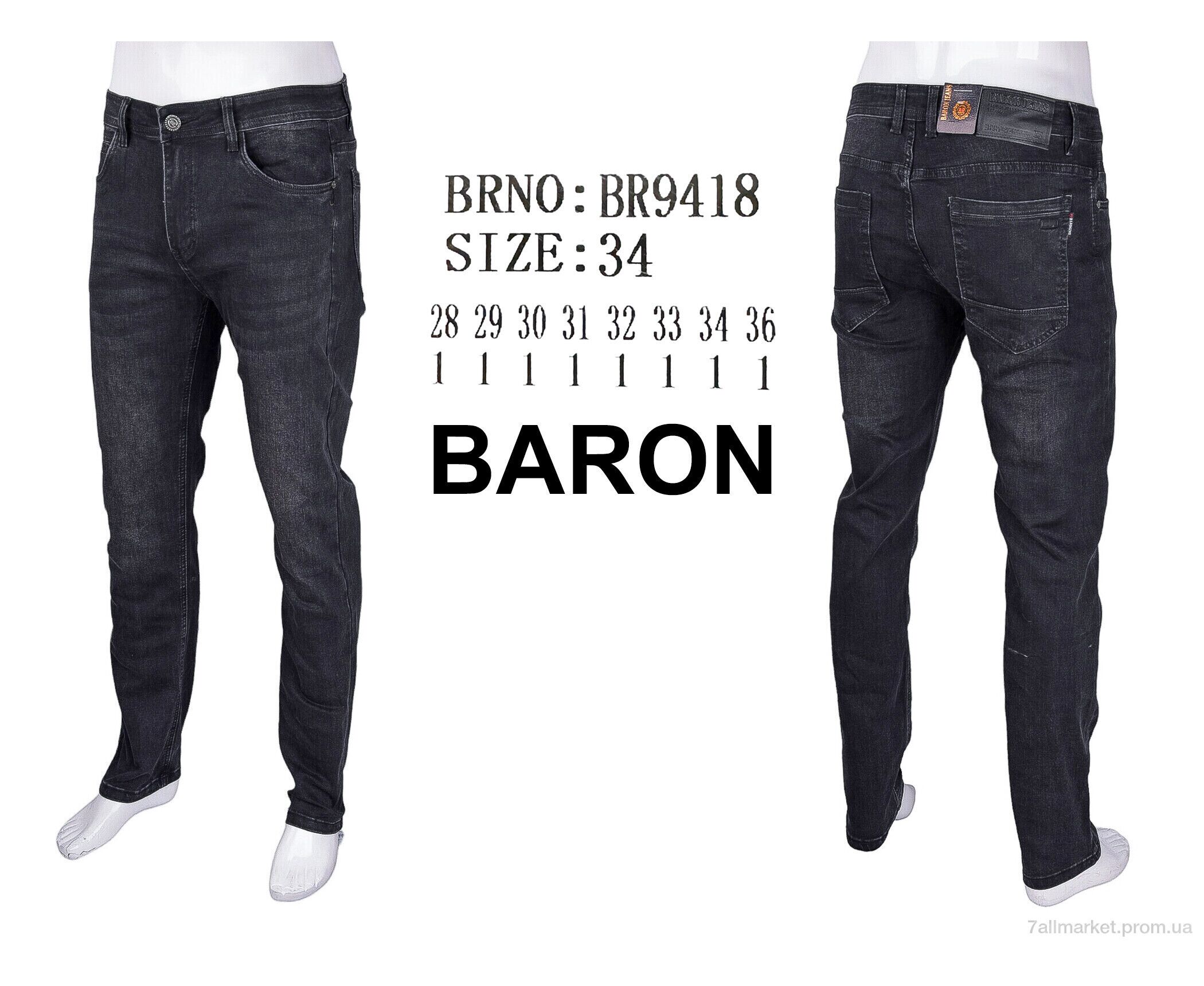 Джинси чоловічі Весна/осінь BR9418 (8 шт. р.сітка28-36) "Baron" недорого оптом від прямого постачальника