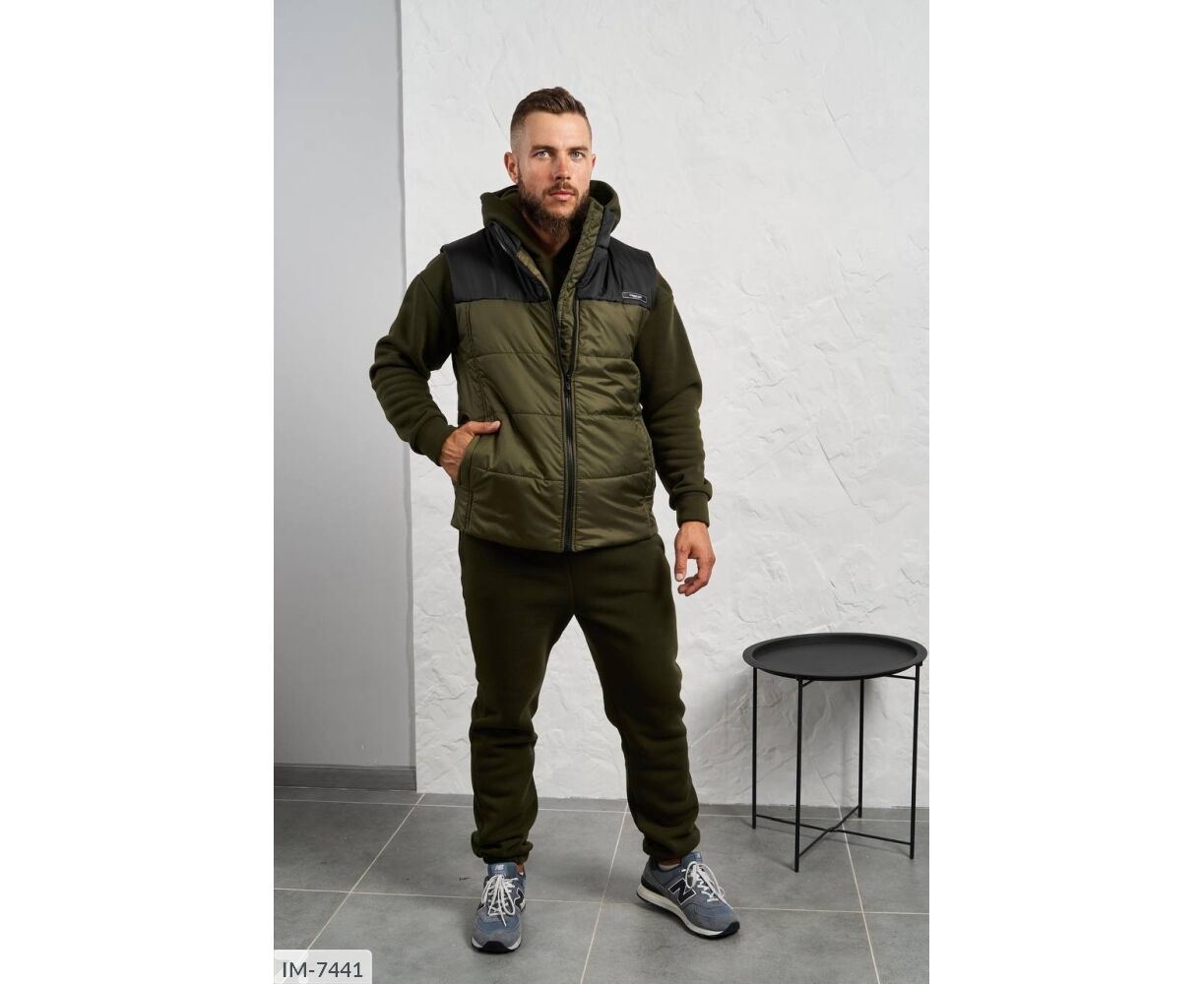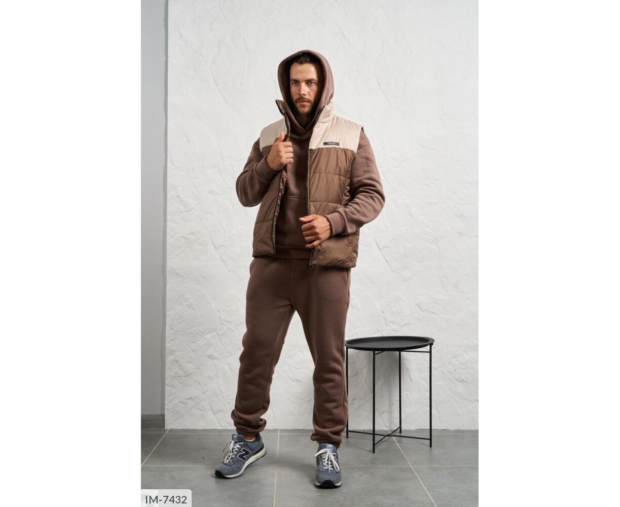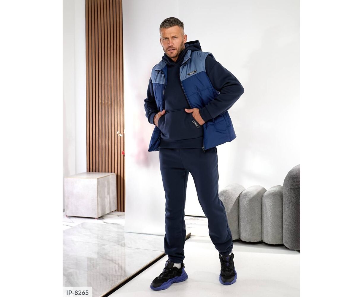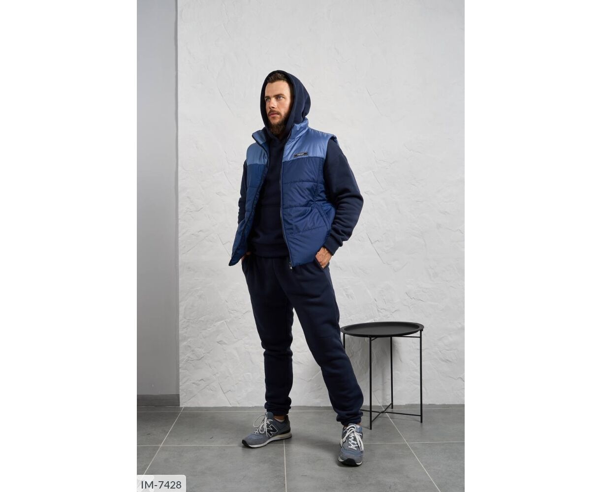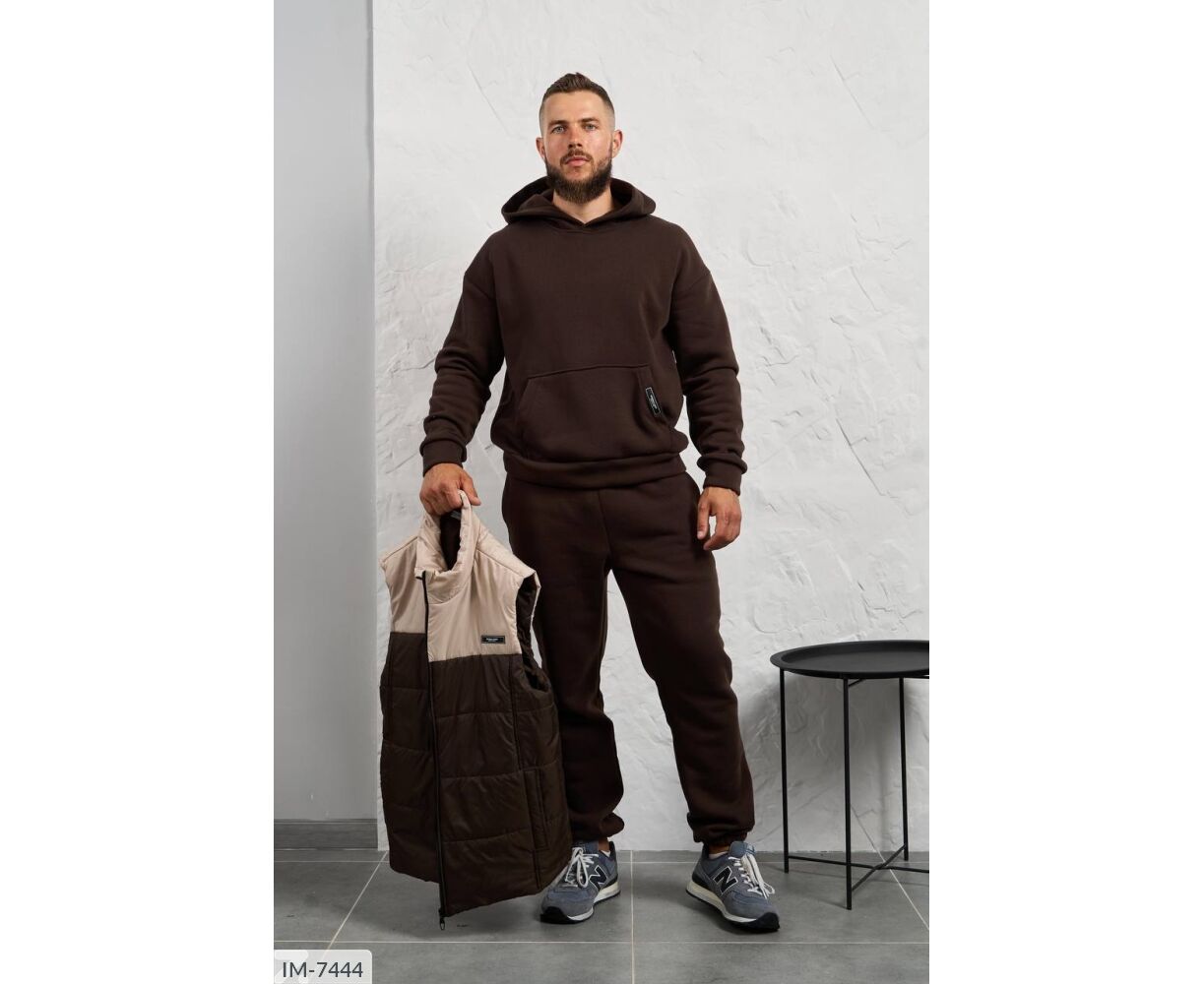 Костюм з жилетом, чоловічий, теплий з кишенею - кенгуру збоку прикрашен нашивкою, з капюшоном. Рукава на манжетах. Штани - висока посадка з кишенями, і знизу на гумці. Жилет